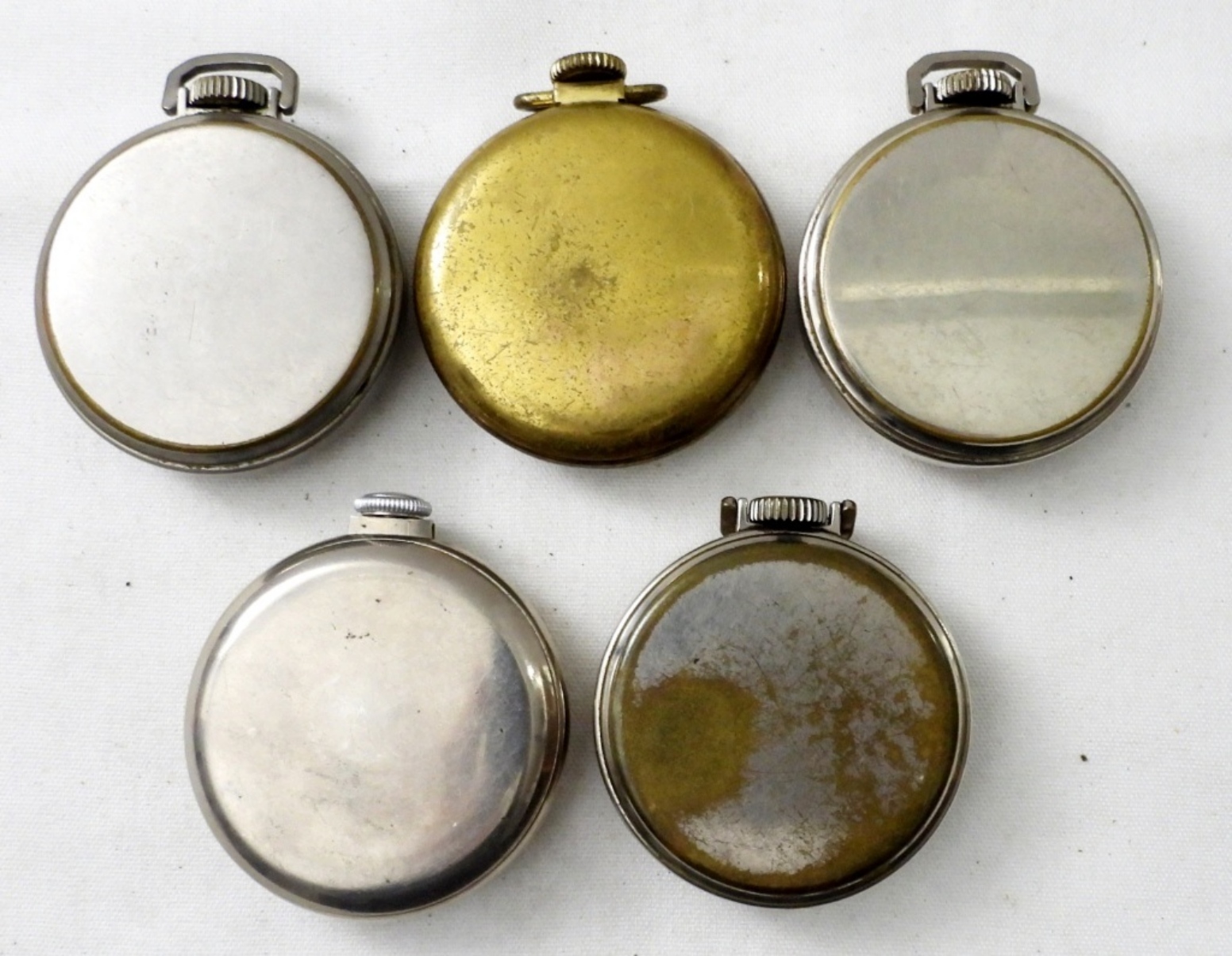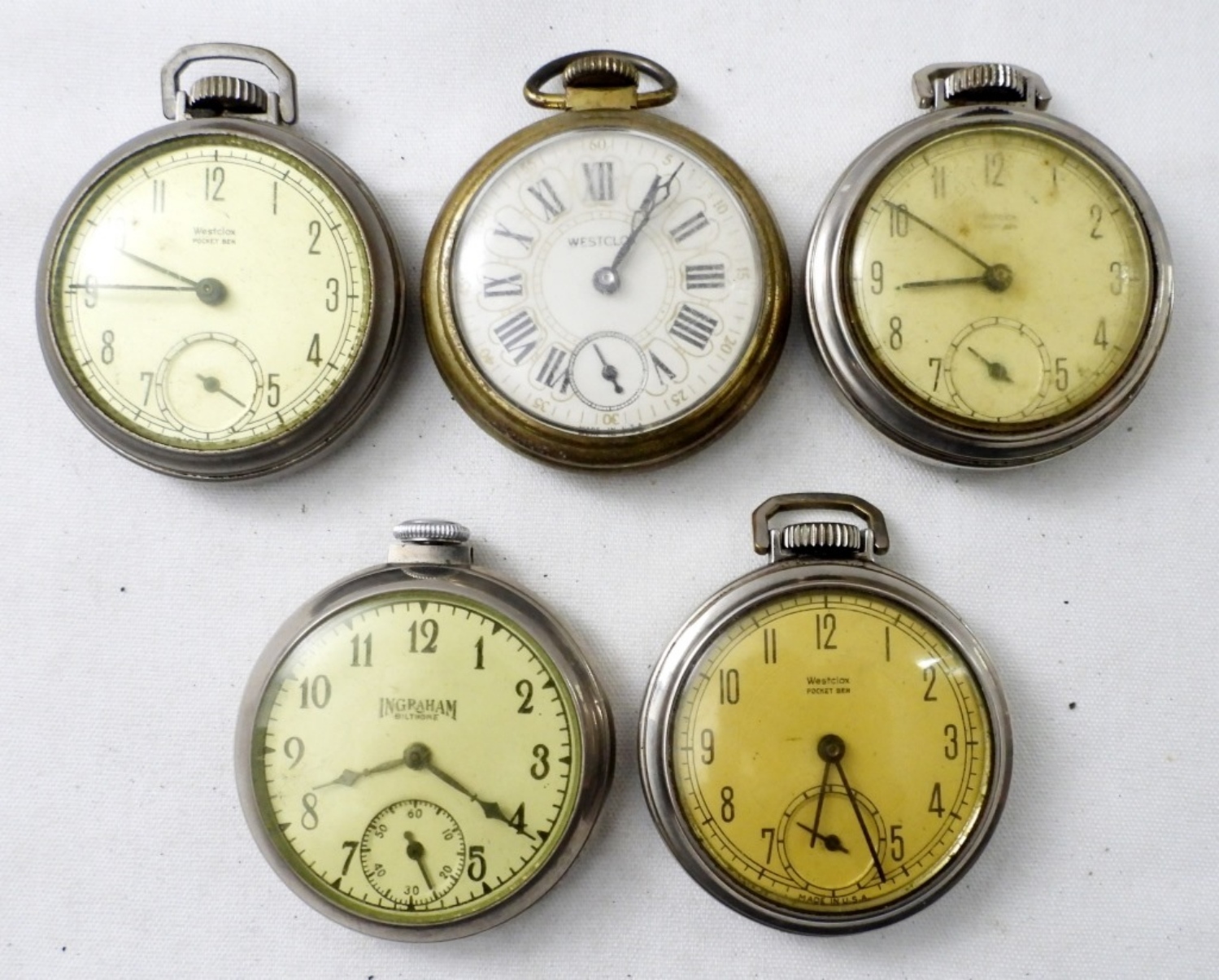 (5) VINTAGE MENS POCKET WATCH. (3) WESTCLOX POCKET BEN, (1) WESTCLOX AND (1) INGRAHAM. THEY ALL WIND UP . NOT TESTED AS TO KEEPING TIME
