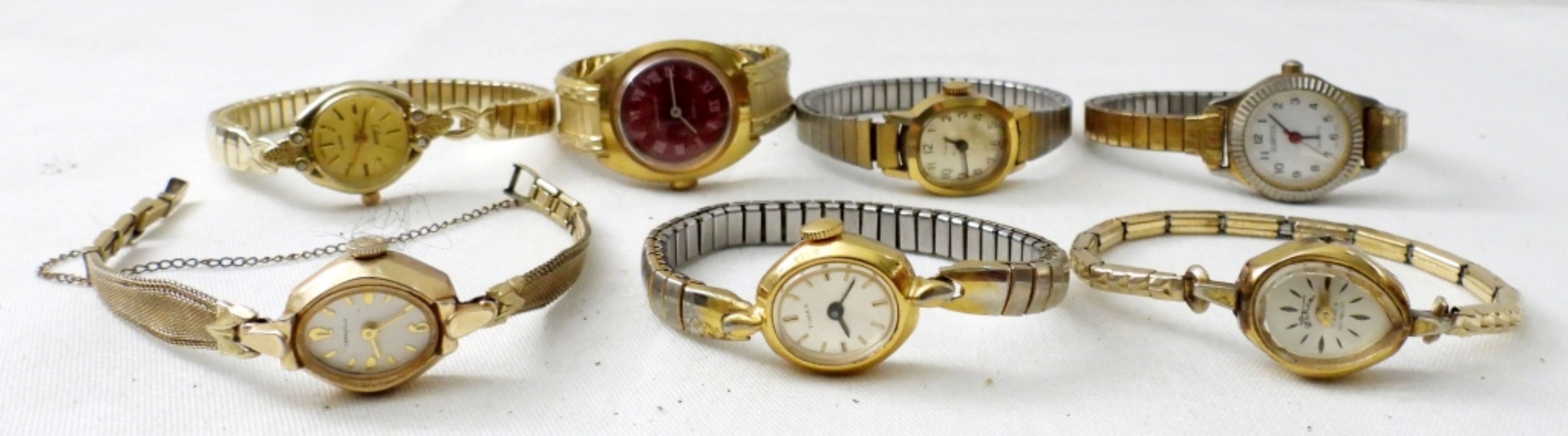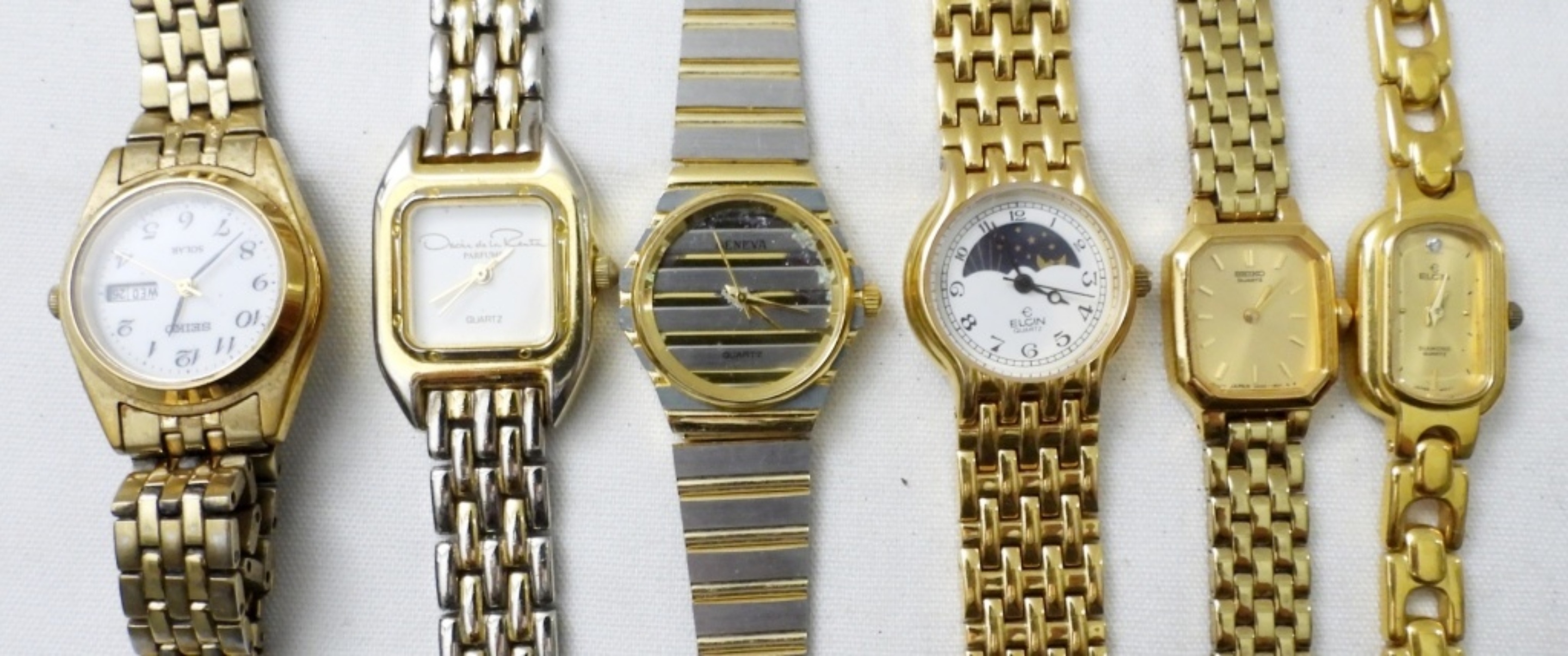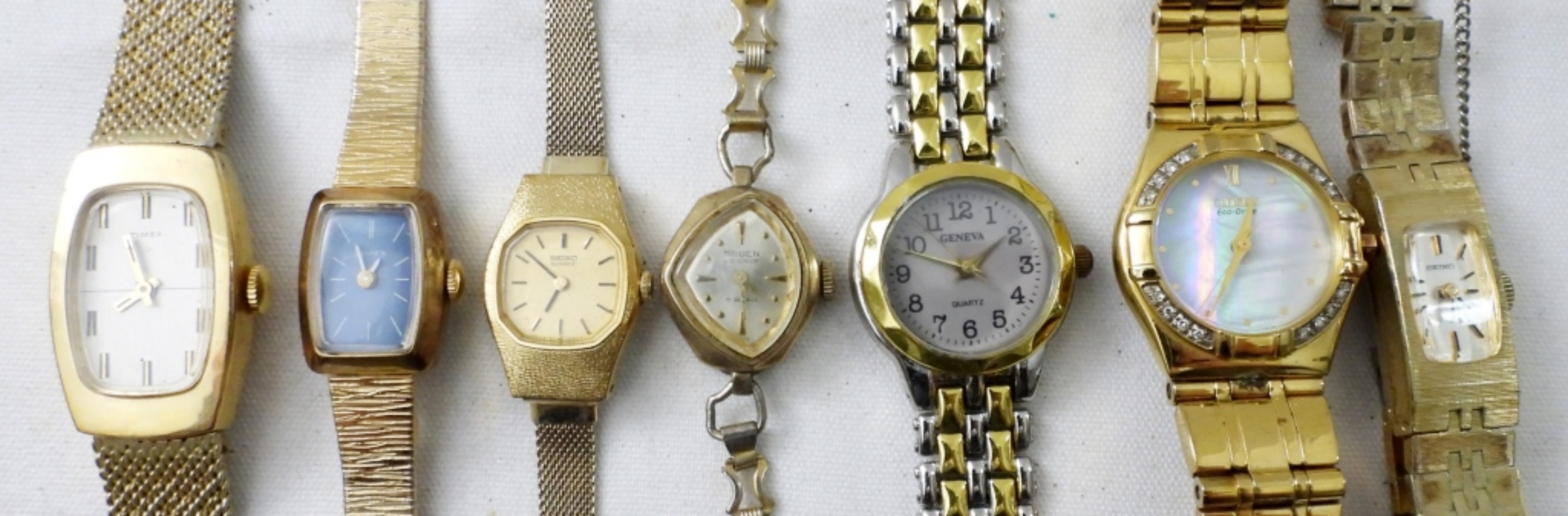 (20) MODERN GOLD TONE LADIES FASHION WATCHES, QUARTZ, GENEVA, GRUEN & MORE. (6) STRETCHY BANDS, (14) CLASP BANDS. NOT TESTED AS TO WORKING OR NOT