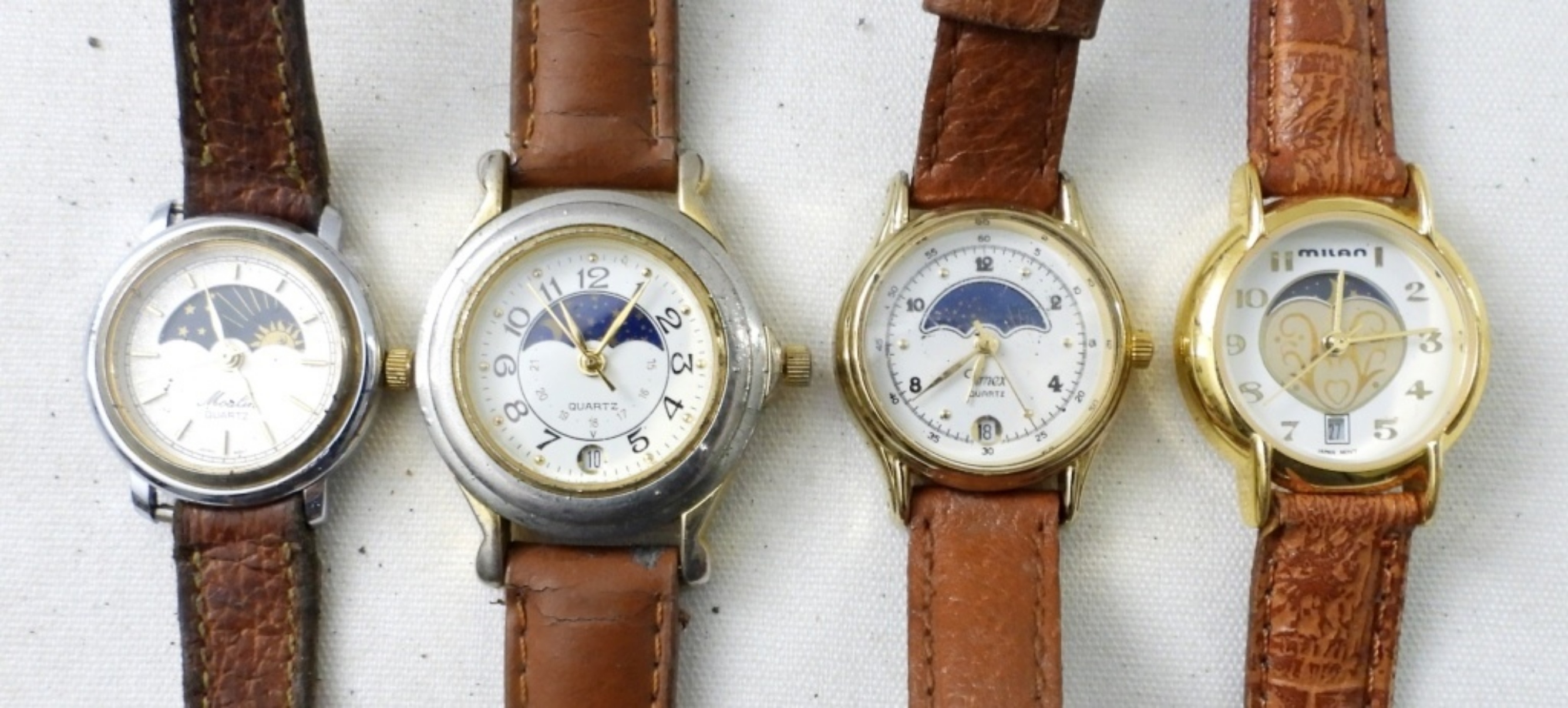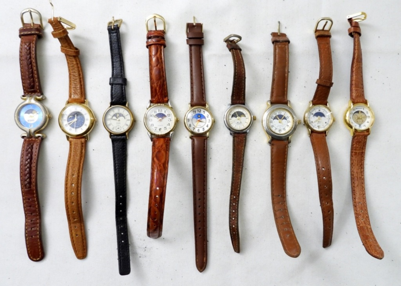 (9) DAY NIGHT LADIES WATCHES , LEATHER BANDS . ASSORTED COLORS. QUARTZ,TIMEX 7 MORE