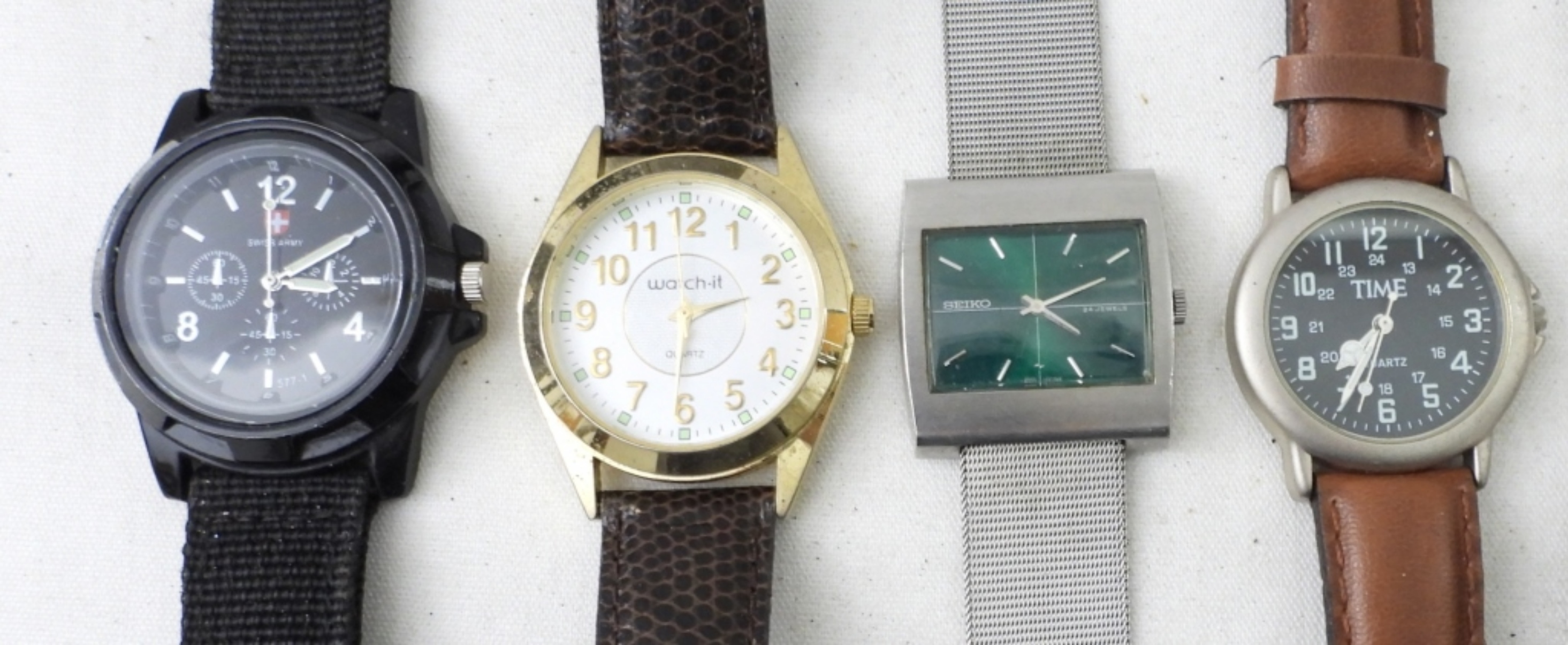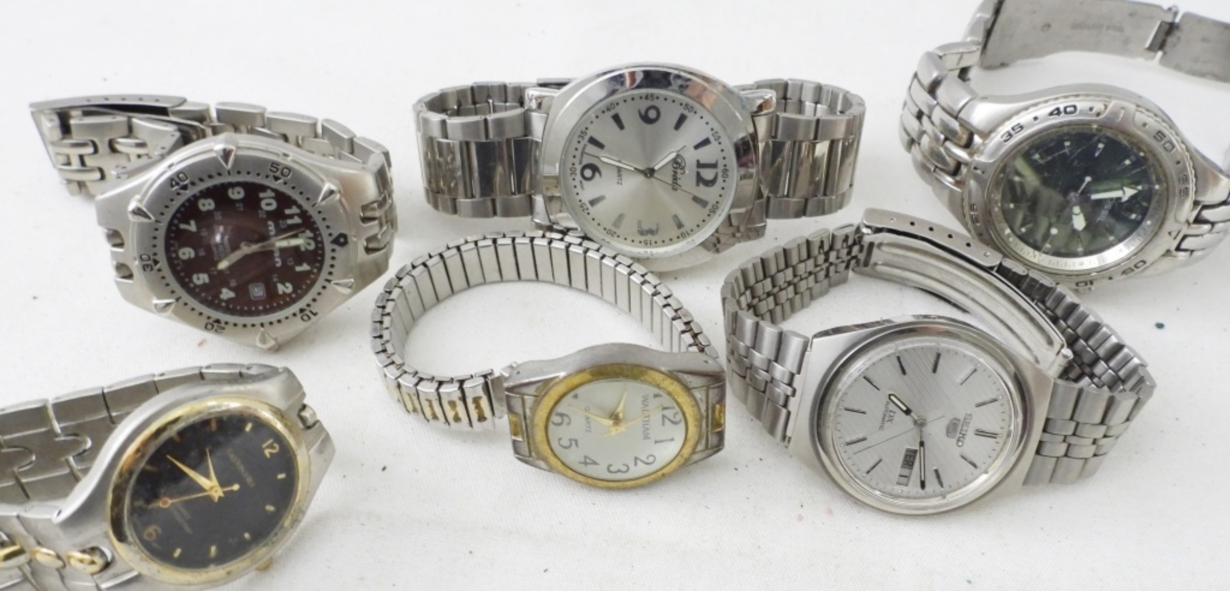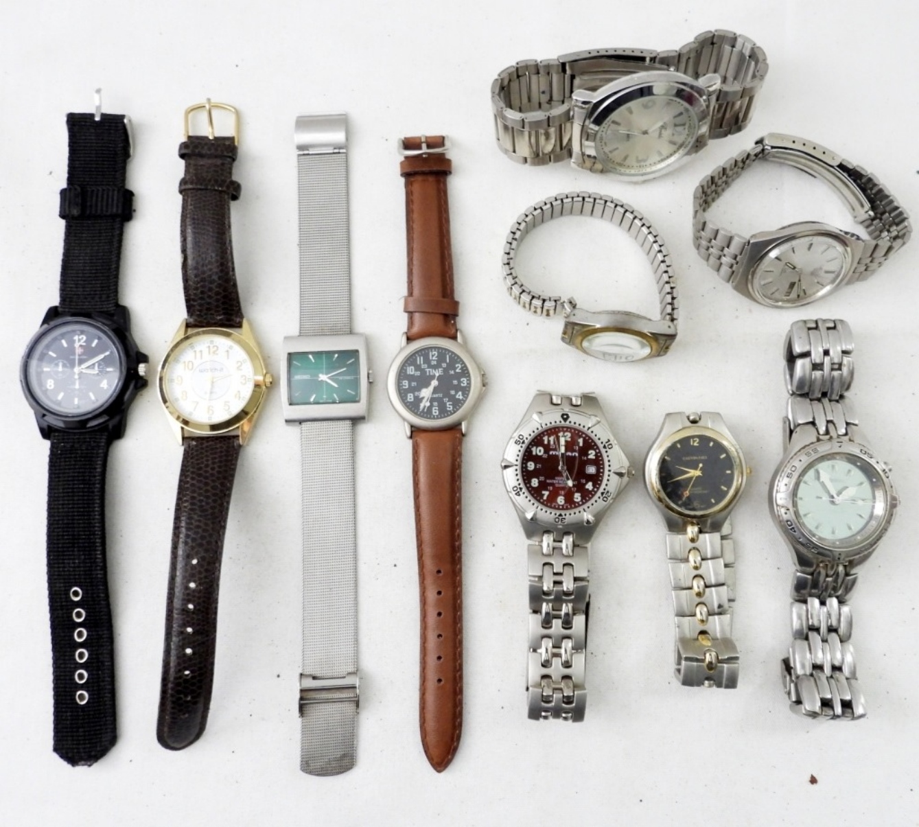 (10) MENS FASHION WATCHES. QUARTZ,WALTHAM, SEIKO AND MORE. ASSORTED COLOR FACES AND BANDS. NOT TESTED AS TO WORKING OR NOT