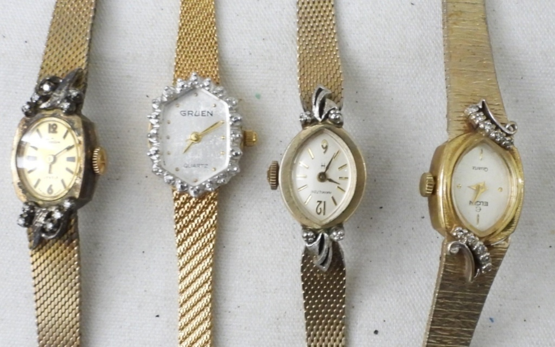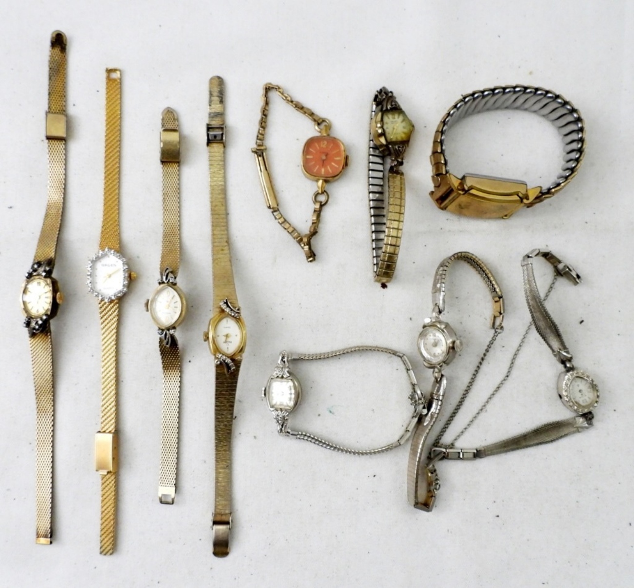 (10) VINTAGE LADIES WATCHES. BAYLOR,GRUEN,BULOVA & MORE . (7) GOLD TONE ,(3) SILVER TONE. NOT TESTED AS TO WORKING OR NOT