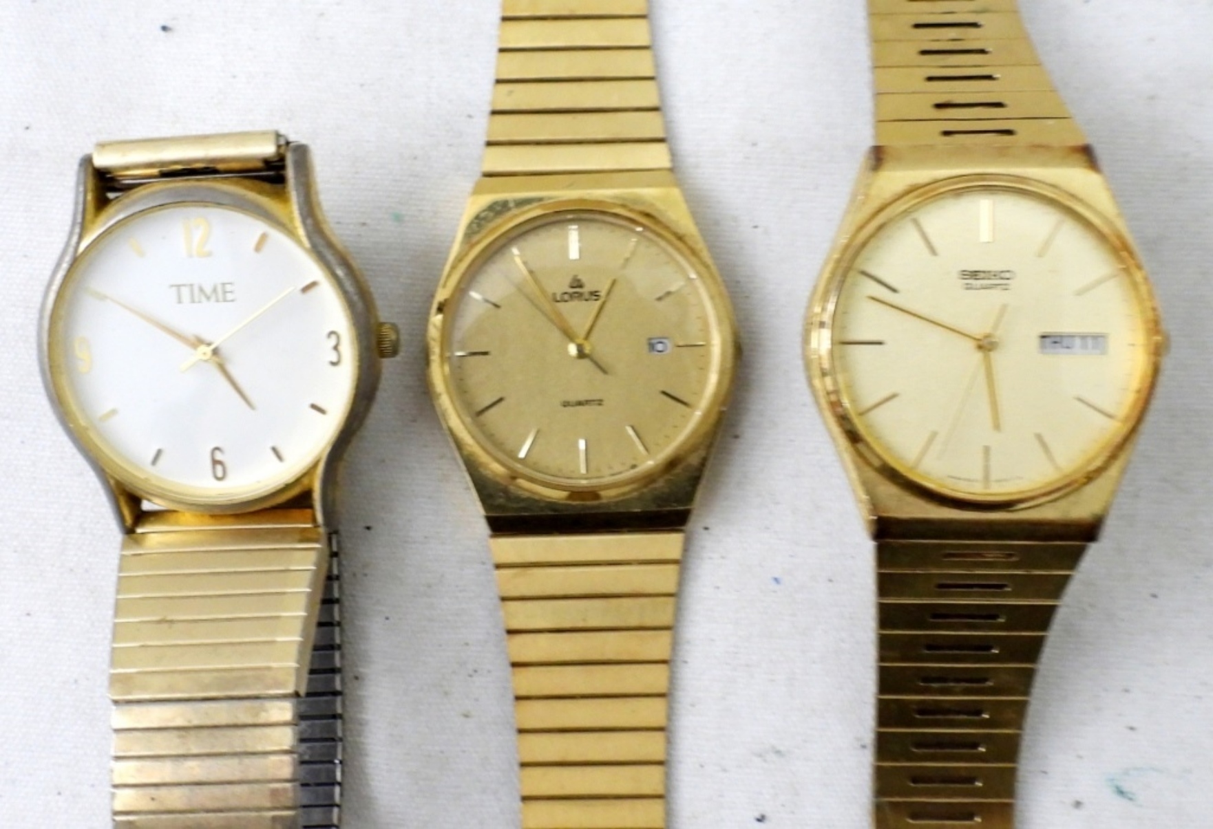 (5) MENS GOLD TONE WATCHES.SEIKO, TIMEX & MORE .(2) STRETCHY BANDS , (3) CLASP BANDS