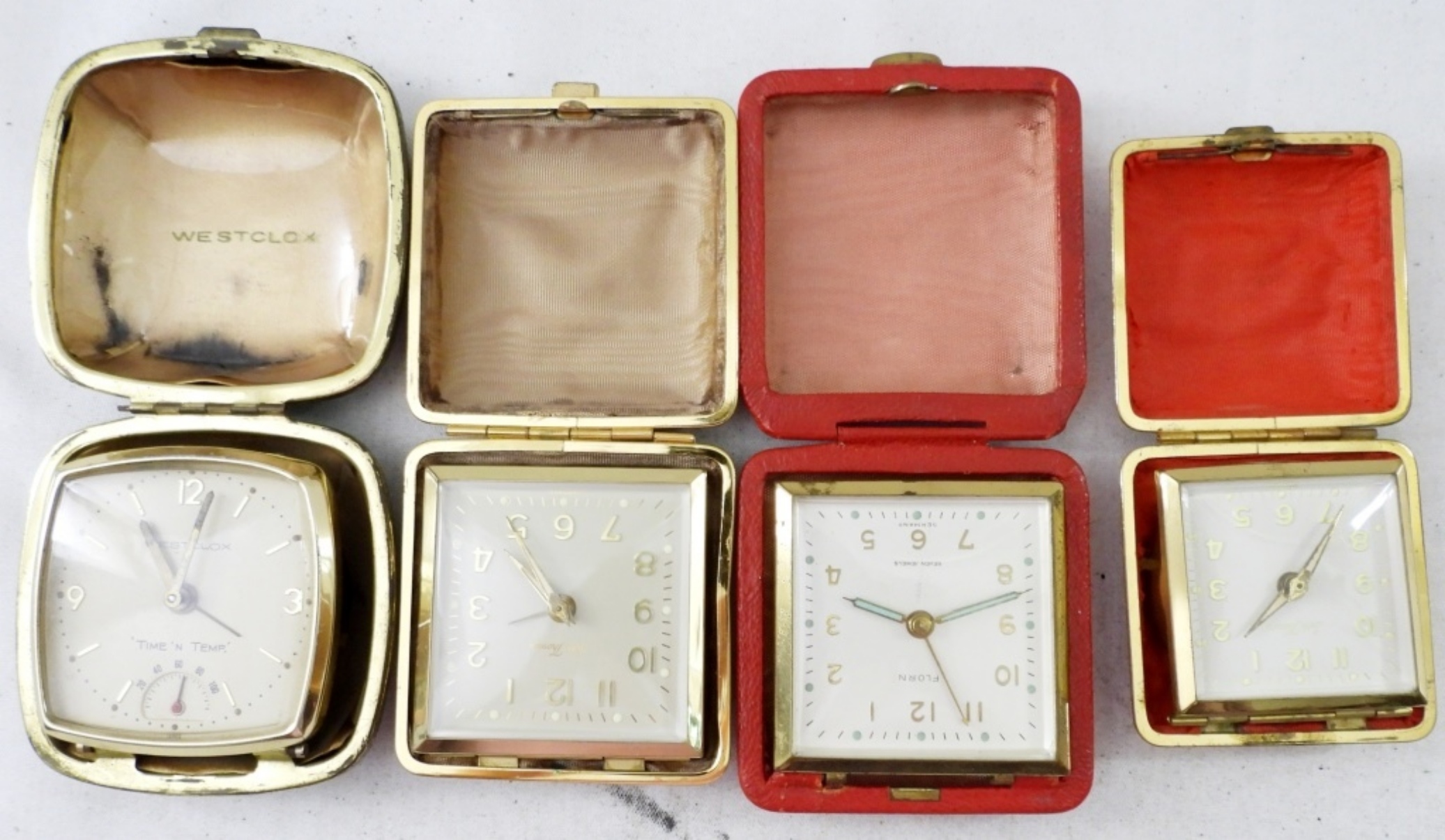 (4) TRAVEL ALARM CLOCKS . WESTCLOX ,SETH THOMAS & MORE. VARIOUS COLORS AND SIZES. NOT TESTED AS TO WORKING OR NOT