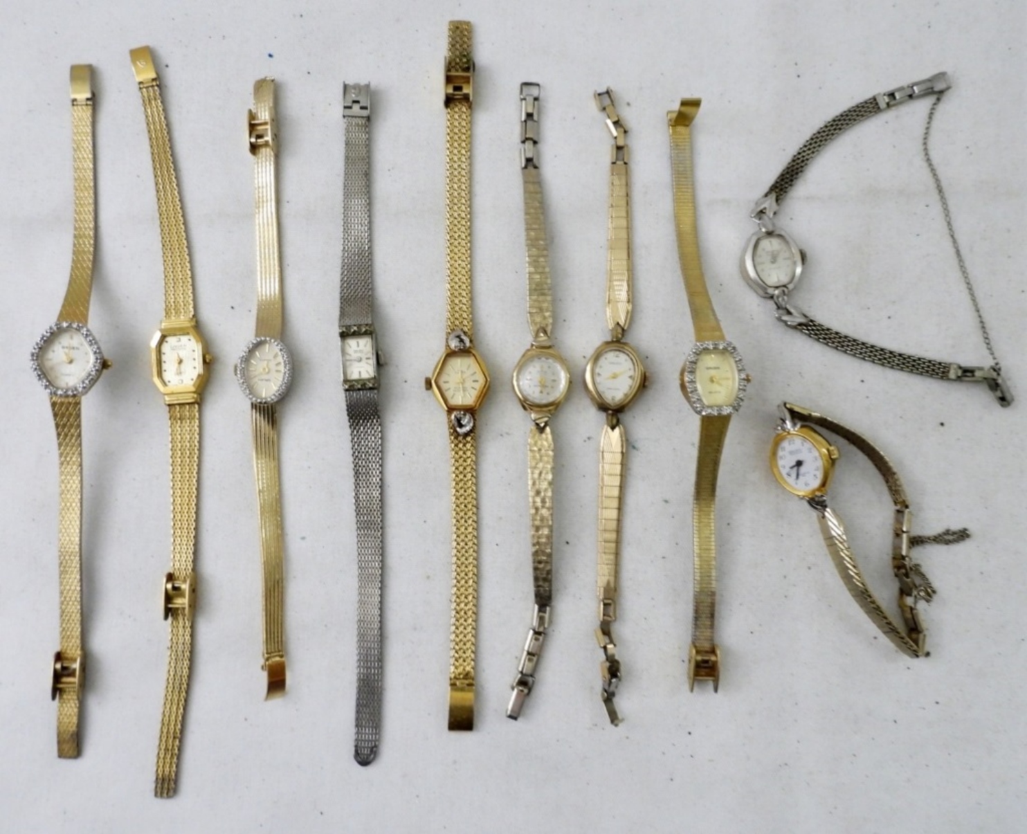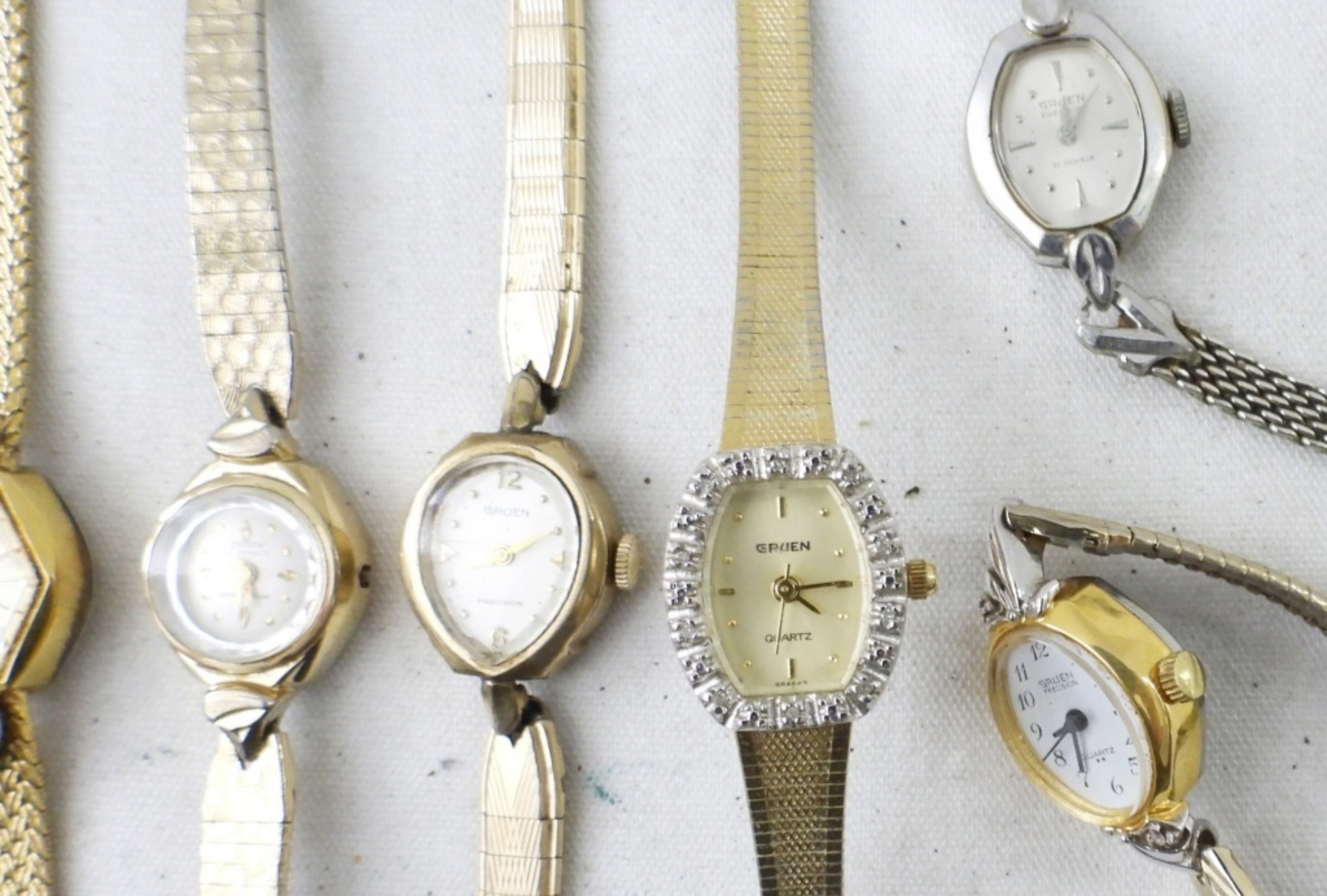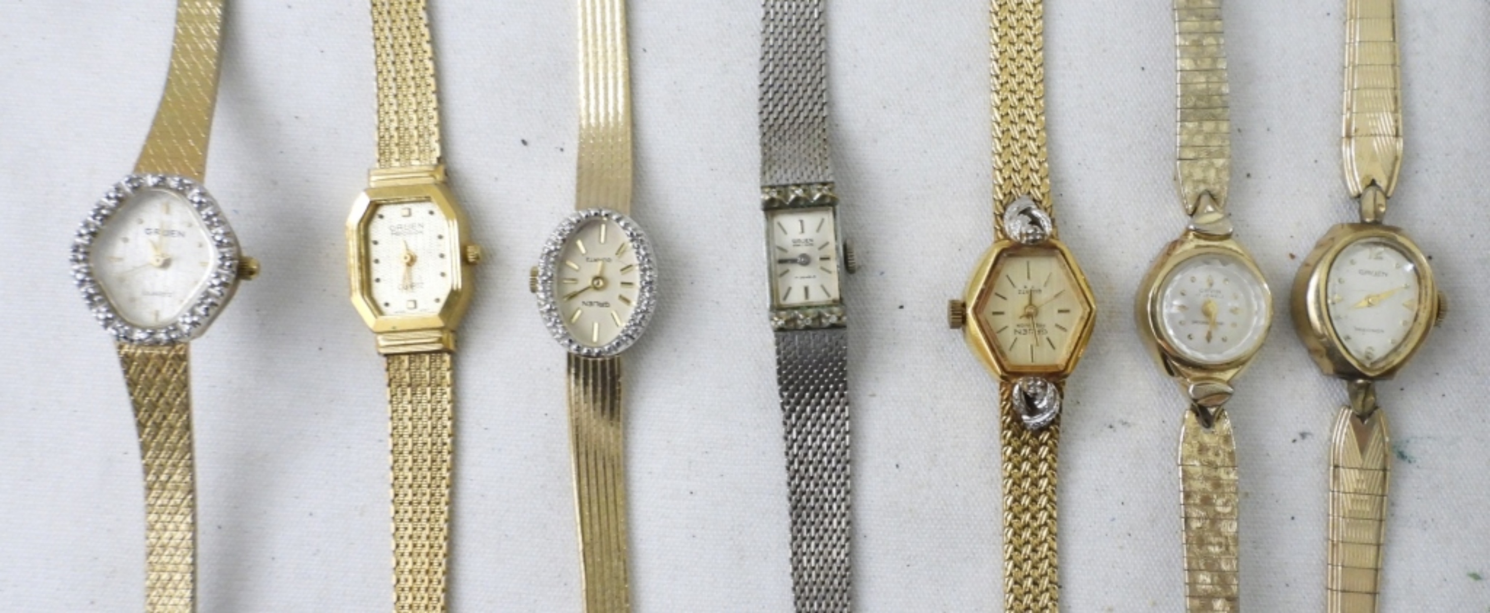 (10) GRUEN LADIES FASHION WATCHES.(8) GOLD TONE ,(2) SILVER TONE . ASSORTED STYLES ALL CLASP STYLE BANDS. NOT TESTED AS TO WORKING OR NOT