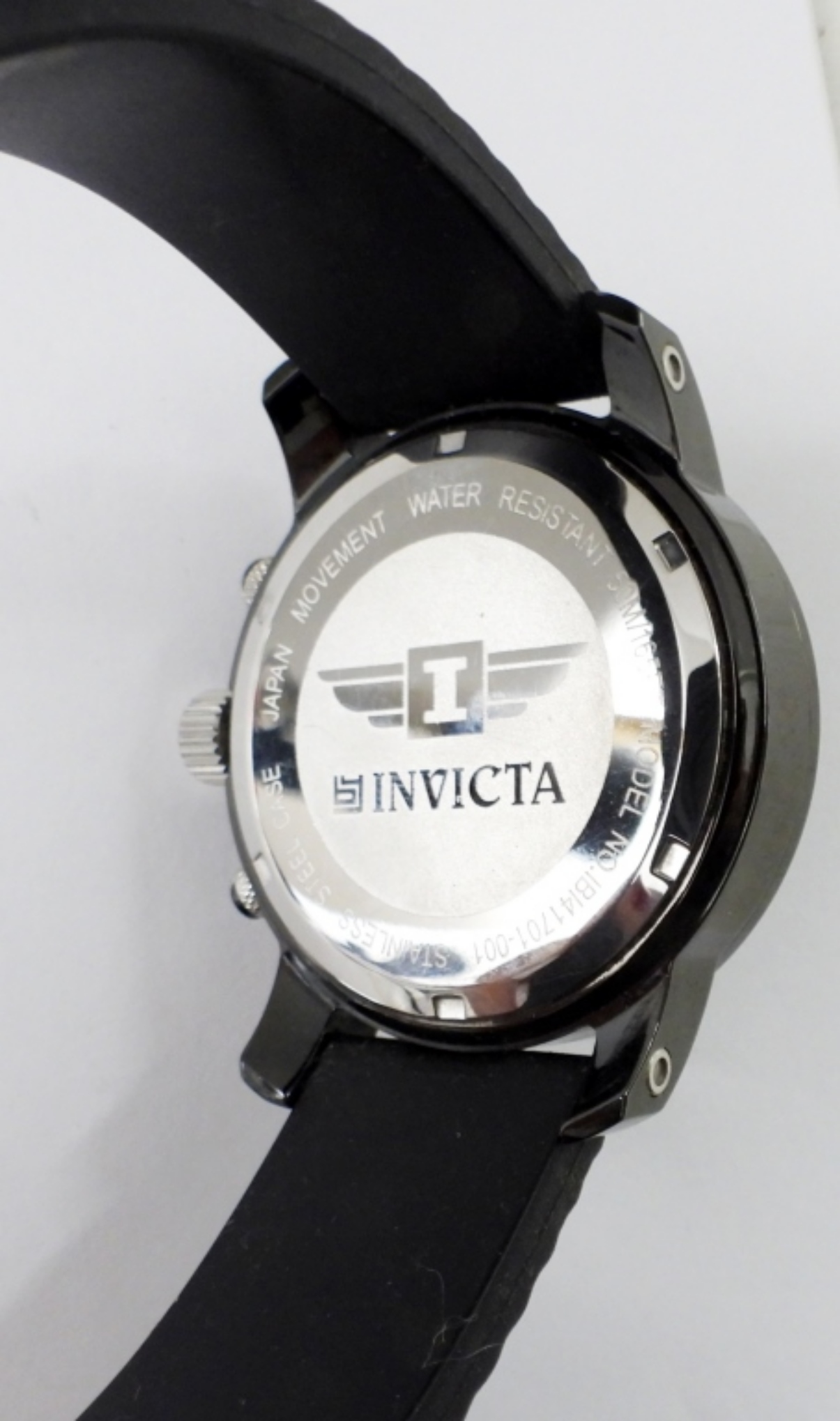 UNTESTED INVICTA MENS BLACK CHRONOGRAPH WATCH, RUBBER BLACK BAND, TRIFOLD CLASP