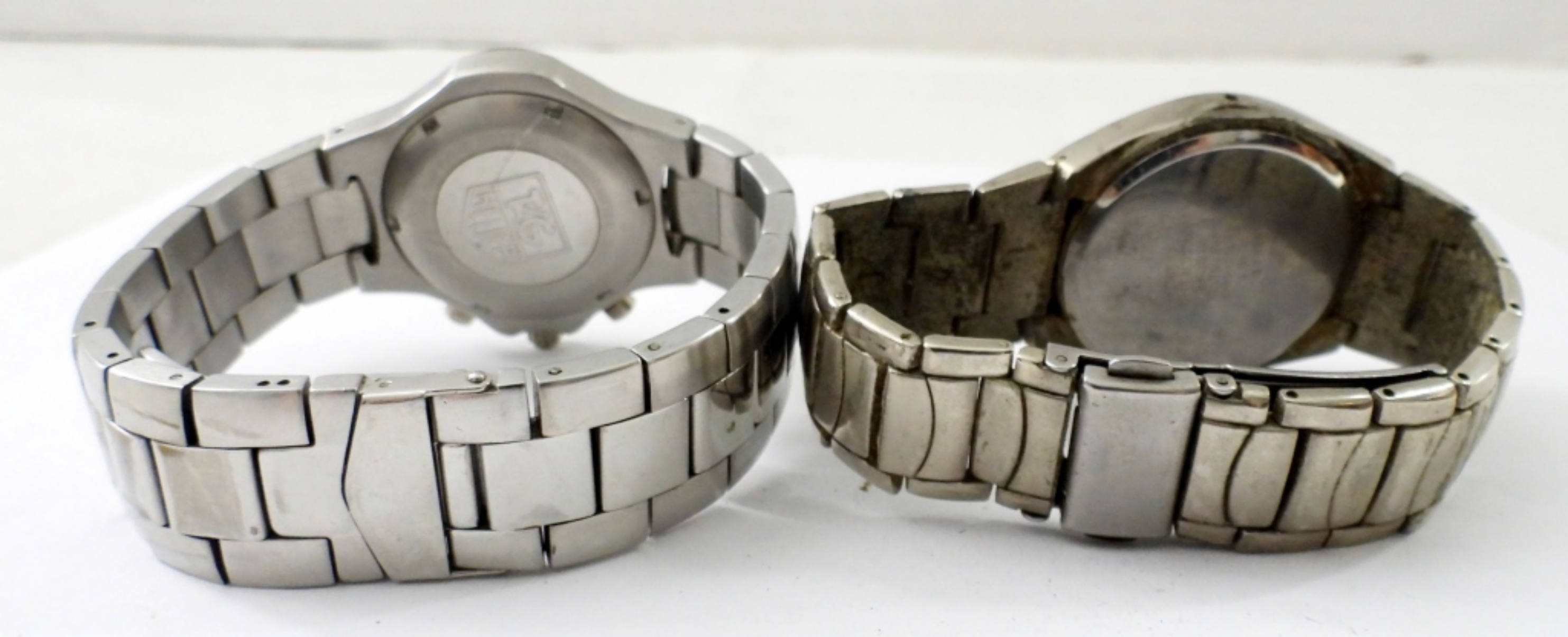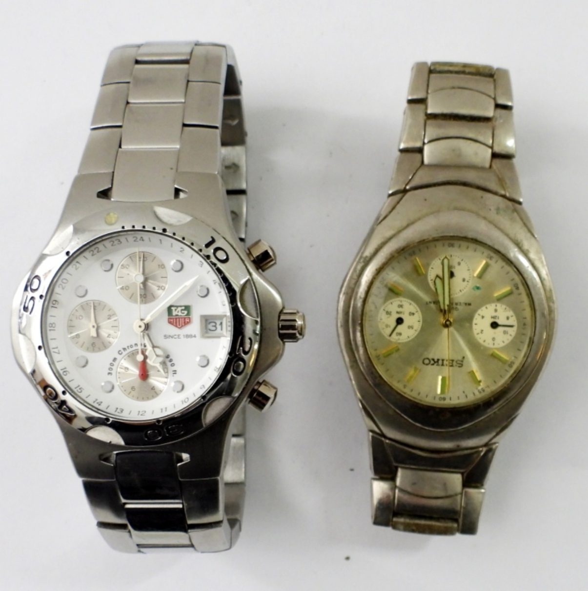 UNTESTED (2) SEIKO AND HEUER CHRONOGRAPH SILVERTONE MENS WATCHES, FOLDING CLASP, METAL LINK BANDS