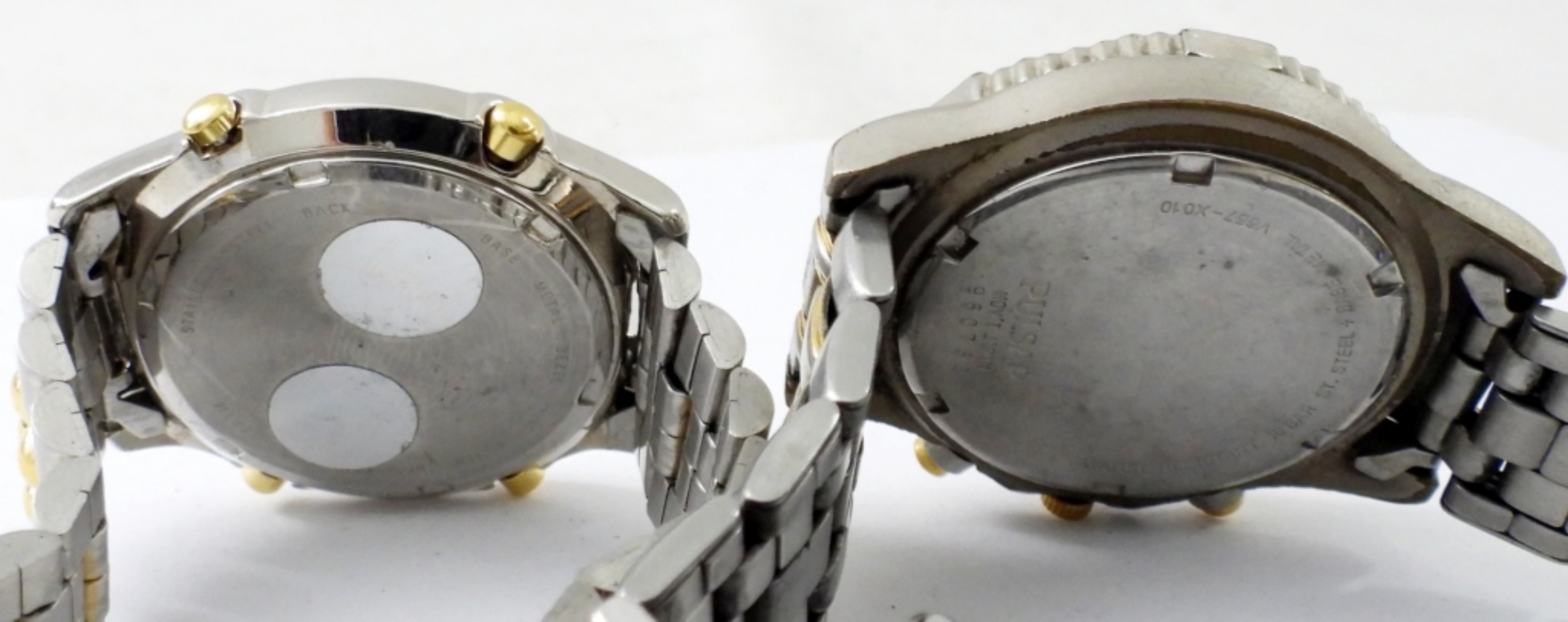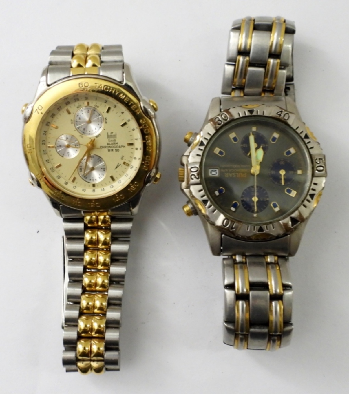 UNTESTED (2) DUMONT & PULSAR CHRONOGRAPH MENS WATCHES, TWO TONE, FOLDING CLASP, METAL LINK BAND, PULSAR DATE & CHRONOGRAPH