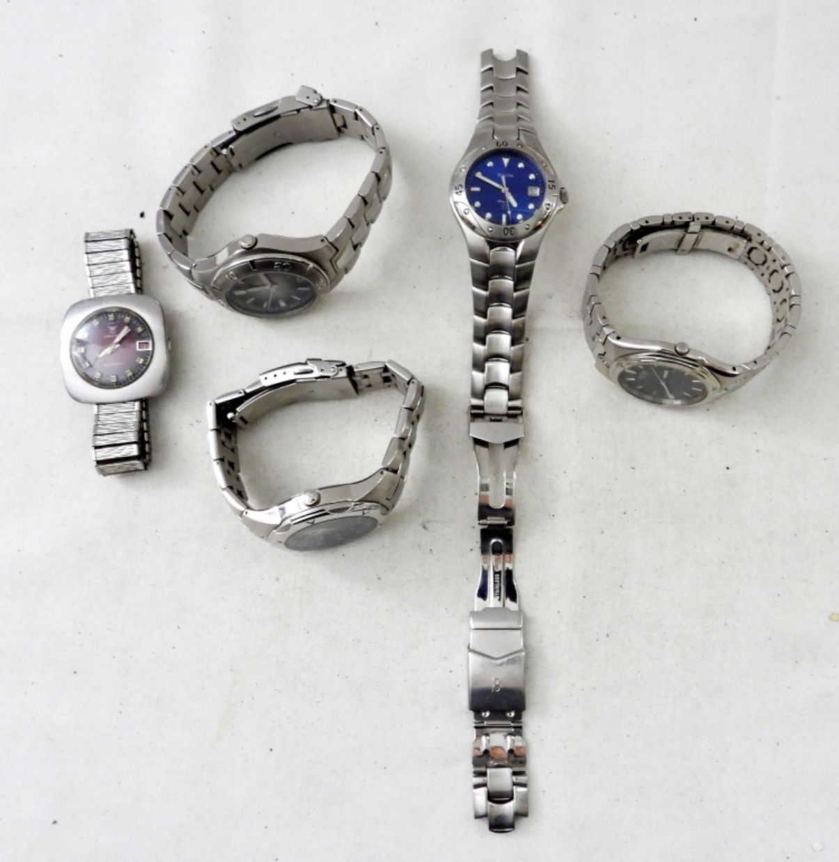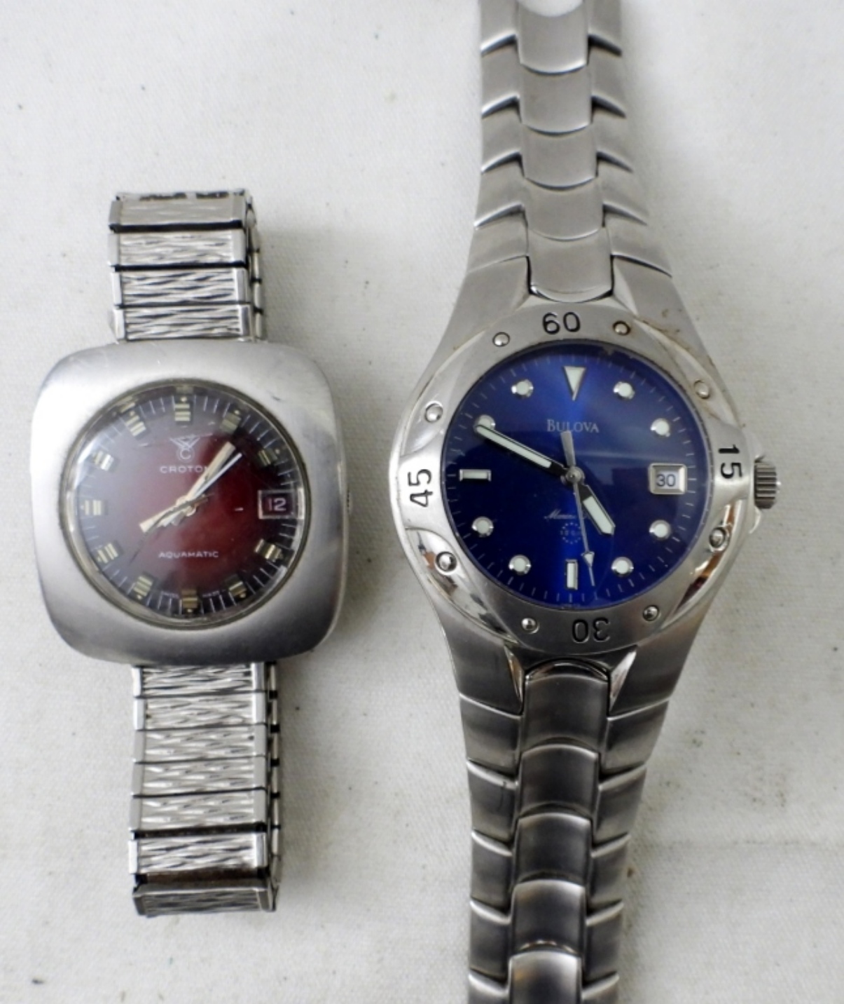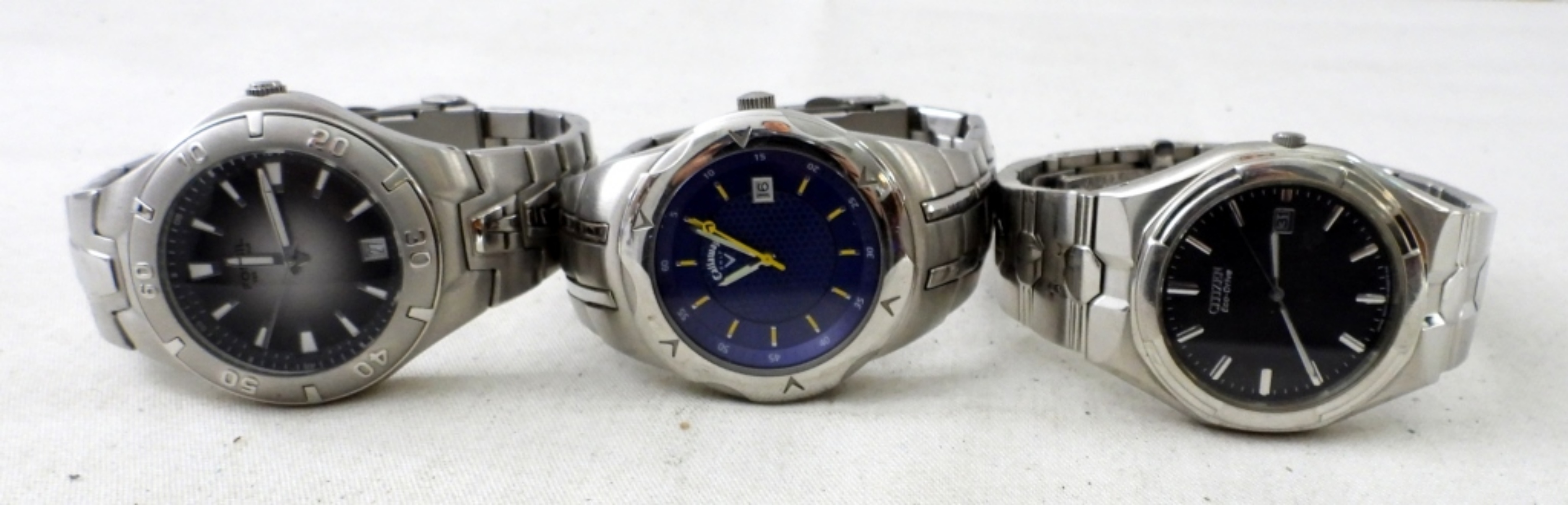 UNTESTED (5) DATE WATCHES SILVERTONE, BULOVA (HAS BROKEN BAND), FOSSIL, CALLAWAY GOLF, CITIZEN, CROTON (HAS ELASTIC BAND) ALL OTHERS HAVE METAL LINK BANDS, FOLDING CLASP