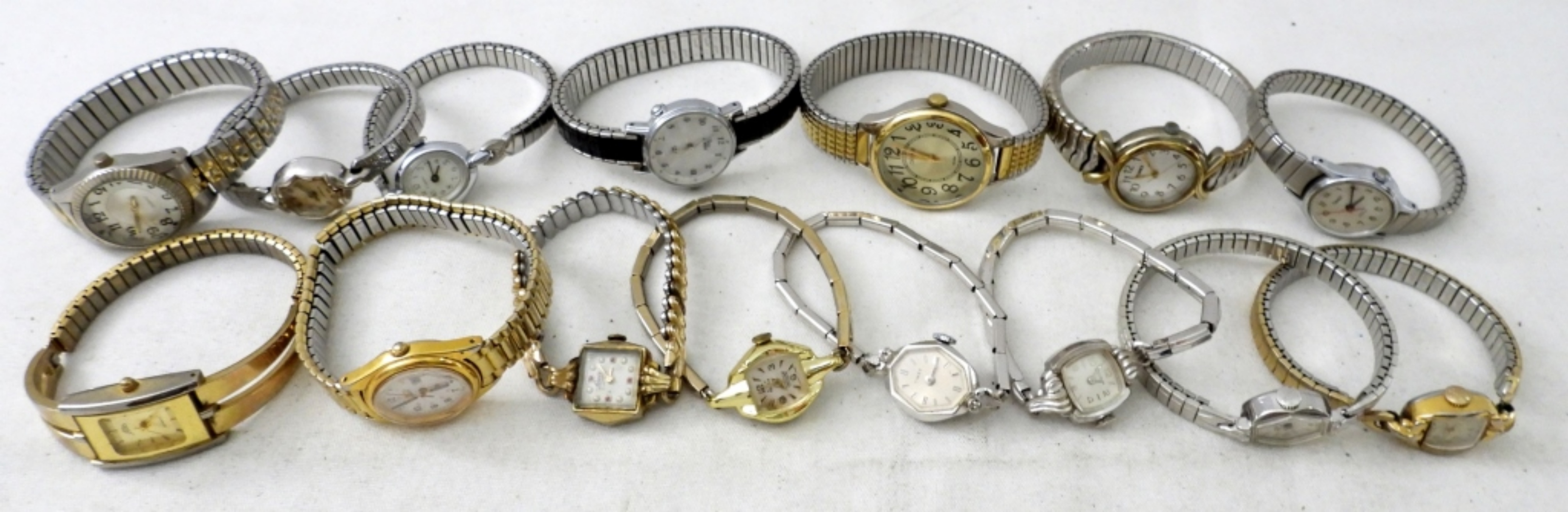 UNTESTED (20) STRETCH BAND LADIES WATCHES, MIX OF SILVERTONE, GOLDTONE, TWO TONE, ELGIN, WITTNAUER, TIMEX, OTHER BRANDS