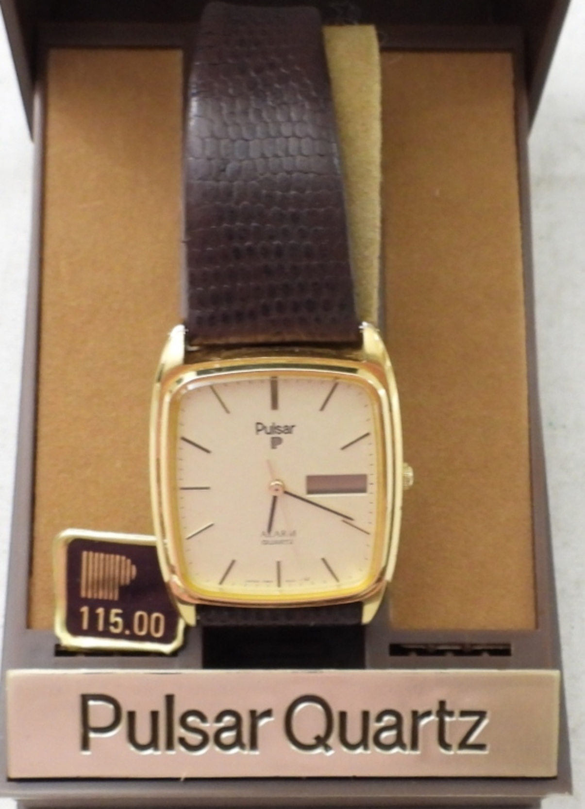 VINTAGE MENS PULSAR QUARTZ WATCH. GOLD TONE WITH A BROWN BAND ,IN ORIGINAL BOX. NOT TESTED AS TO WORKING OR NOT