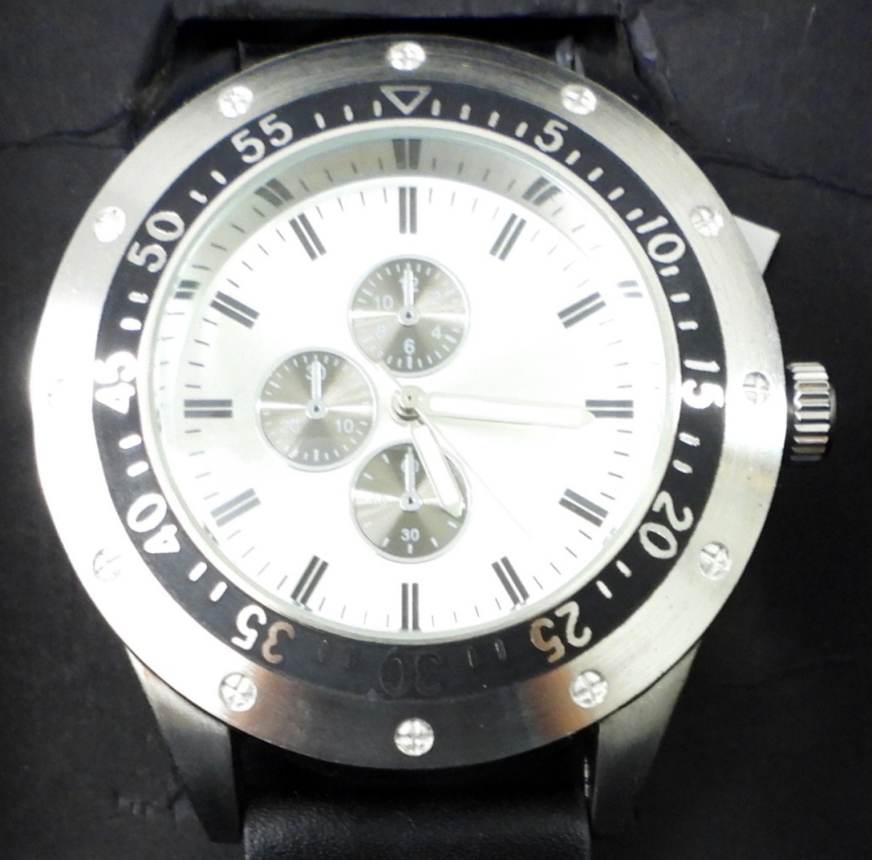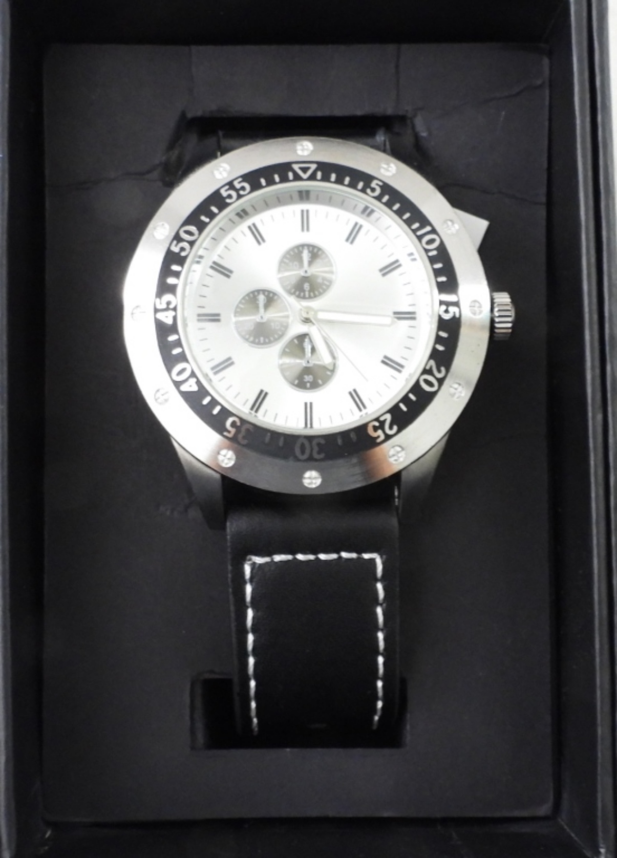UNTESTED COLLEZIO CHRONOGRAPH MENS WATCH W ORIGINAL BOX, BLACK LEATHER LIKE BAND, BUCKLE CLASP