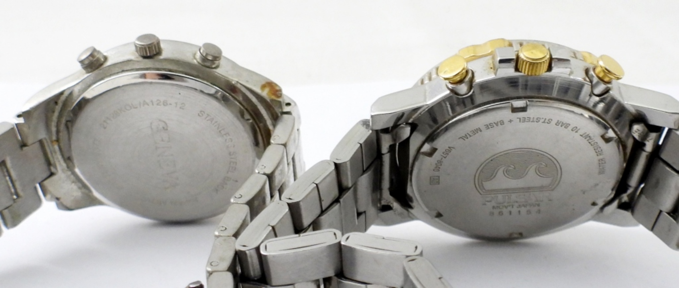 UNTESTED (2) GENEVA & PULSAR CHRONOGRAPH MENS WATCHES SILVERTONE, METAL LINK BANDS, FOLDING CLASP