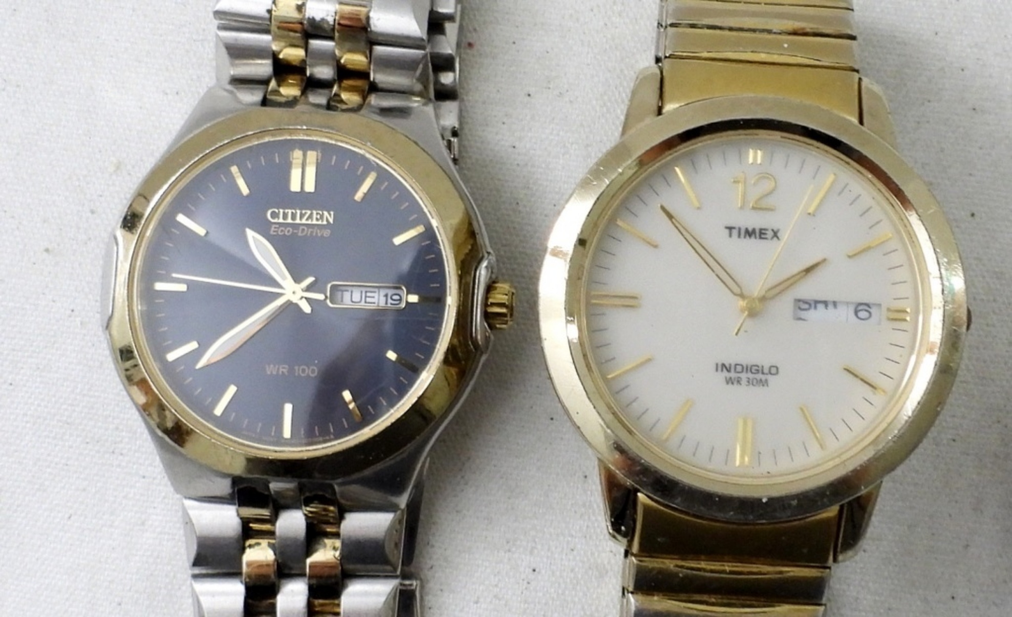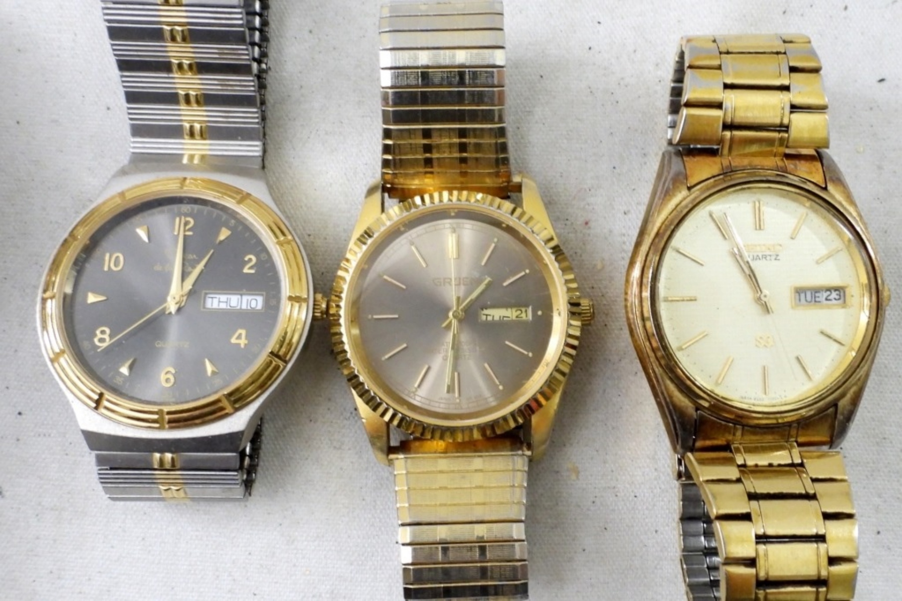 UNTESTED (5) DAY/DATE MENS WATCHES, MIX OF SILVERTONE, GOLDTONE, TWO TONE, TIMEX, SEIKO, CITIZEN, MIX OF METAL LINK AND METAL STRETCH BANDS