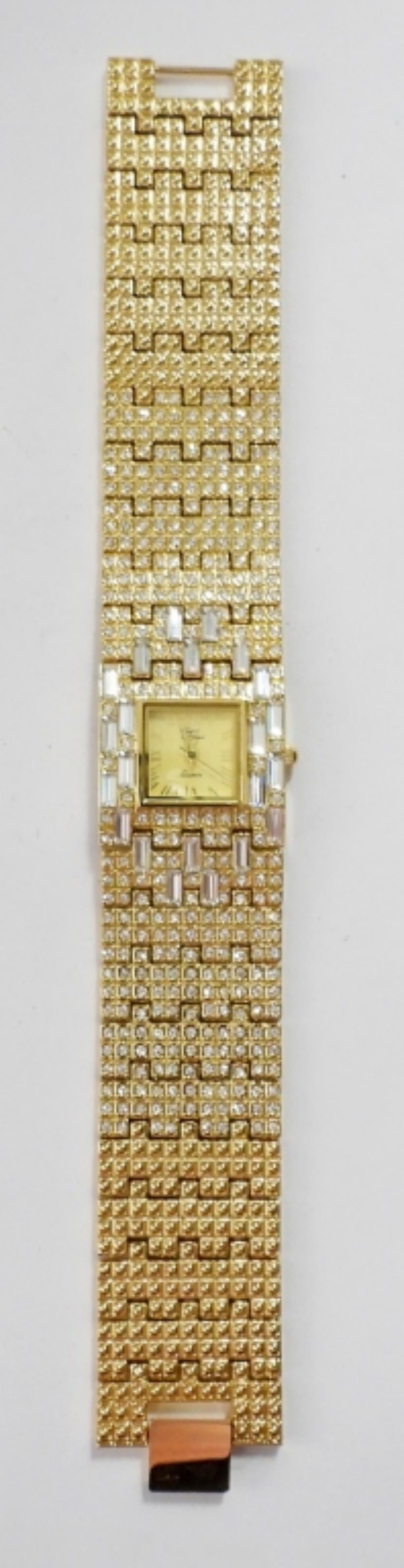 VINTAGE SUZANNE SOMMERS RHINESTONE WIDE BRACELET WATCH, GOLD TONE. IN ORIGINAL BOX , NOT TESTED AS TO WORKING OR NOT