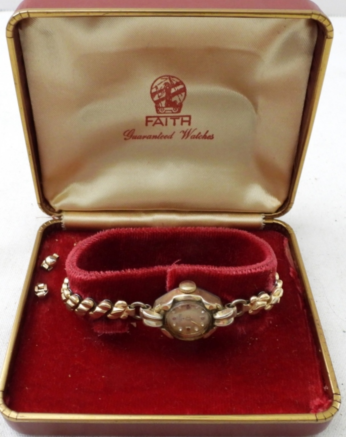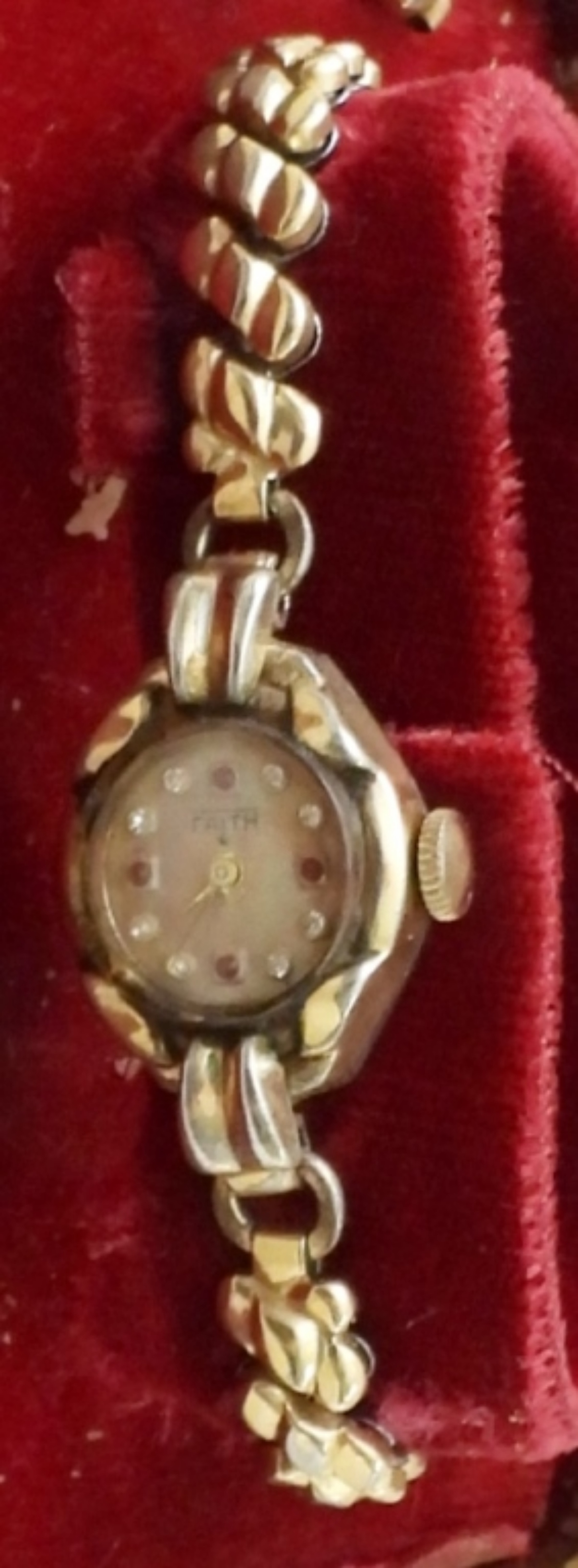 VINTAGE FAITH GUARANTEED LADIES WATCHES, GOLD TONE WITH STRETCHY BAND ,IN ORIGINAL BOX ,NOT TESTED AS TO WORKING OR NOT