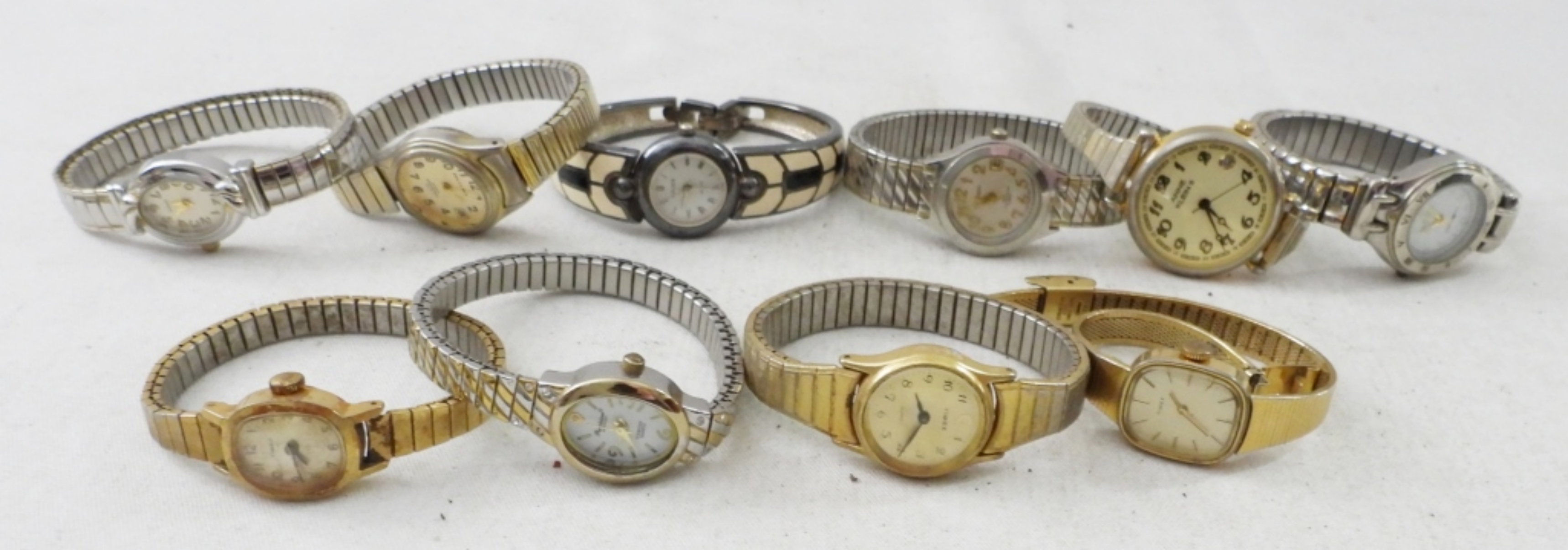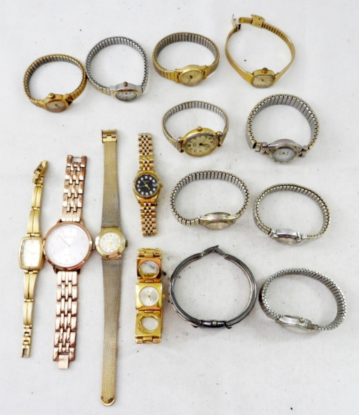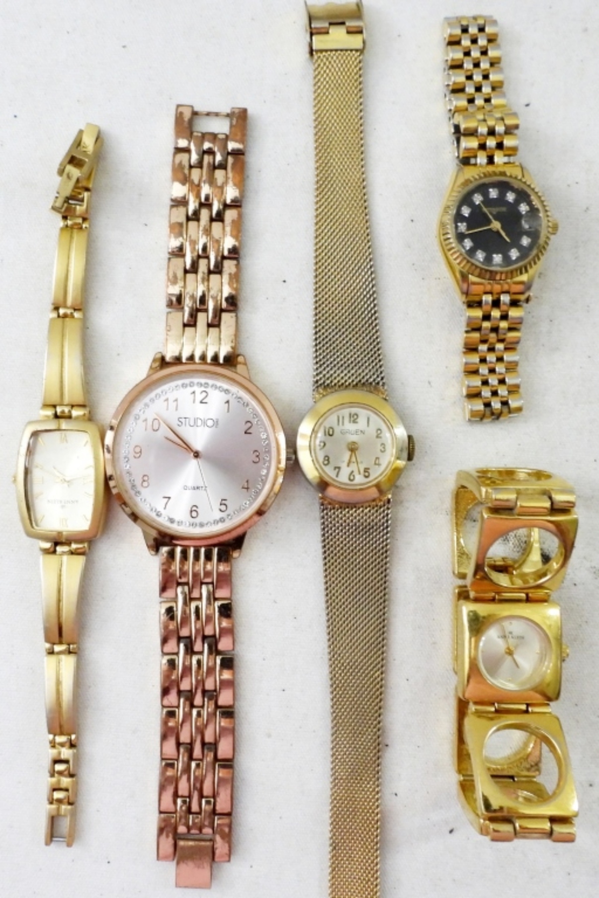 UNTESTED (15) LADIES DRESS WATCHES, MIX OF GOLDTONE, SILVERTONE, TIMEX, ANNE KLEIN, GRUEN, WITTNAUER, OTHERS