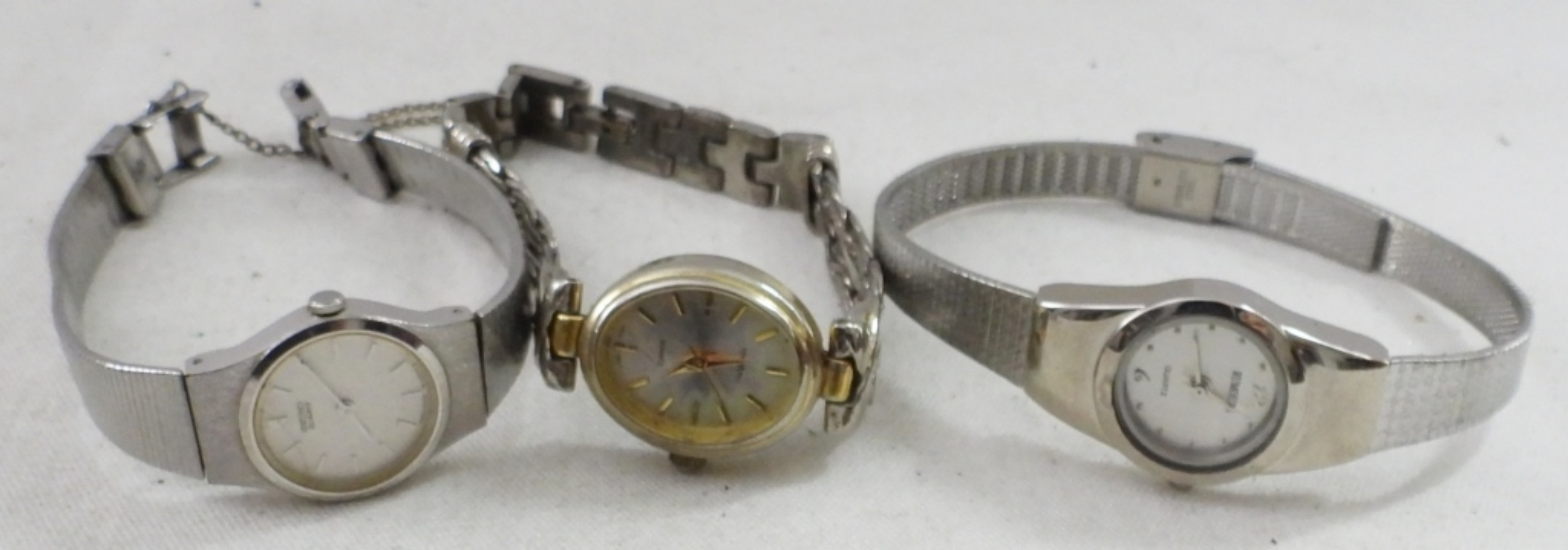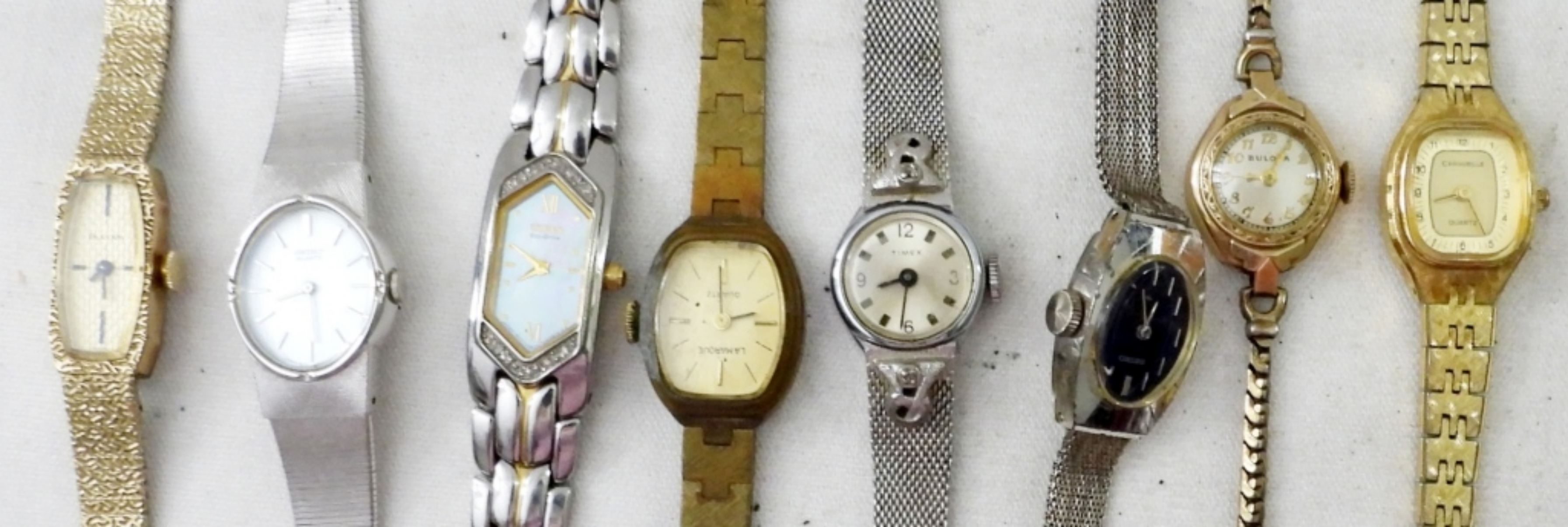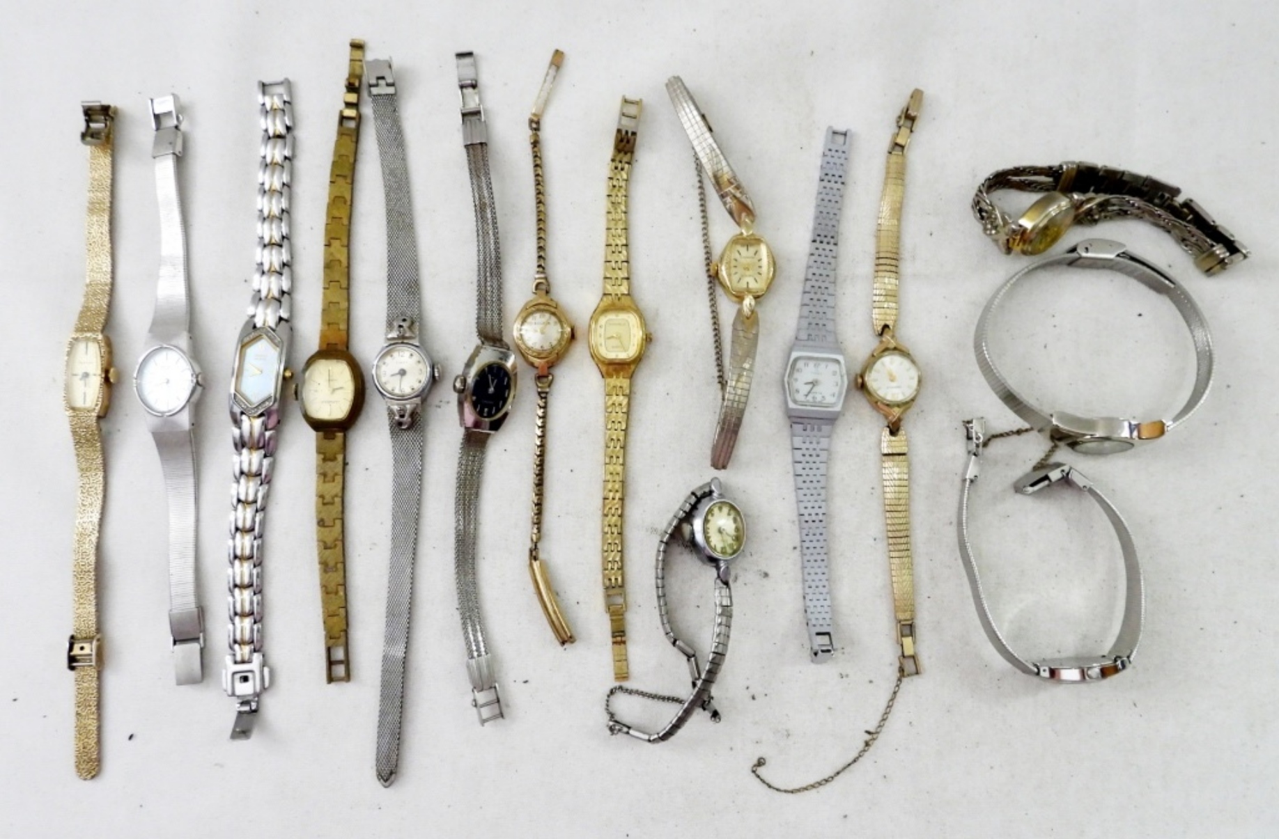 UNTESTED (15) LADIES GOLDTONE & SILVERTONE WATCHES, METAL BANDS, ASSORTED CLASP STYLES, TIMEX, BULOVA, CITIZEN, SEIKO, OTHER BRANDS