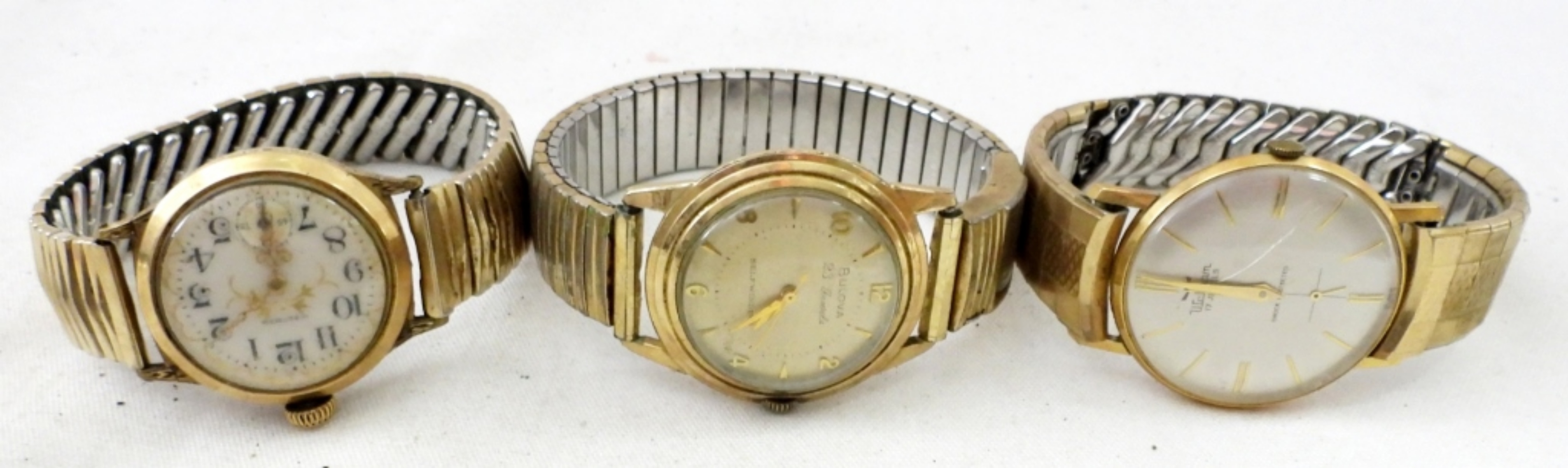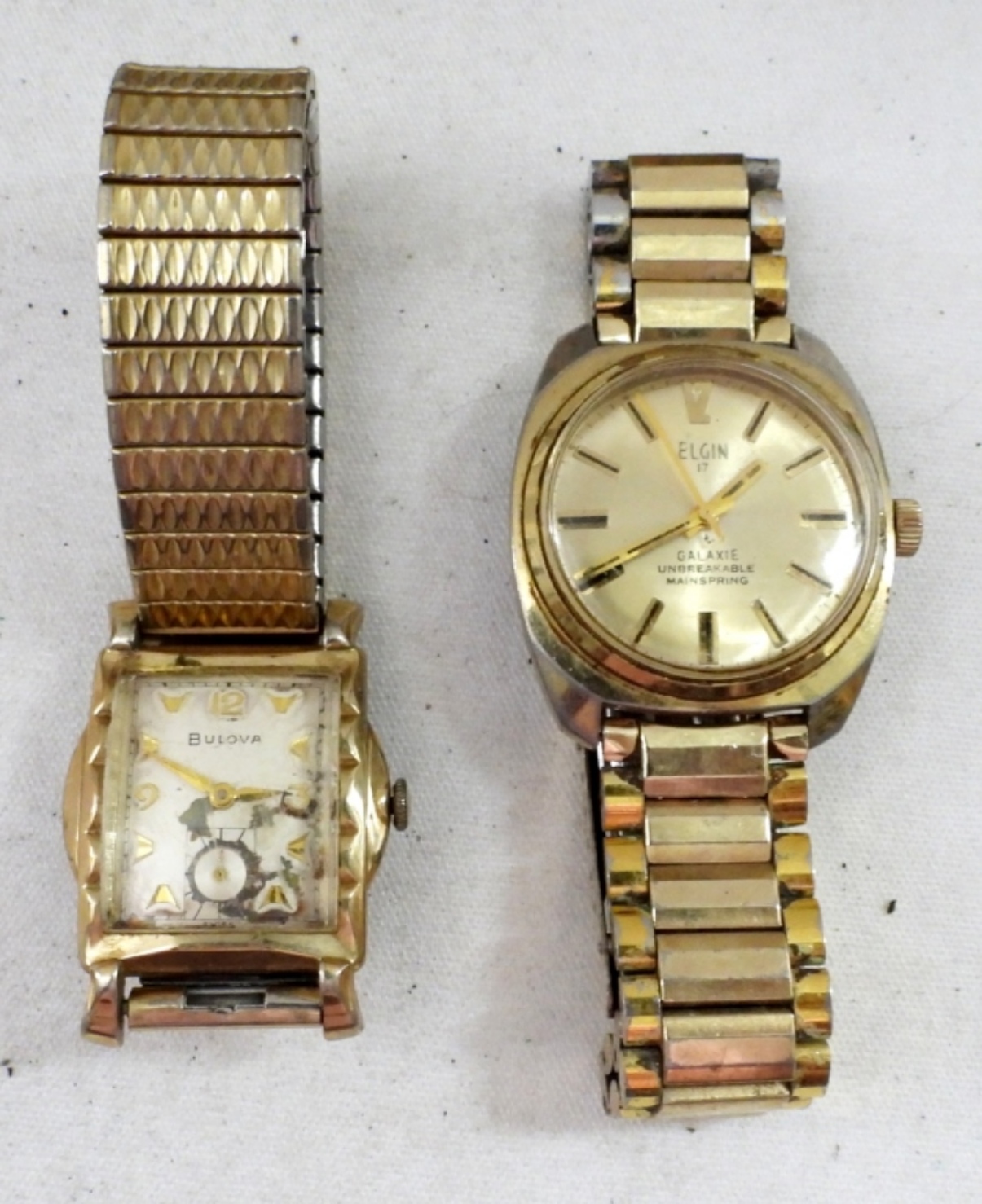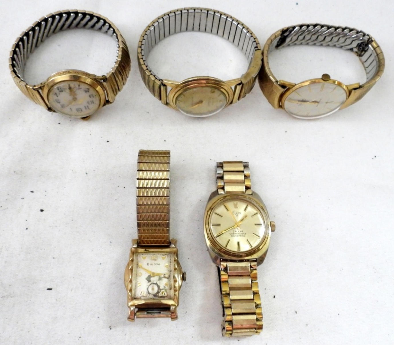 UNTESTED (5) MENS VINTAGE WATCHES, GOLDTONE, STRETCH METAL BAND, BULOVA, WALTHAM; ELGIN W/ METAL LINK BAND