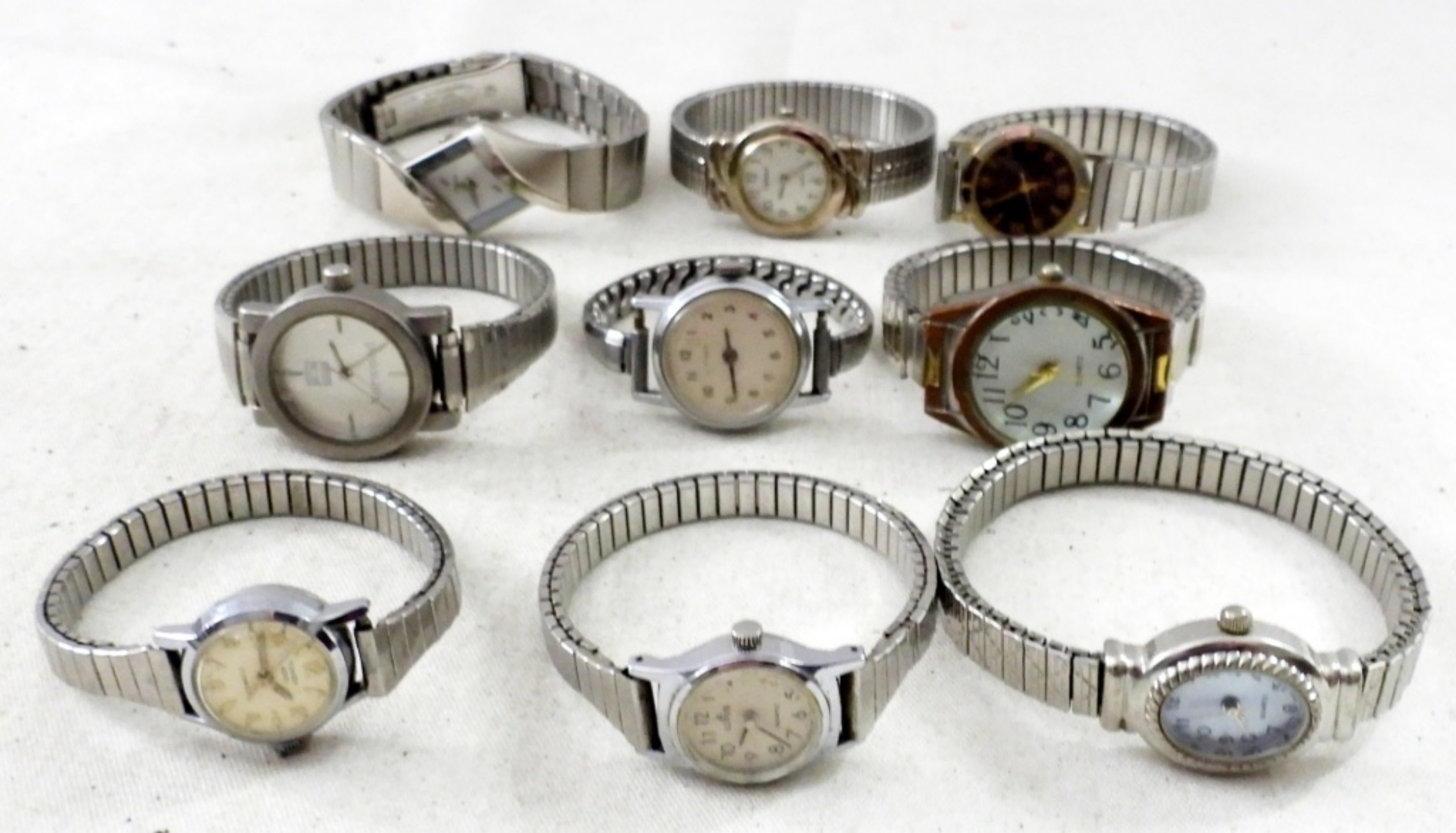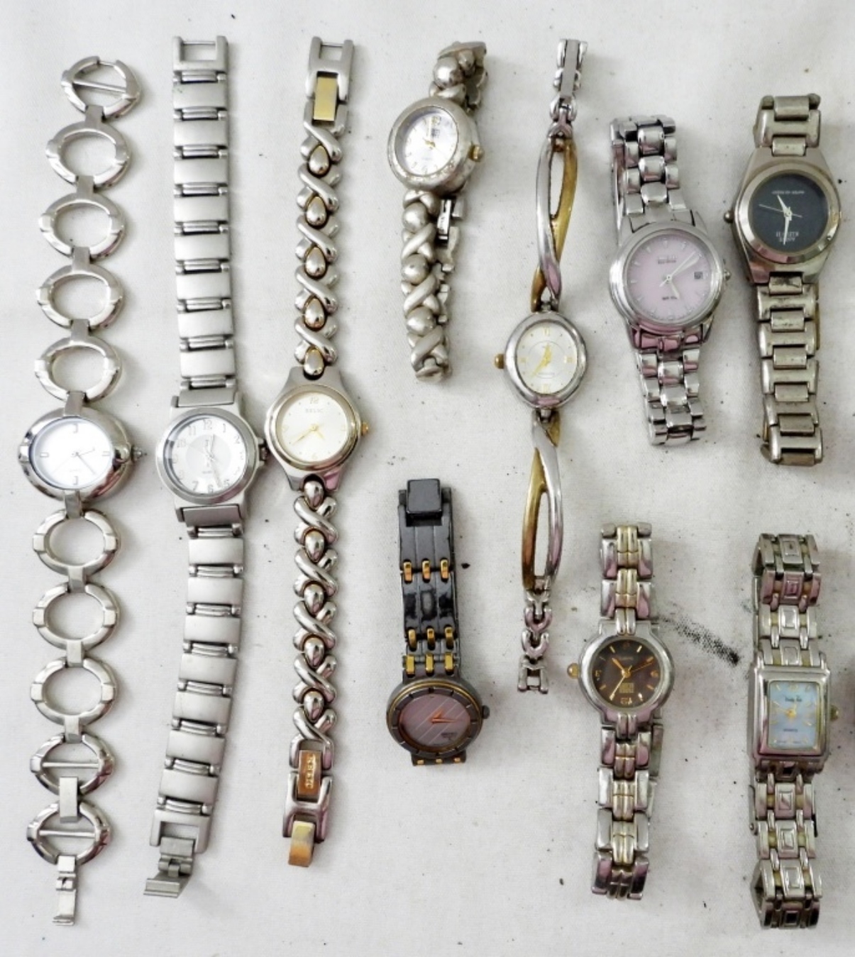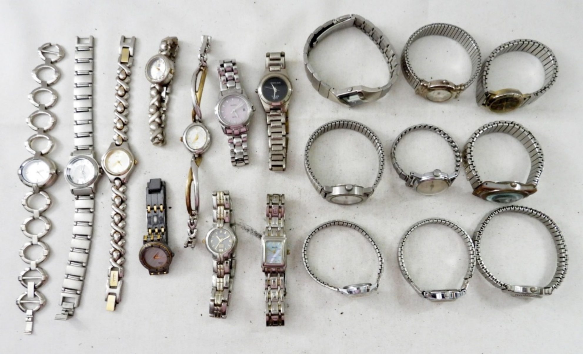 UNTESTED (19) MODERN WOMENS WATCHES, RELIC, PULSAR,TIMEX,LORUS, OTHER BRANDS. MIX OF METAL LINK, CUFF, STRETCH METAL BANDS, MIX OF SILVERTONE, GOLDTONE, TWO TONE