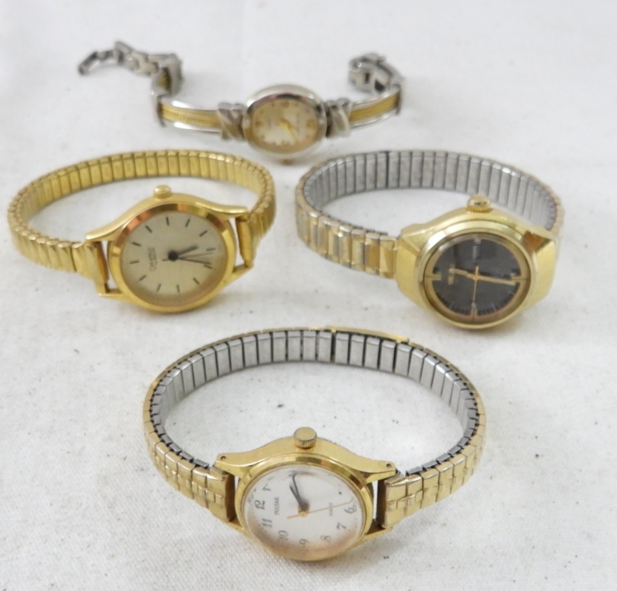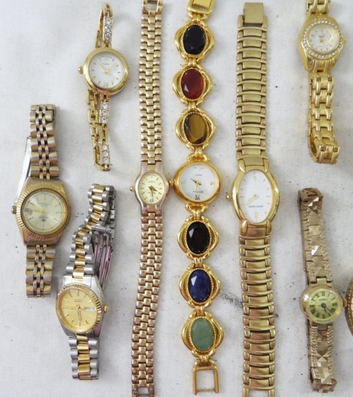 UNTESTED (12) LADIES GOLDTONE & TWOTONE WATCHES, ELGIN, SEIKO,HELBROS, OTHER BRANDS, MIX OF METAL LINK, CUFF, AND STRETCH METAL BANDS