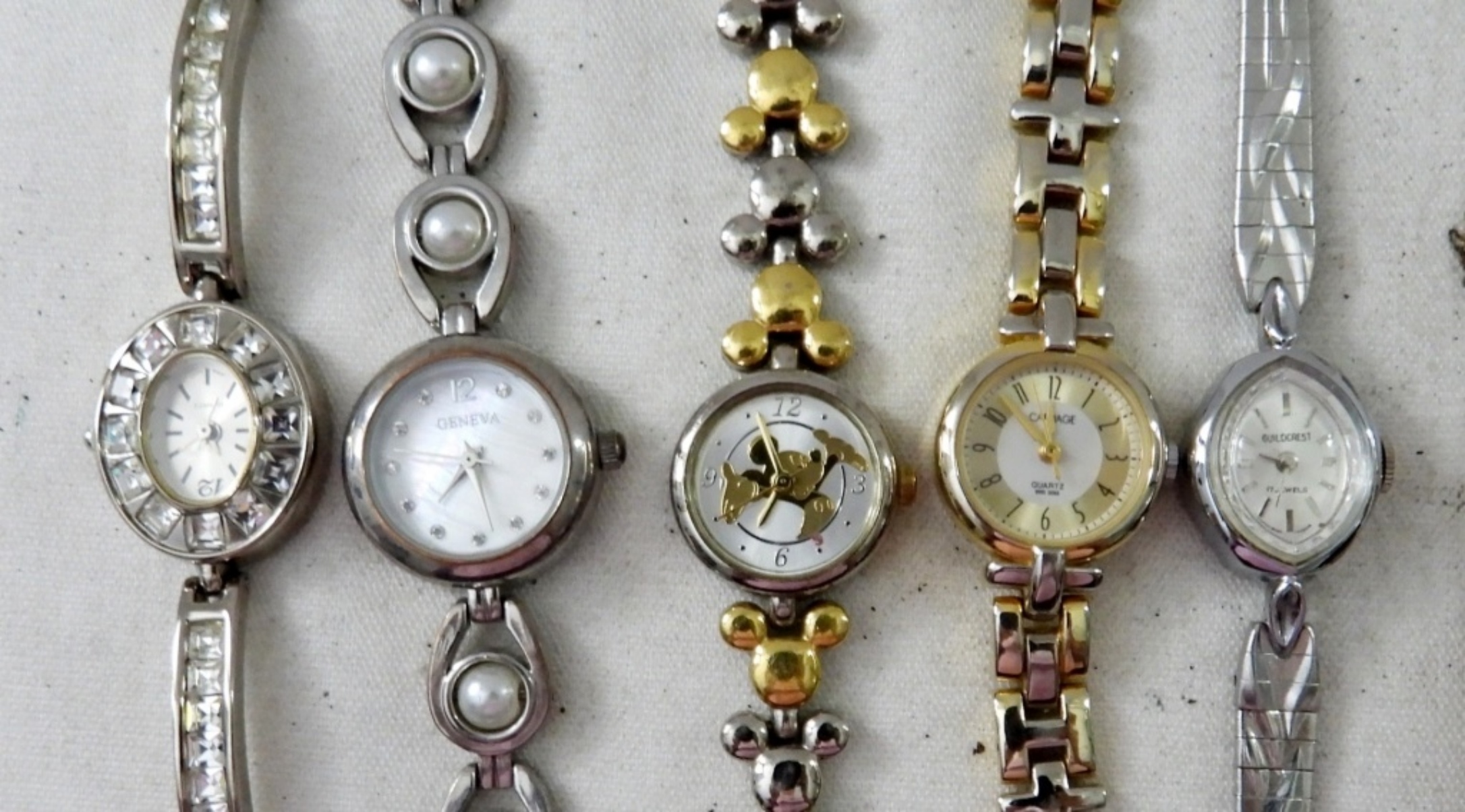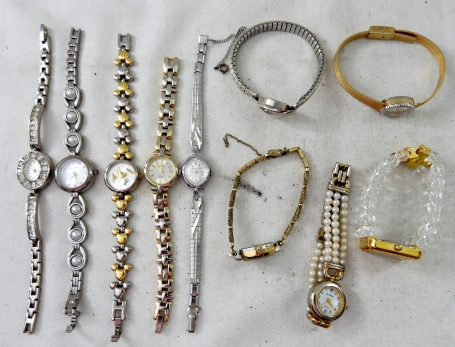 UNTESTED (10) LADIES VINTAGE & MODERN MIXED LOT OF WATCHES, GRUEN, BAYLOR, GENEVA, OTHER BRANDS, MIX OF BEADED, METAL LINK, STRETCH METAL BANDS