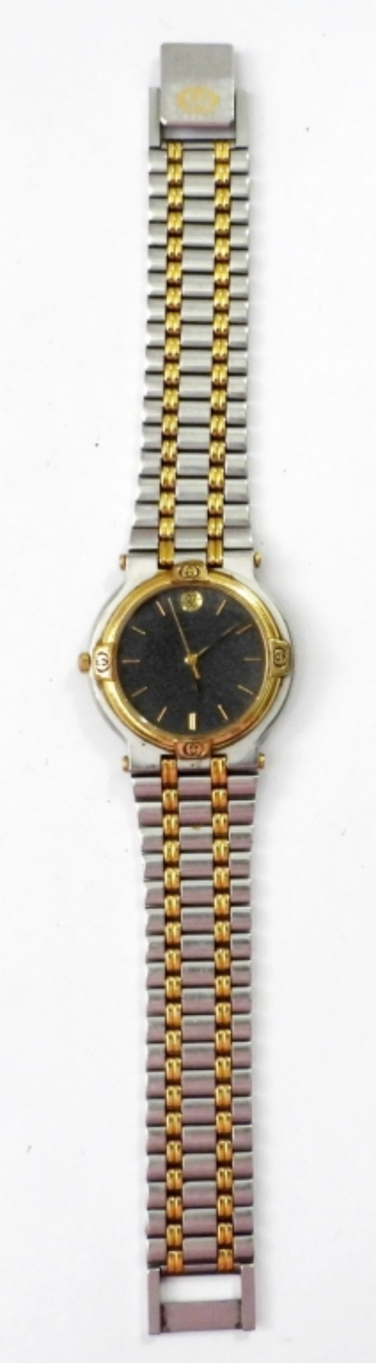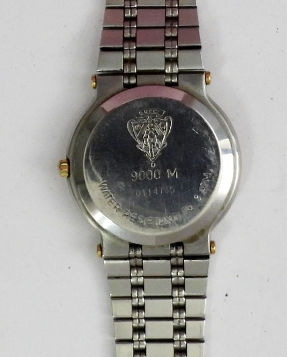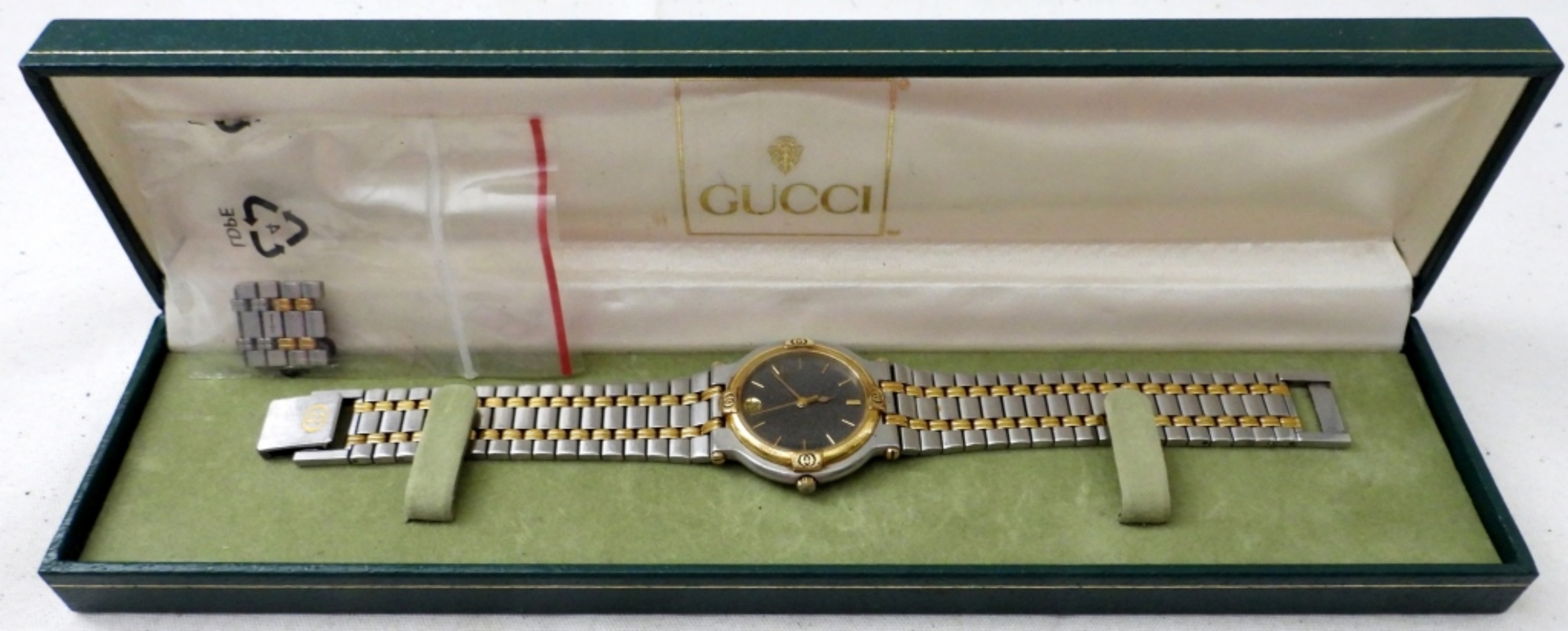 VINTAGE GUCCI MENS DATE WATCH 900M, GOLD AND SILVER TONE WITH A GRAY FACE ,IN ORIGINAL BOX . WITH EXTRA LINKS. NOT TESTED AS TO WORKING OR NOT (SER# 0114765)