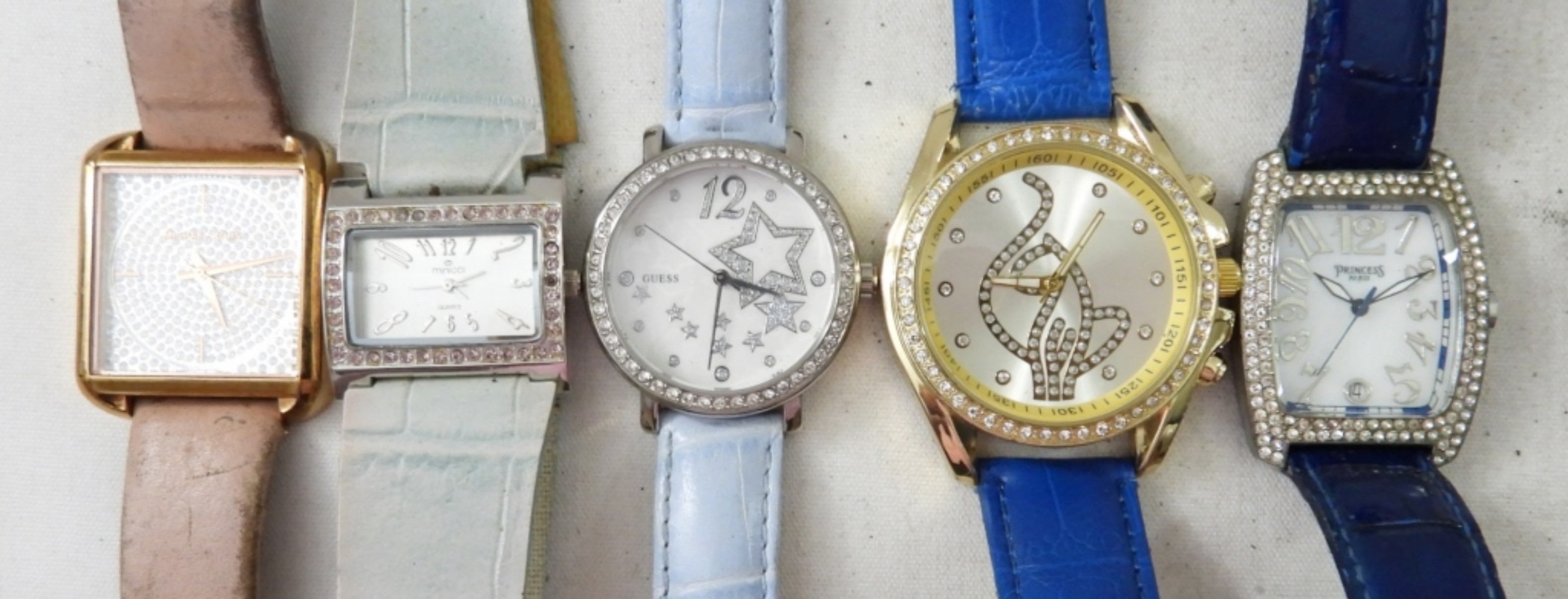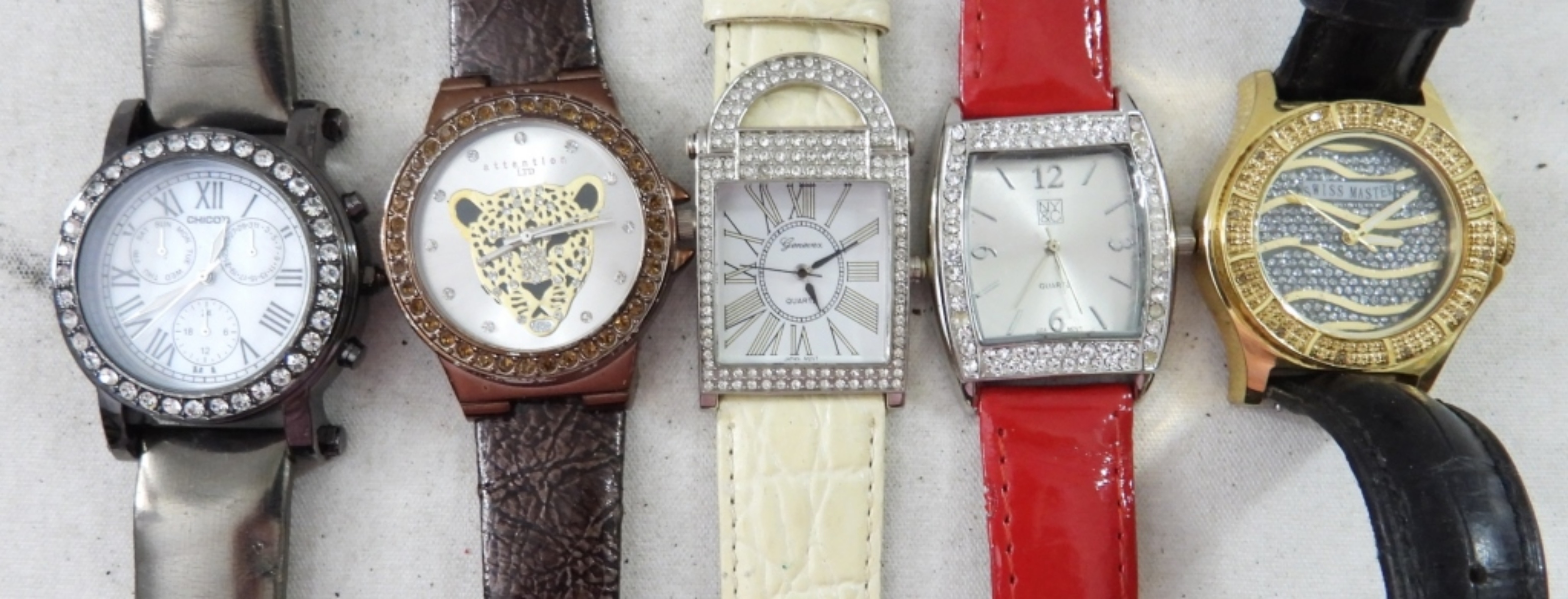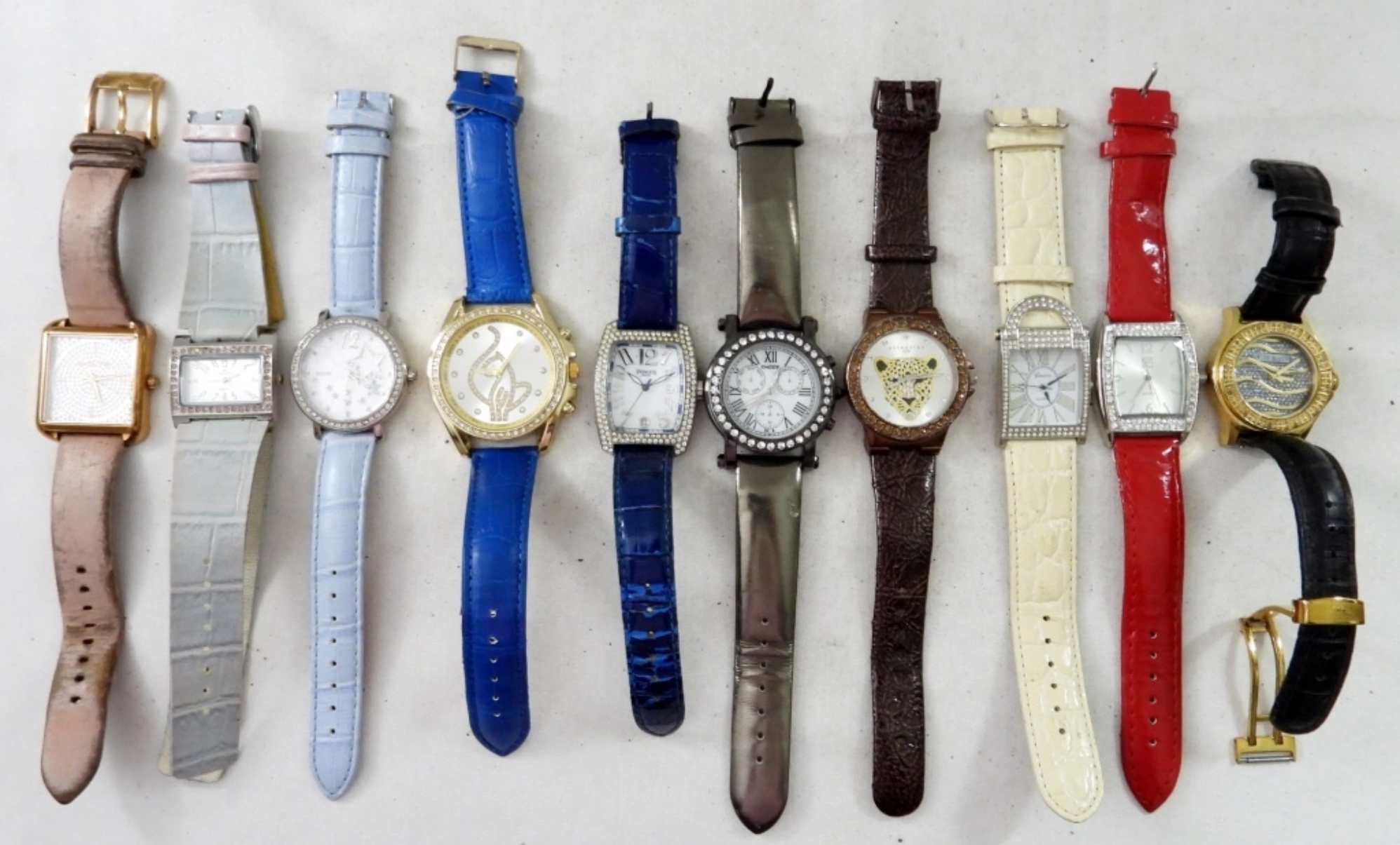 UNTESTED (10) WOMENS EMBELLISHED WATCHES WITH BUCKLE CLASP, LEATHER LIKE MATERIAL BANDS, ASSORTED COLORS, SWISS MASTER, GUESS, MINICCI, OTHER BRANDS