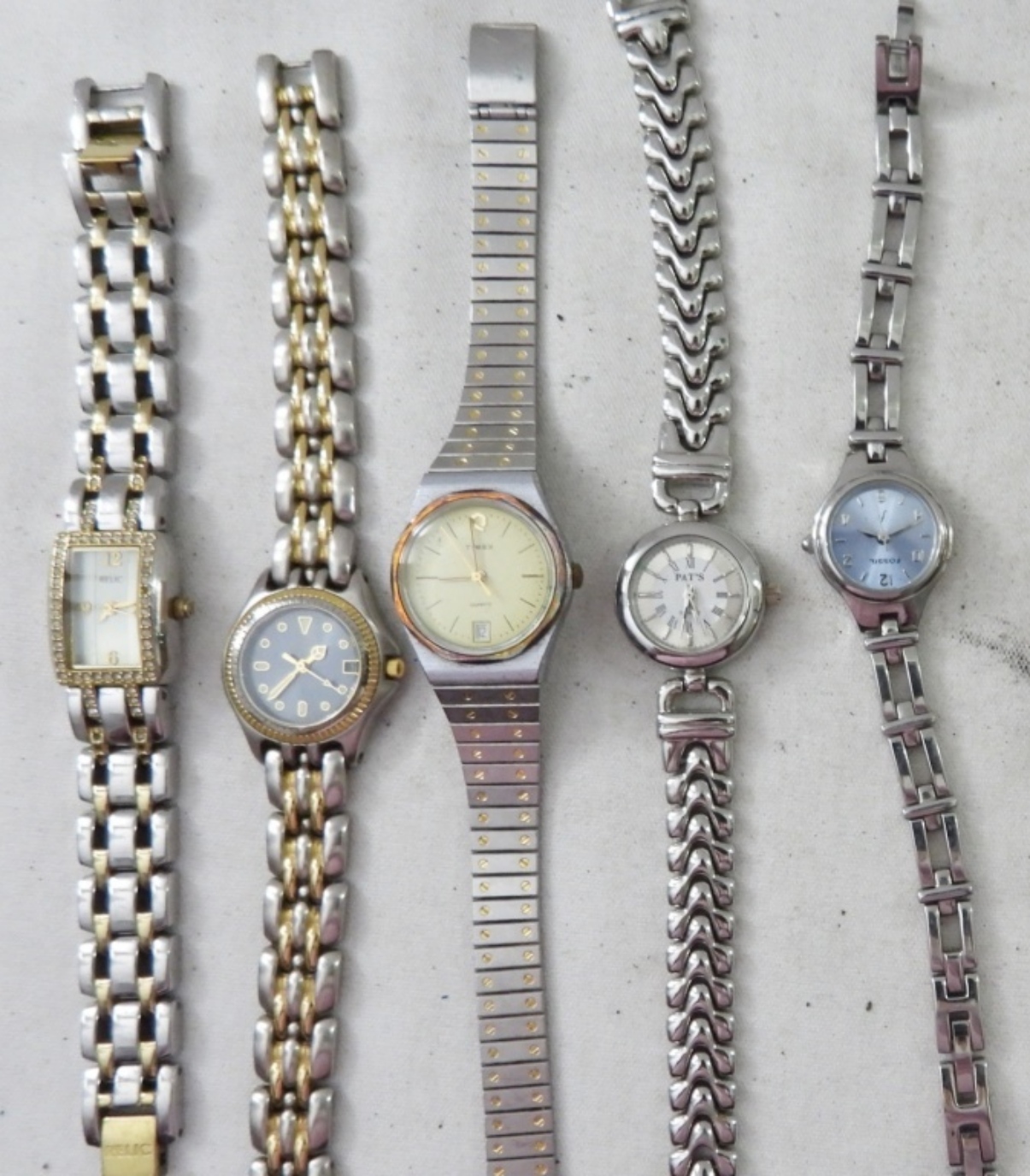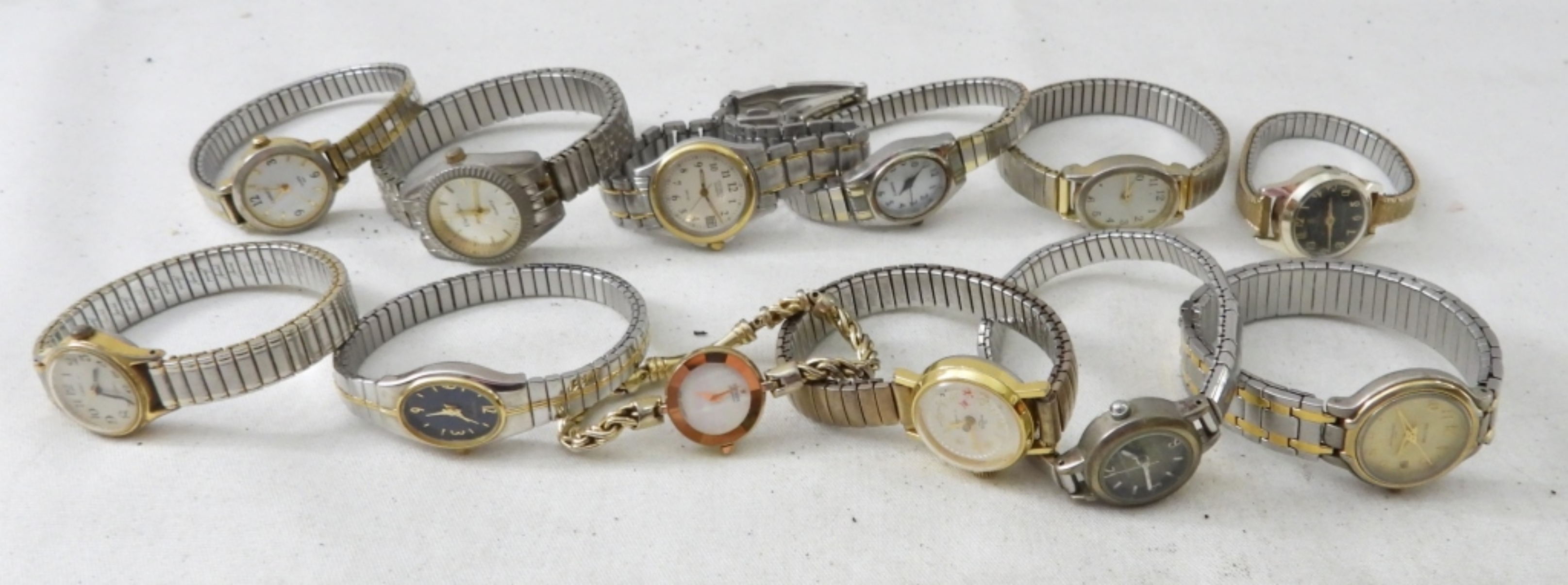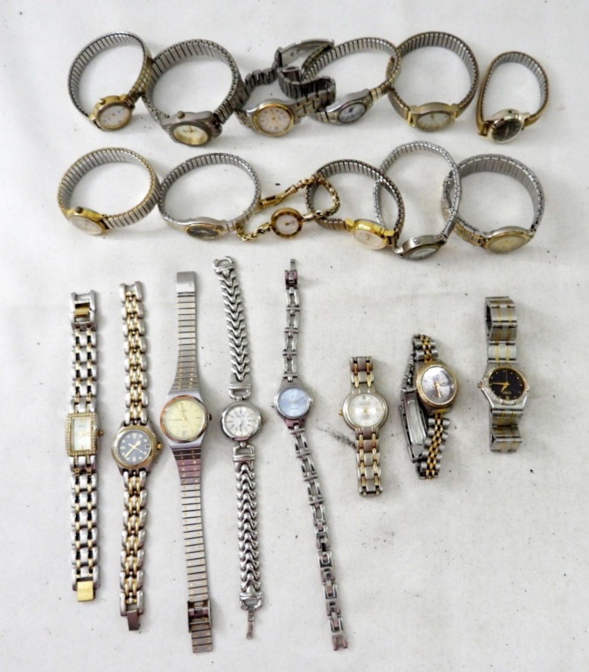 UNTESTED (20) LADIES SILVERTONE & TWOTONE WATCHES, TIMEX, WALTHAM, CITIZEN, PULSAR, OTHER BRANDS, MIX OF STRETCH METAL AND METAL LINK BANDS W/ FOLD CLASP