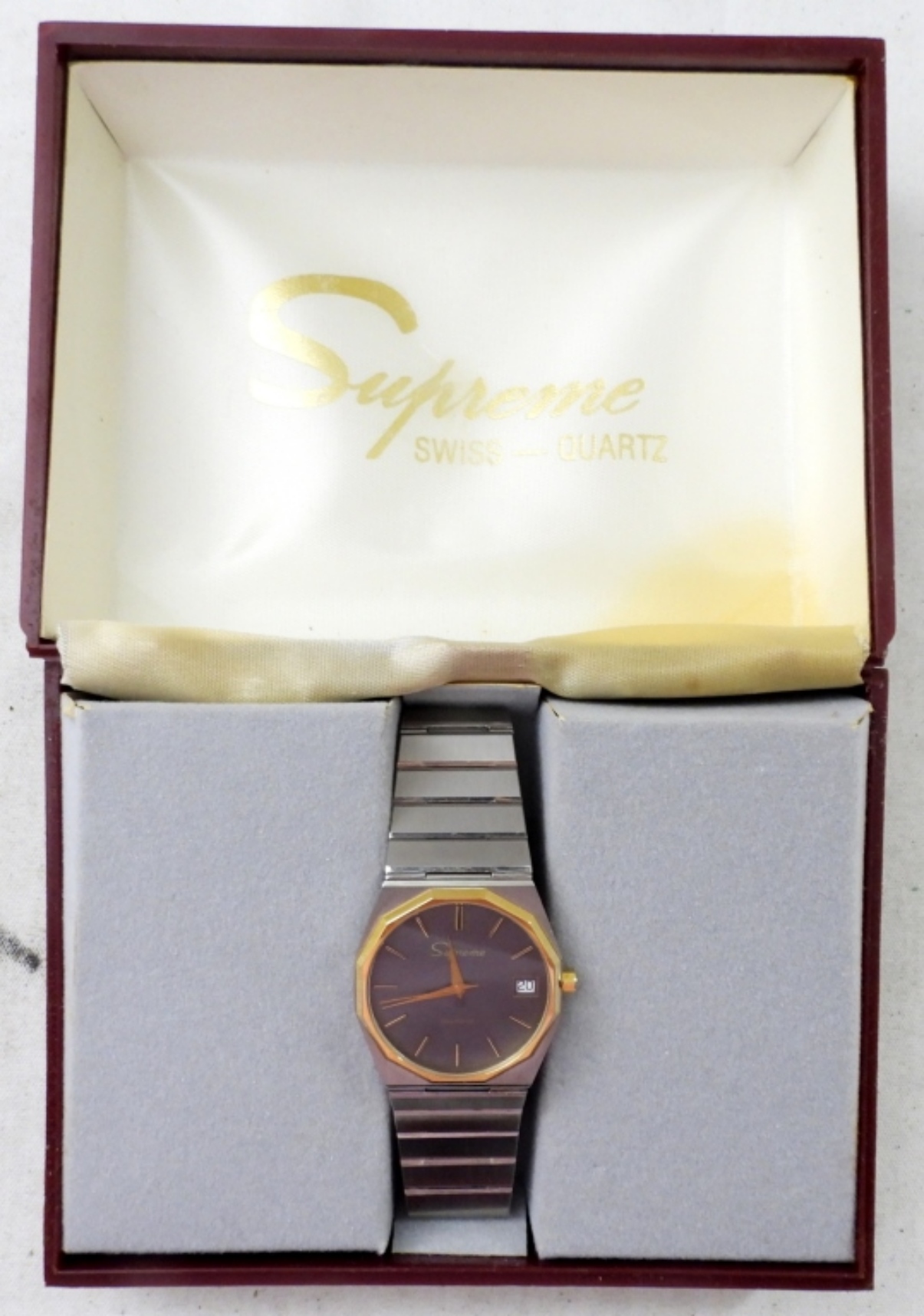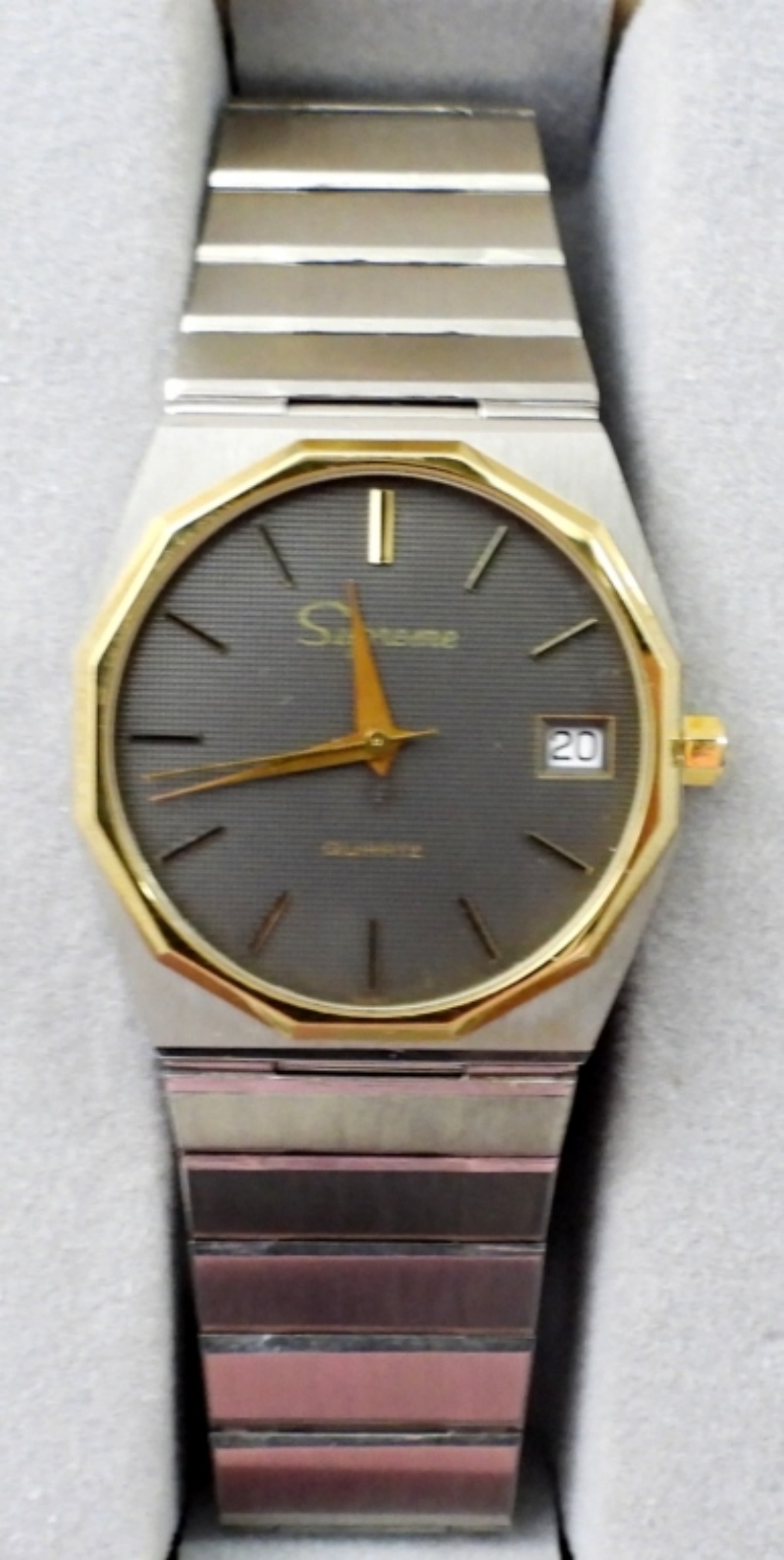 MENS SUPREME SWISS QUARTZ DATE WATCH, STAINLESS STEEL GOLD TONE DATE WATCH IN ORIGINAL BOX . NOT TESTED AS TO WORKING OR NOT