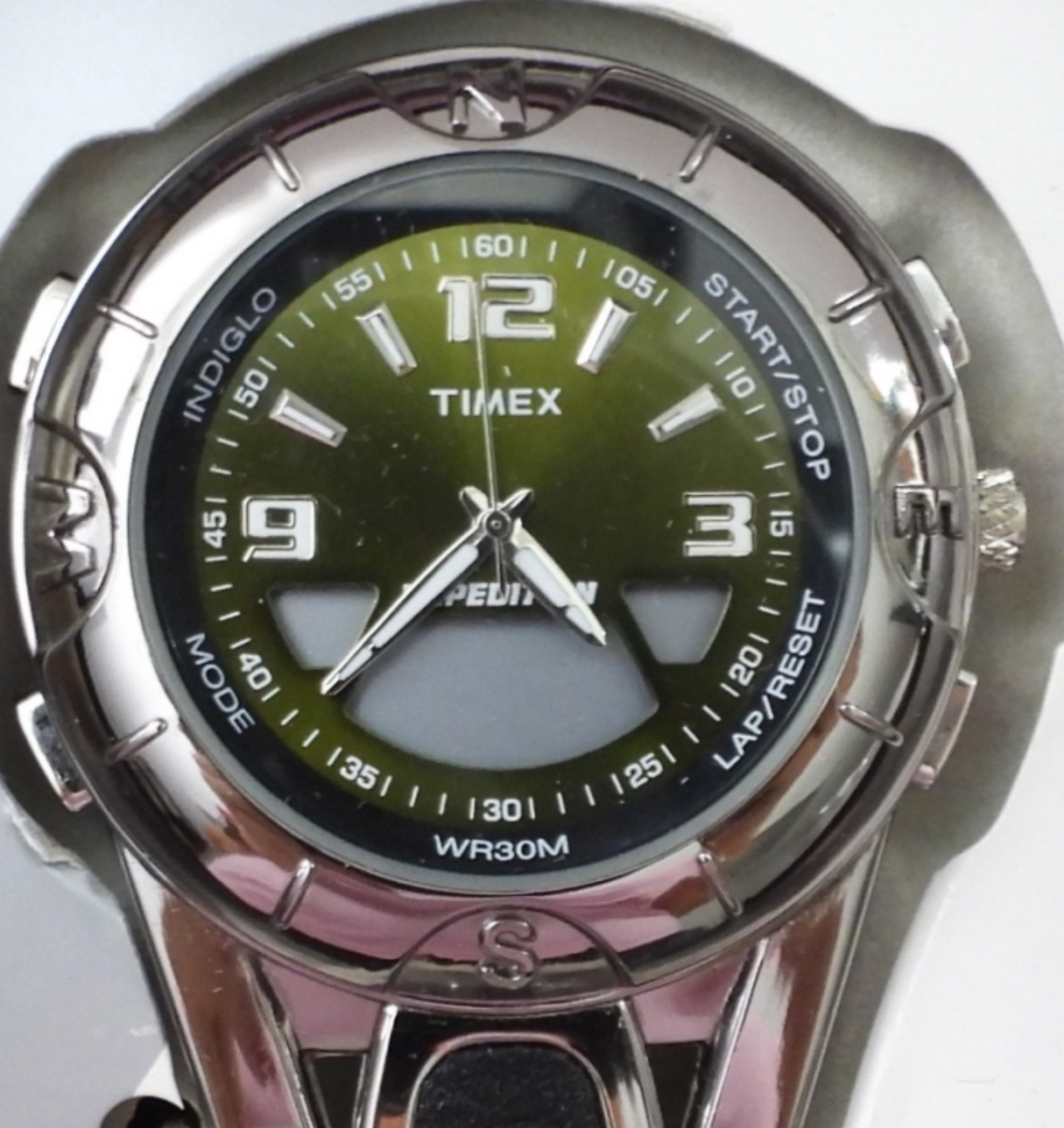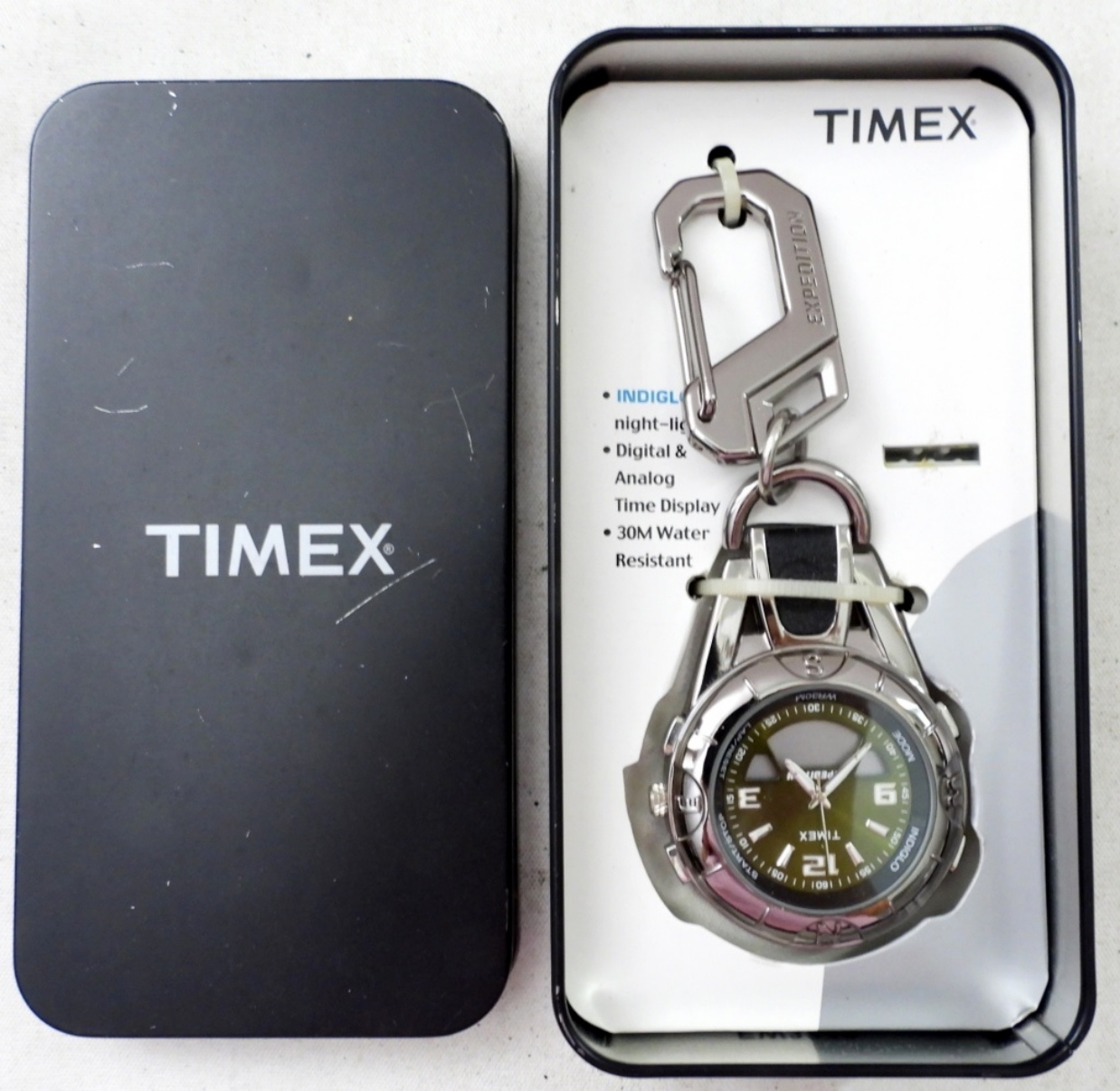 VINTAGE TIMEX EXPEDITION CARABINER WATCH, DIGITAL & ANALOG SILVER TONE IN ORIGINAL TIN BOX