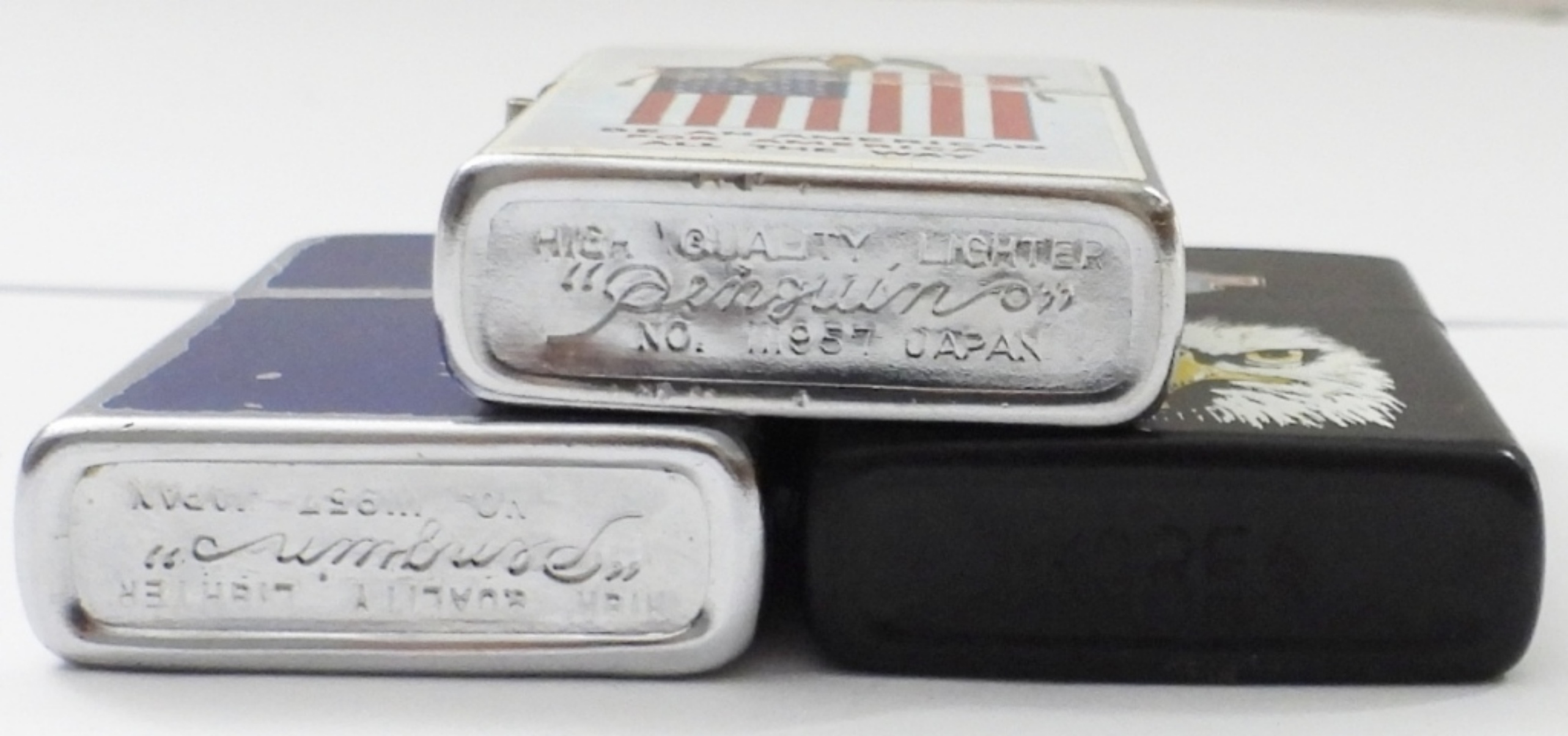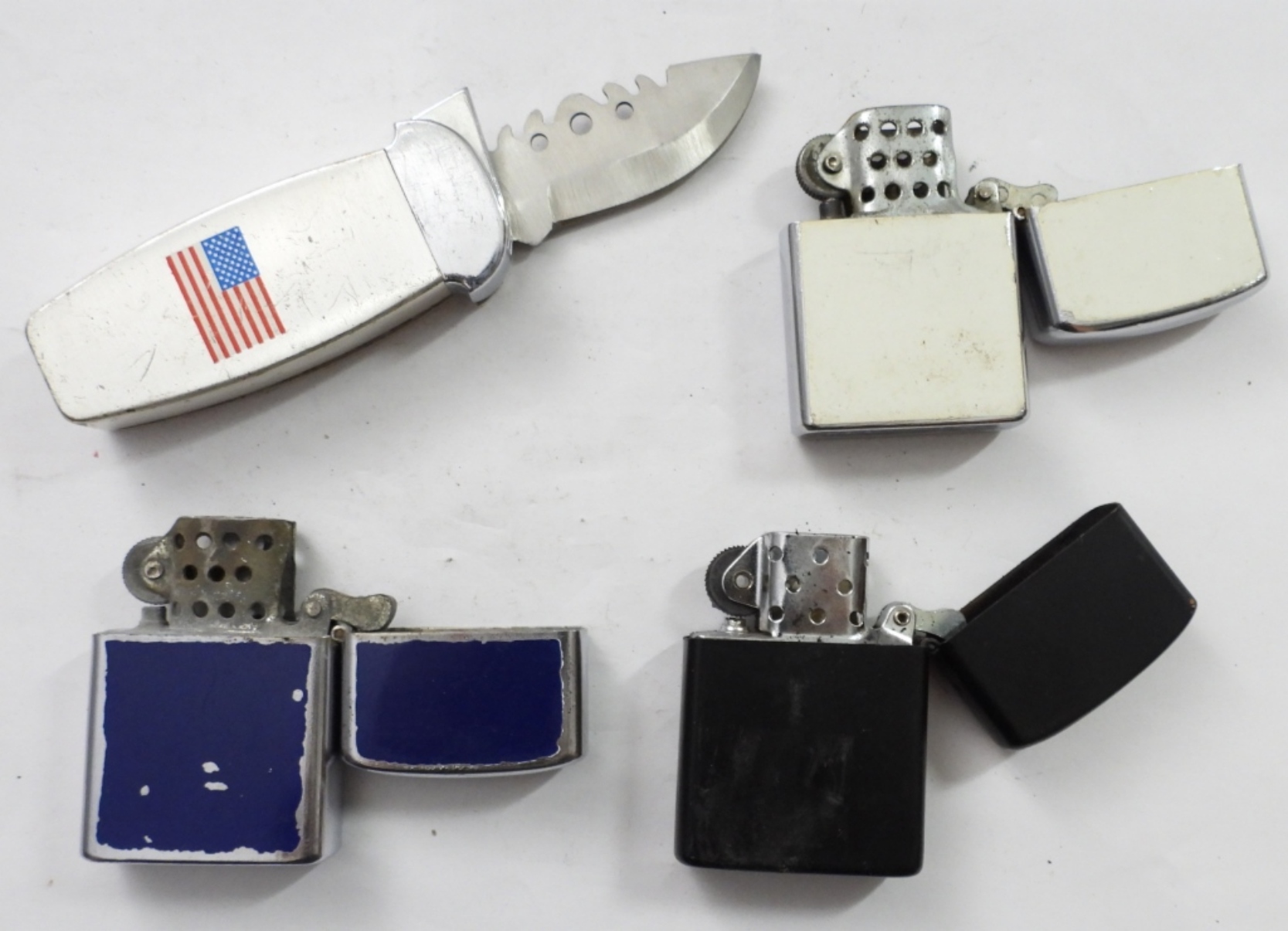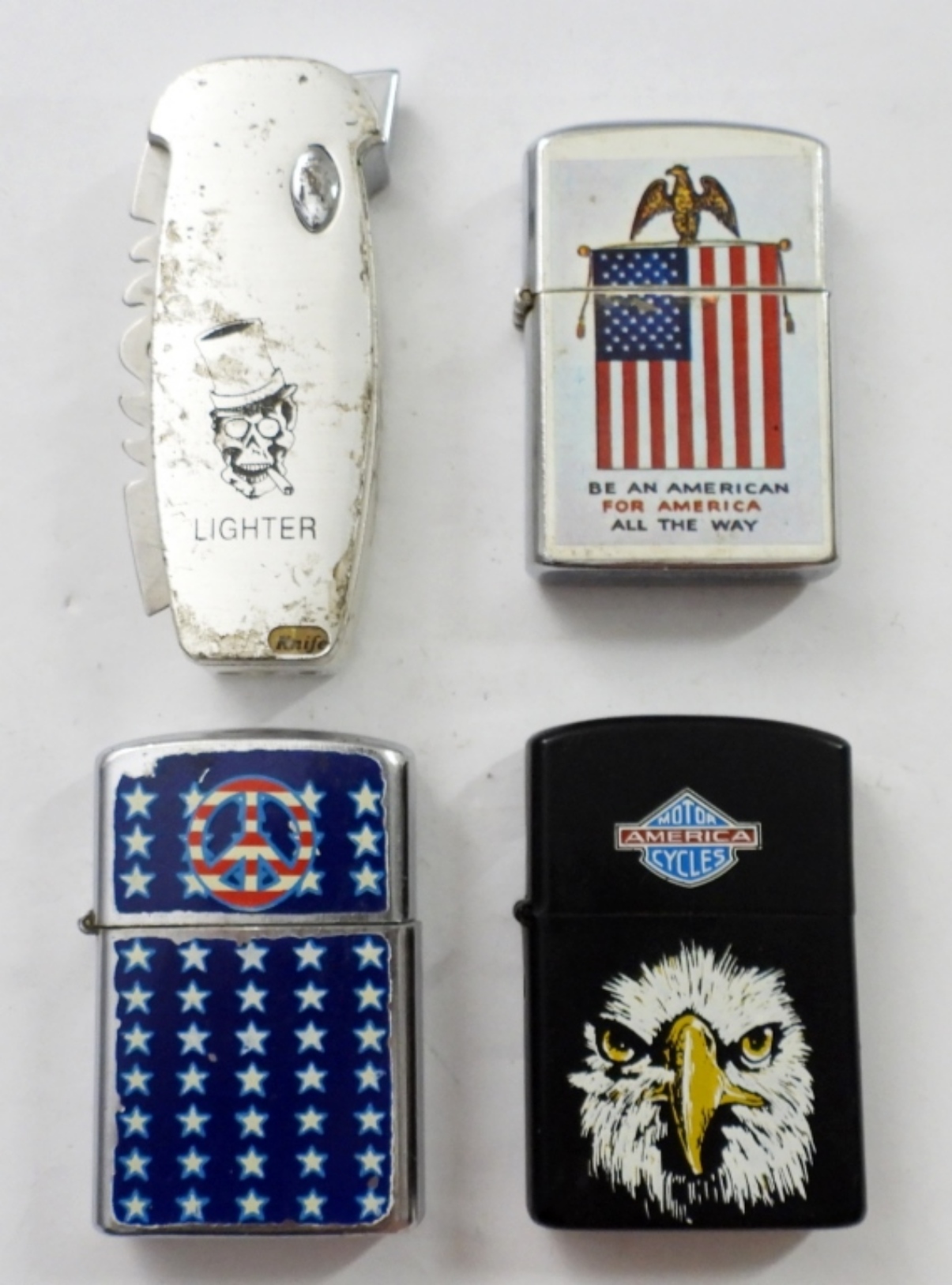 (4) EAGLE/ FLAG DESIGN LIGHTERS, (3) FLIP-TOP WITH FLAG OR EAGLE DESIGN, (1) BUTANE LIGHER AND POCKET KNIFE IN ONE WITH AMERICAN FLAG