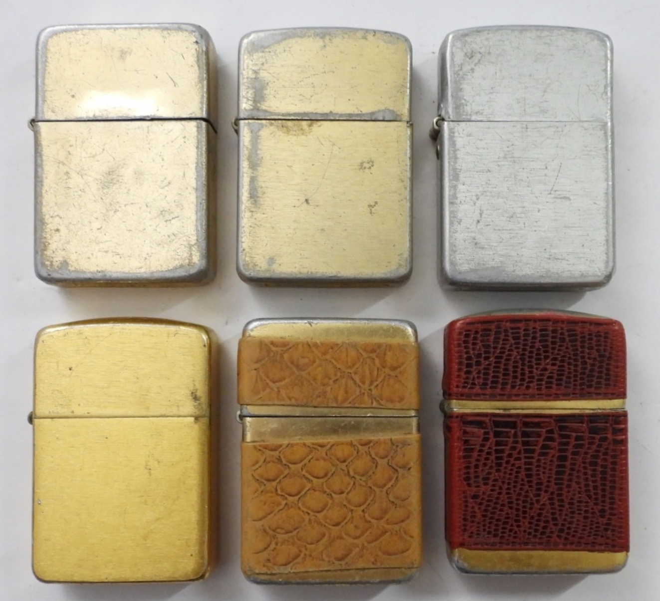 (6) STORM KING FLIP TOP LIGHTERS, FIRED, WORN/USED CONDITION, (3) GOLDTONE, (1) SILVERTONE (2) SNAKE SKIN – LIKE DESIGN RED AND TAN