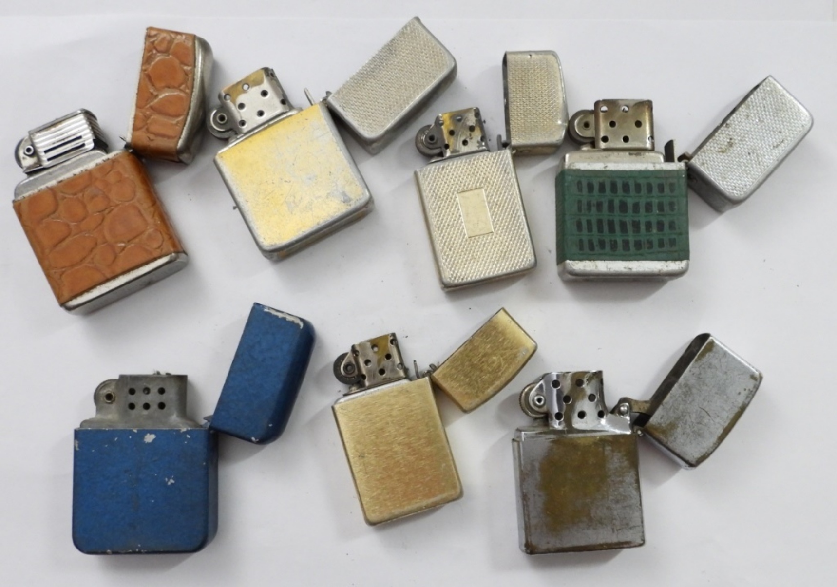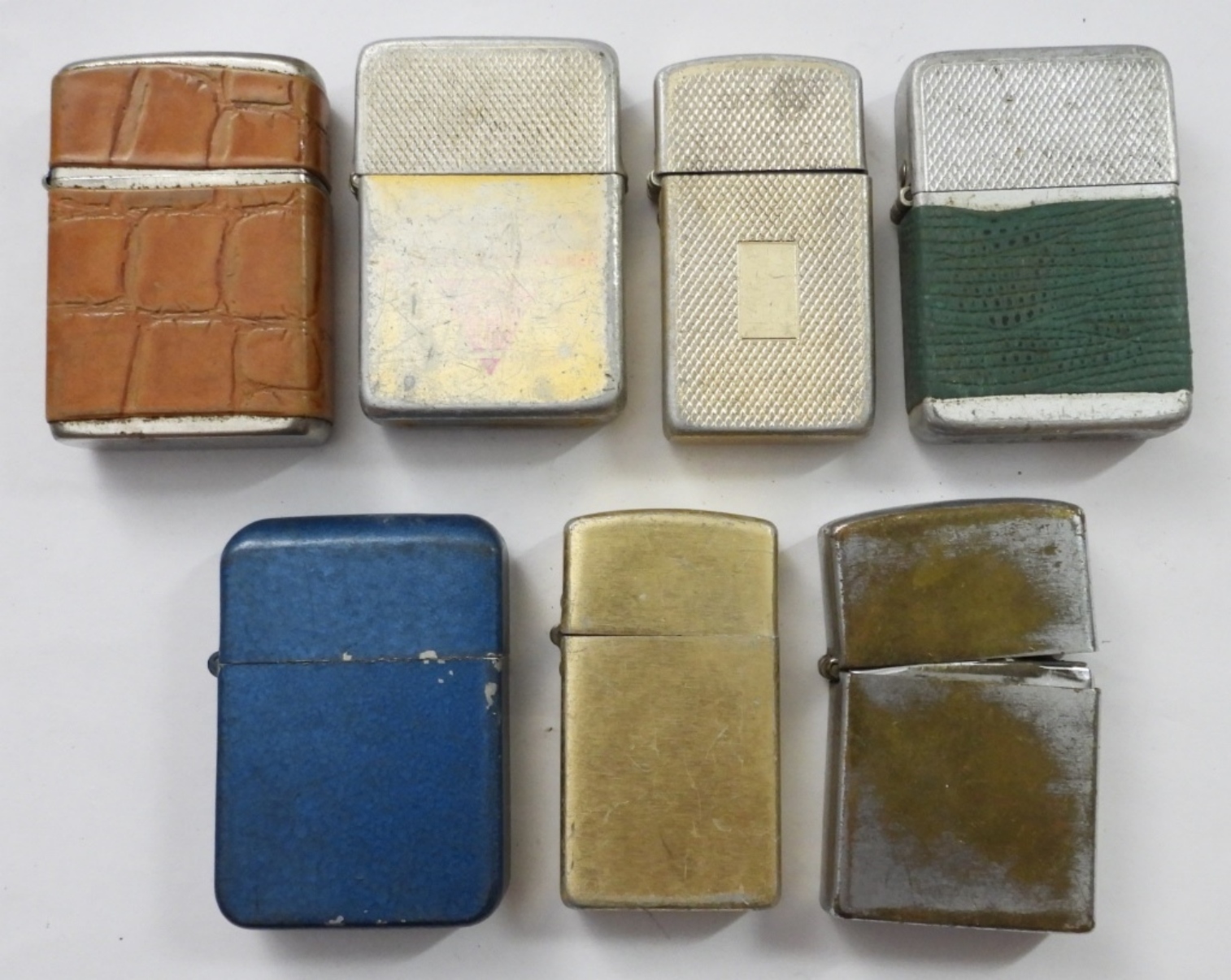 (7) VINTAGE FLIP TOP LIGHTERS, FIRED/USED, STROM KING, “MADE IN USA” STEEL WORKERS STAMP, OTHER BRANDS, MIX OF LEATHER WRAP STYLE, SILVERTONE, GOLDTONE, COLOR