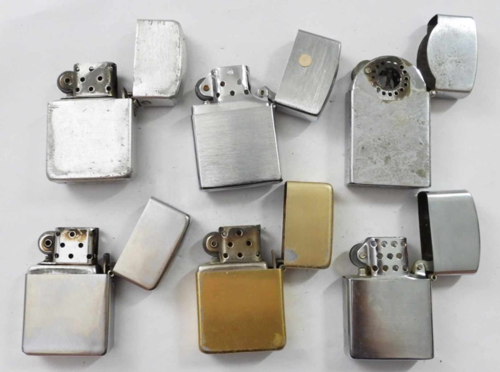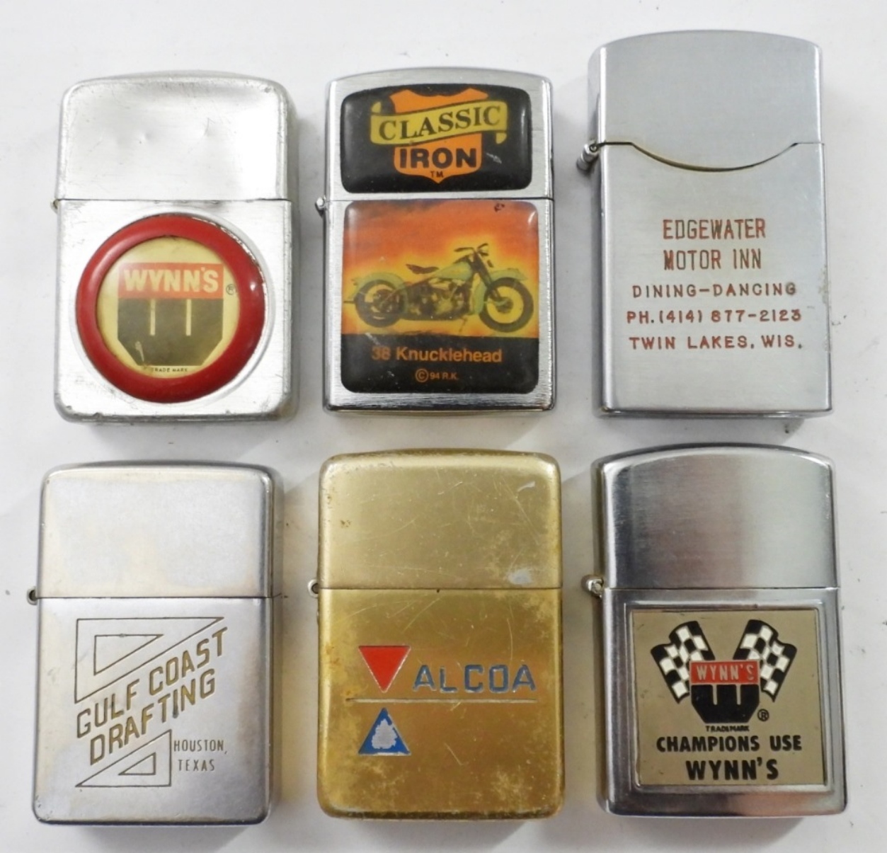 (6) VINTAGE FLIP TOP ADVERTIZING LIGHTERS,(2) WYNNS, CLASSIC IRON, ALCOA, GULF COAST DRAFTING, EDGEWATER MOTOR INN; MIX OF FIRED AND UNFIRED