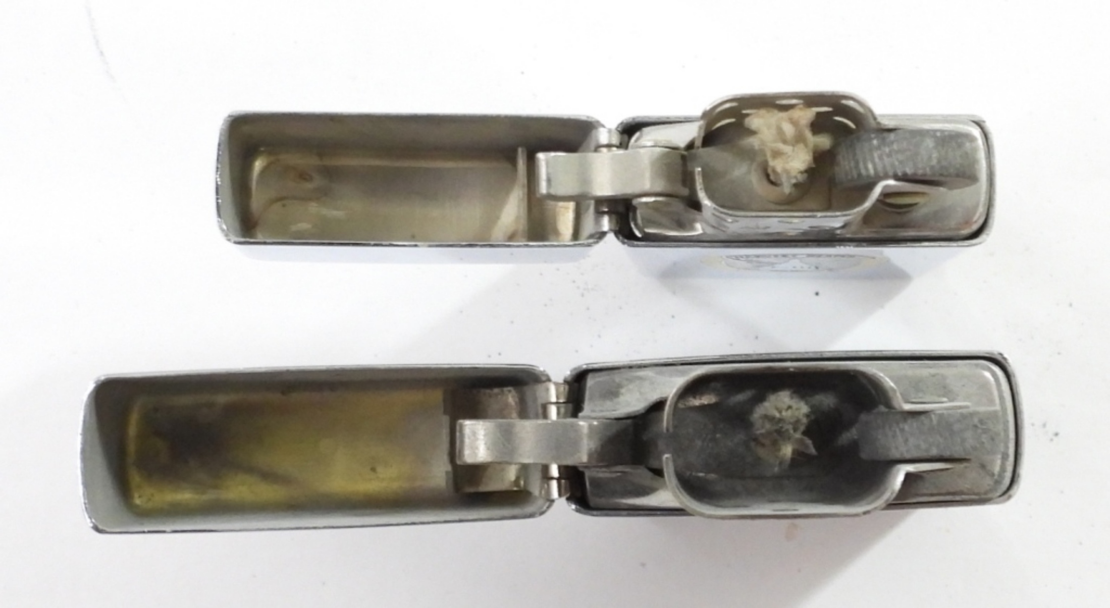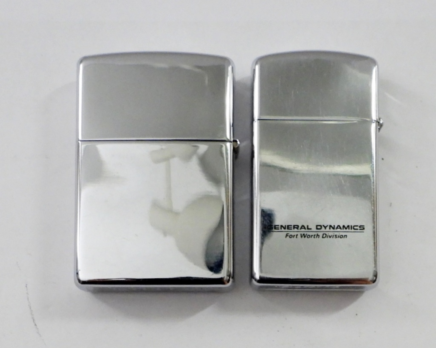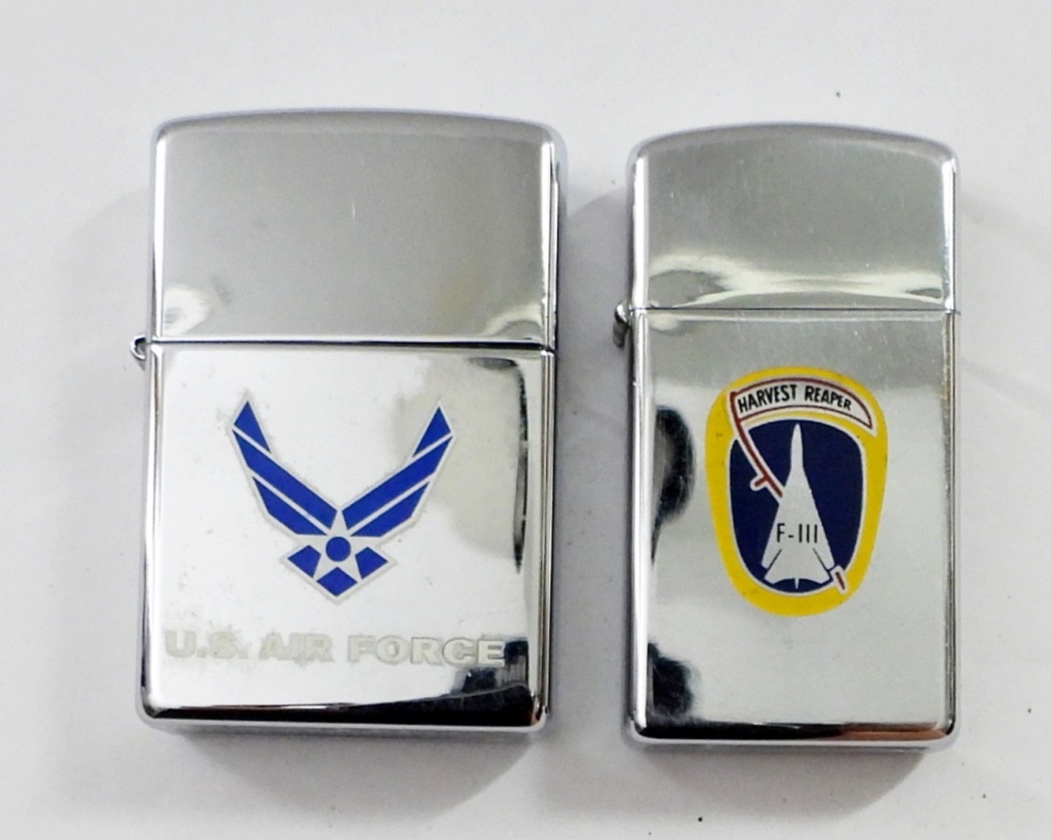 US AIR FORCE & F-111 ZIPPOS, BOTH FIRED, USAF 2002 ON SILVERTONE, 1967 SLIM F-111 “HARVEST REAPER” “GENERAL DYNAMICS FORT WORTH DIVISION” ON SILVERTONE