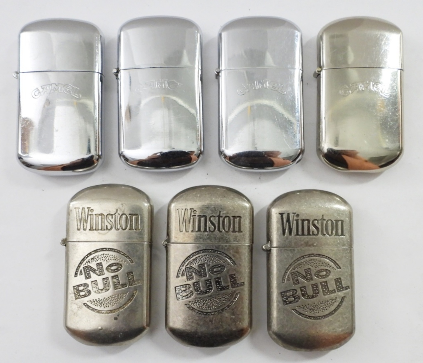 (7)CAMEL / WINSON NO BULL LIGHTERS, MIX OF FIRED AND UNFIRED, (4) SILVERTONE/CHROME “CAMEL” ROUNDED EDGES LIGHTERS, (3) “WINSTON NO BULL” SILVERTONE ROUNDED EDGES LIGHTERS