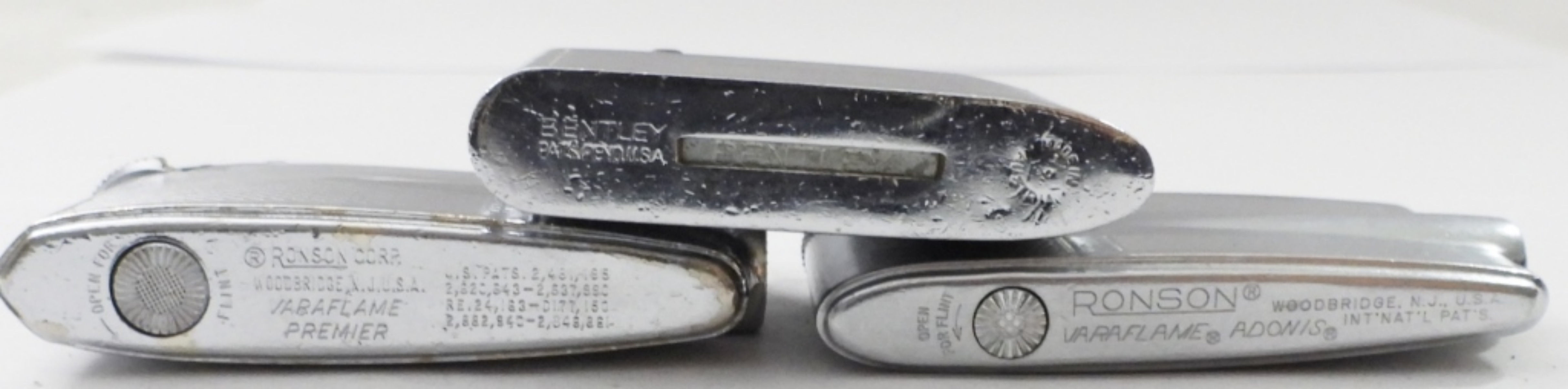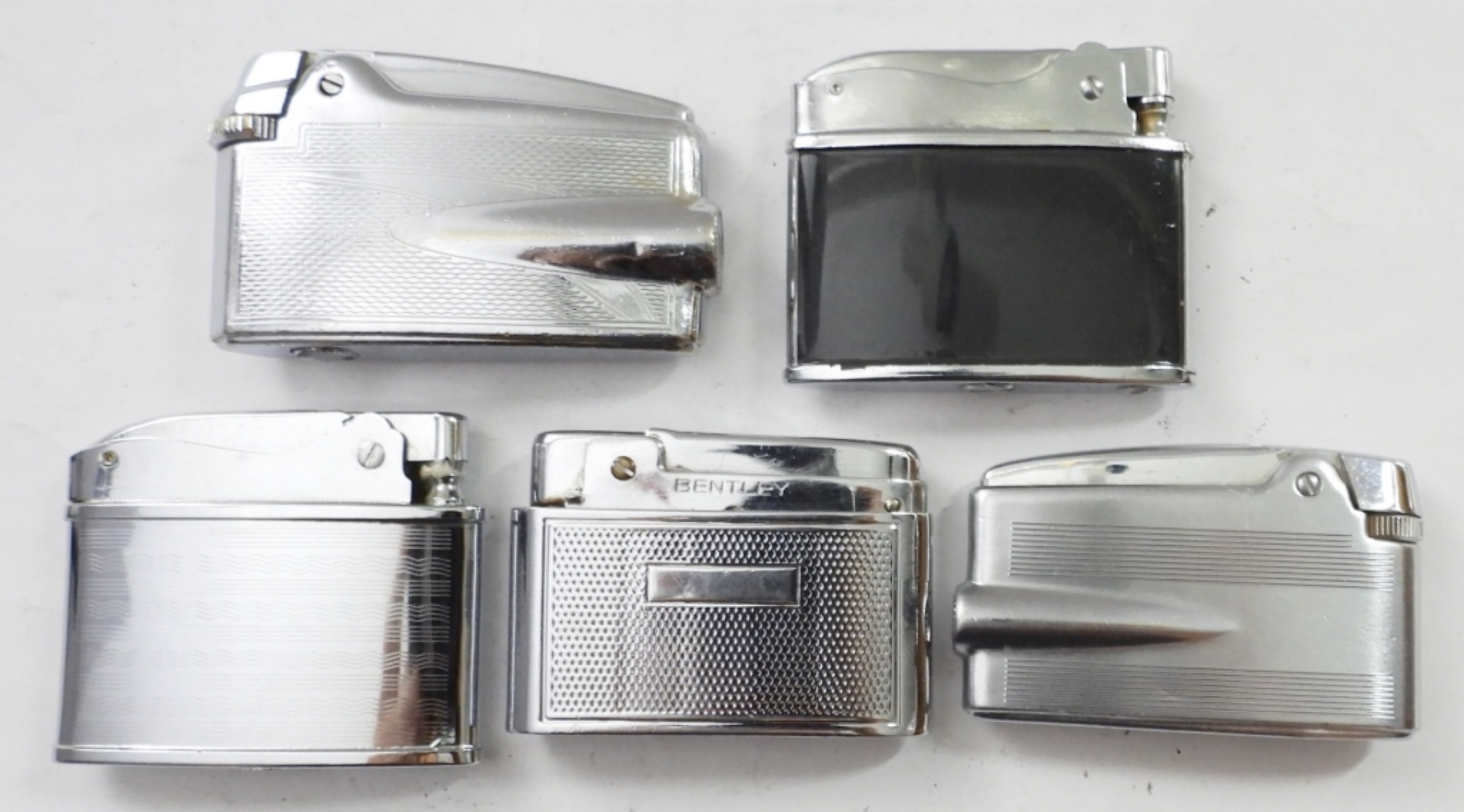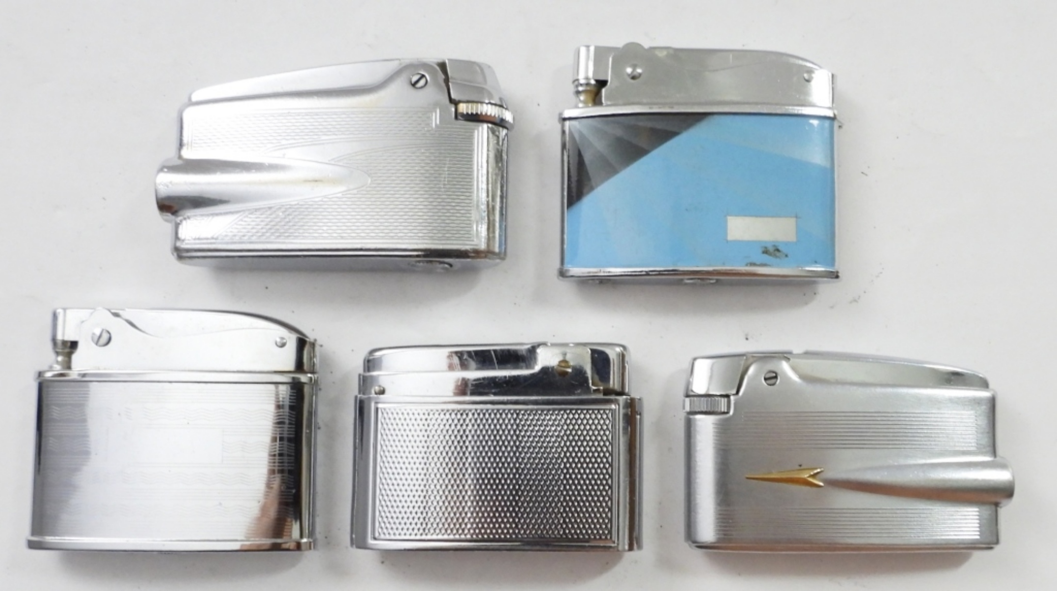 (5) VINTAGE FLAT LIGHTERS, (4) ARE SILVERTONE , (1) IS BLUE/BLACK, MIX OF FIRED AND UNFIRED