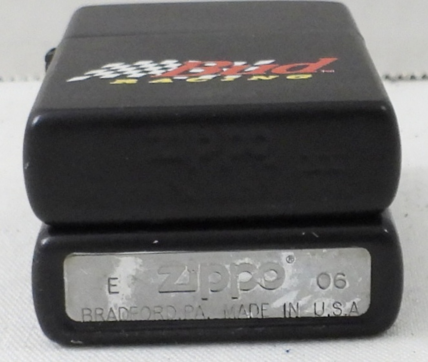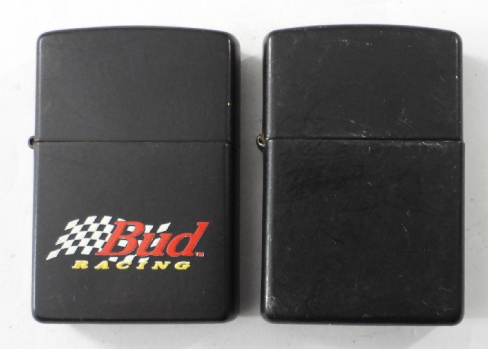 (2) FIRED BLACK MATTE ZIPPPO LIGHTERS .1999 BUD LIGHT RACING &2006 SOLID BLACK LIGHTERS.