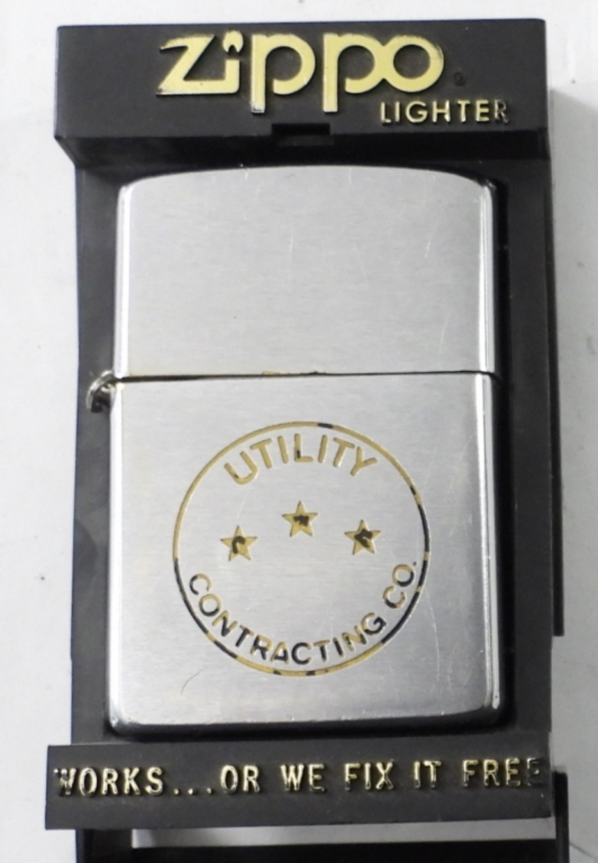 1975 FIRED CHROME ENGRAVED ZIPPO ( UTILITY CONTRACTING CO) IN CASE