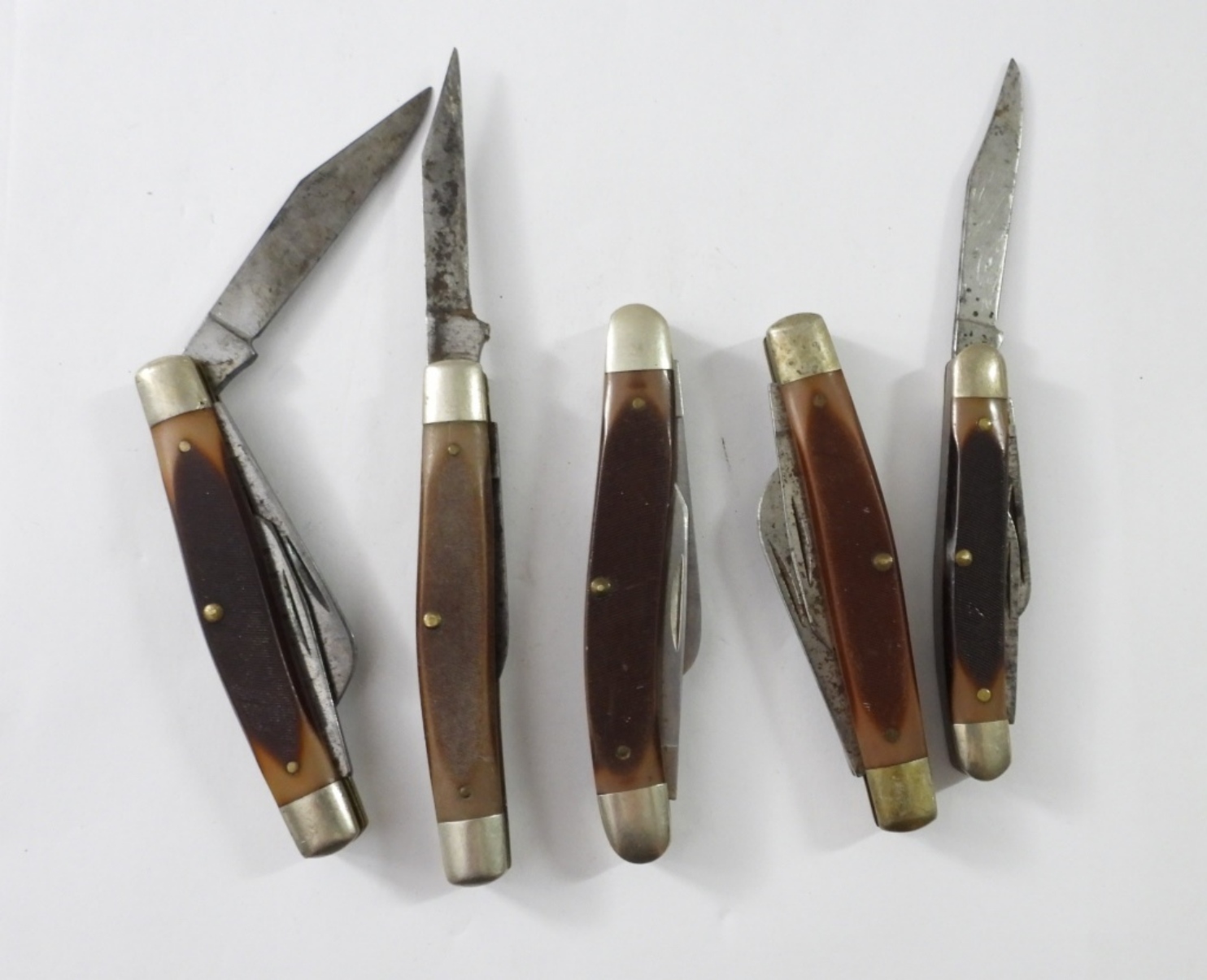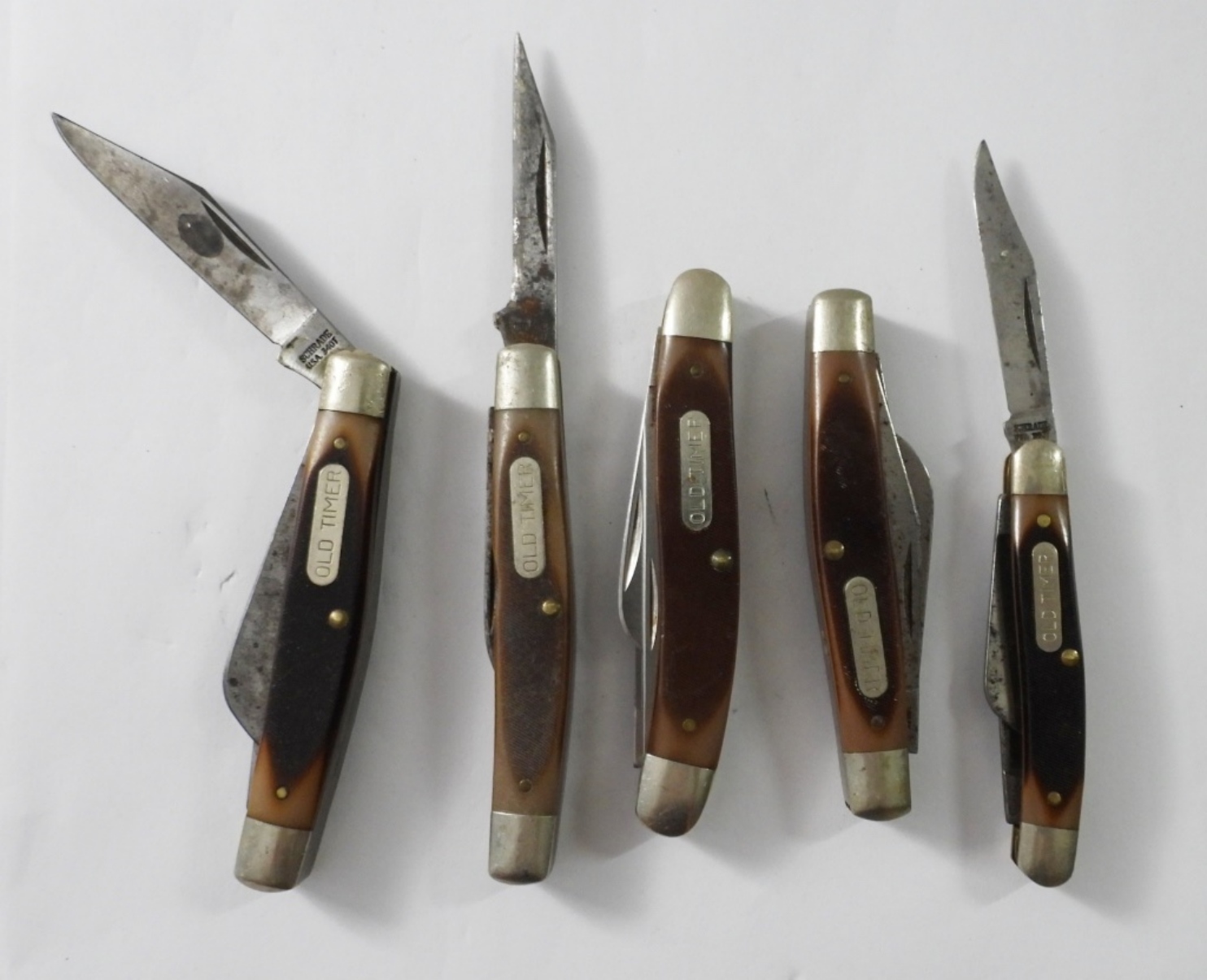 (5) OLD TIMER 2 OR 3 BLADE KNIVES, (4) THREE BLADE (1) TWO BLADE, BROWN FINISH