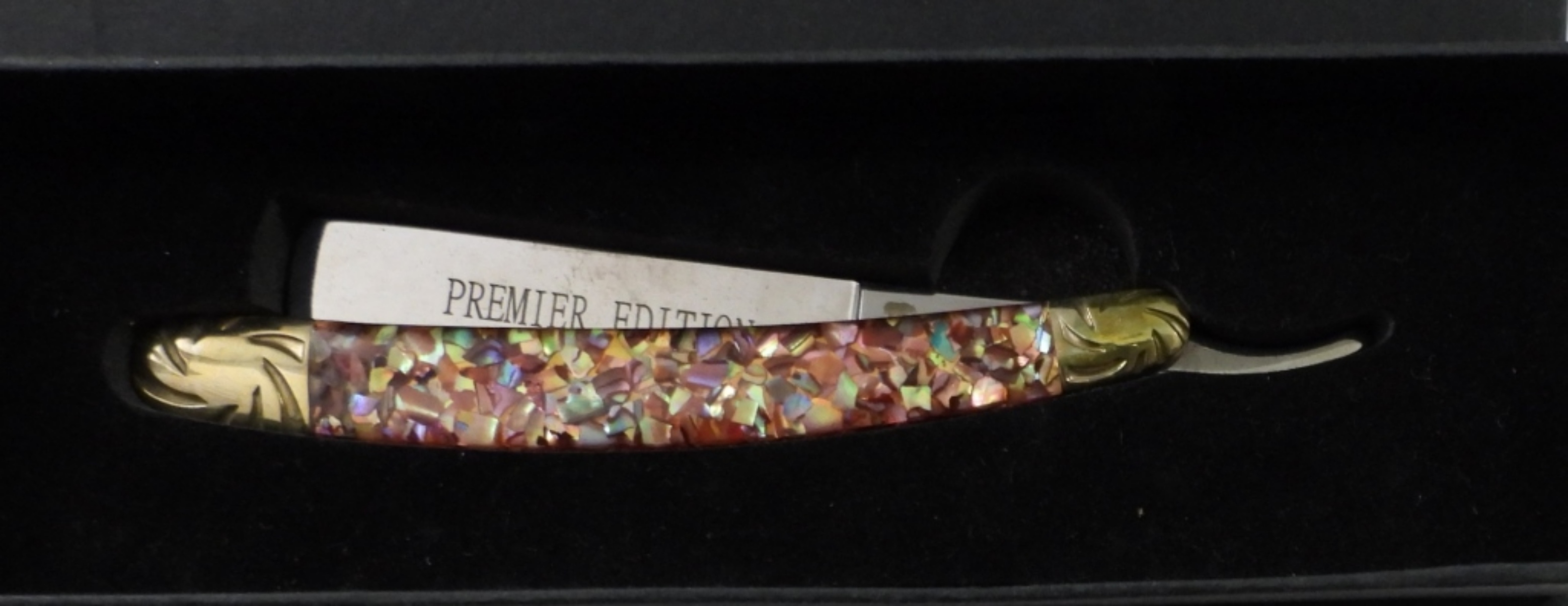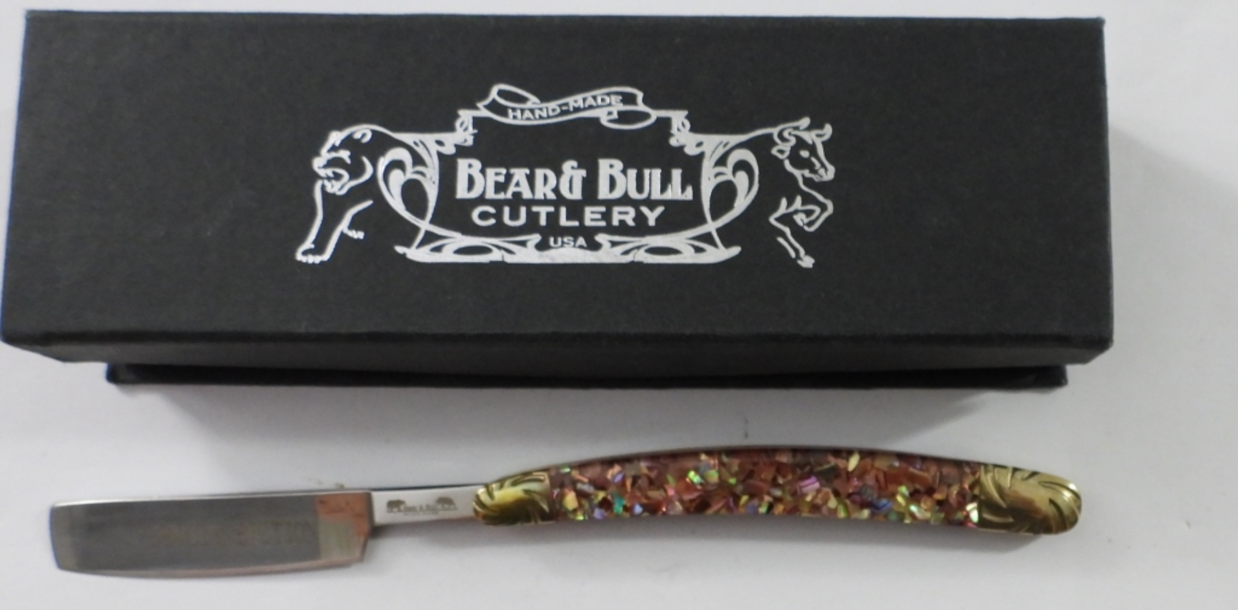 BEAR&BULL HAND-MADE RAZOR W ORIGINAL BOX, PREMIER EDITION, CRUSHED RED ABALONE HANDLE STRAIGHT RAZOR