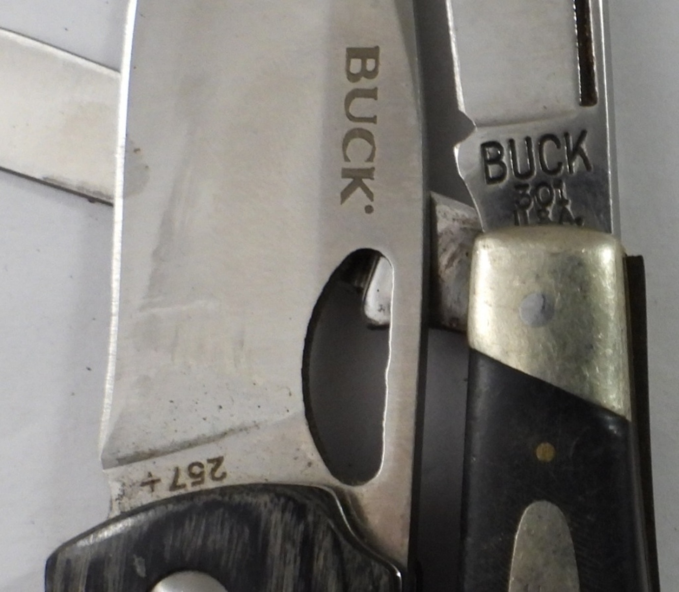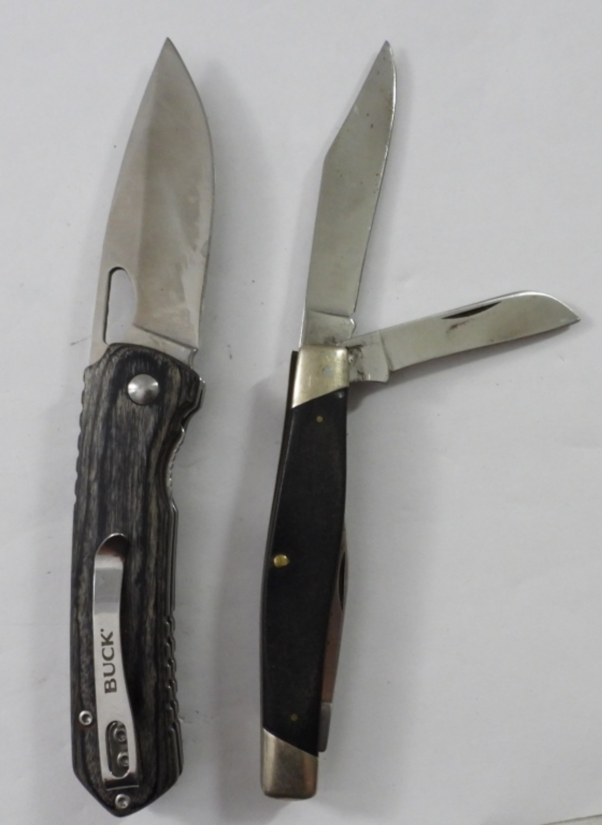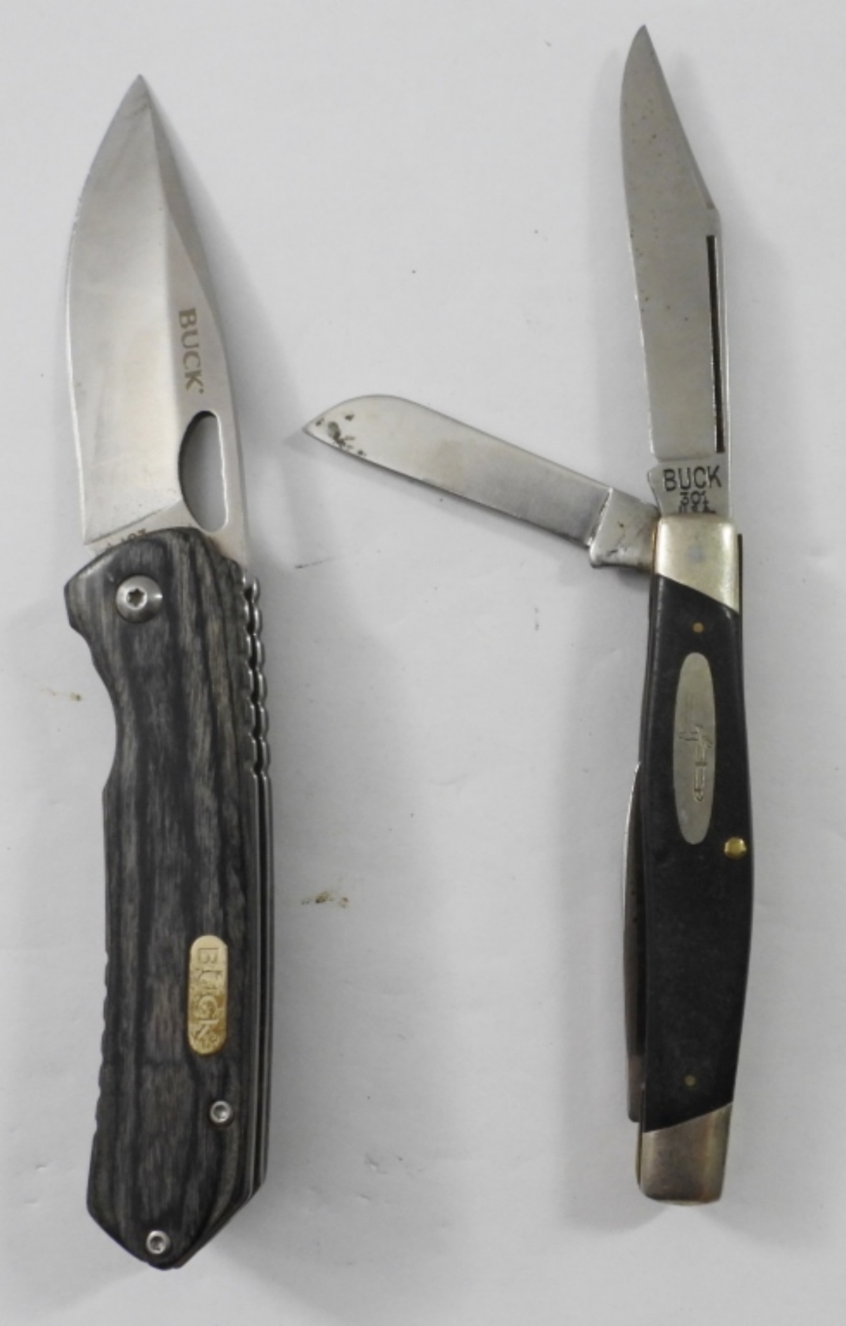 (2) BUCK BRAND POCKET KNIVES, 301 THREE BLADE PRE 1986 BLACK HANDLE, 257 SINGLE BLADE MADE IN 2021 GOOD CONDITION GRAY WOODGRAIN STYLE HANDLE