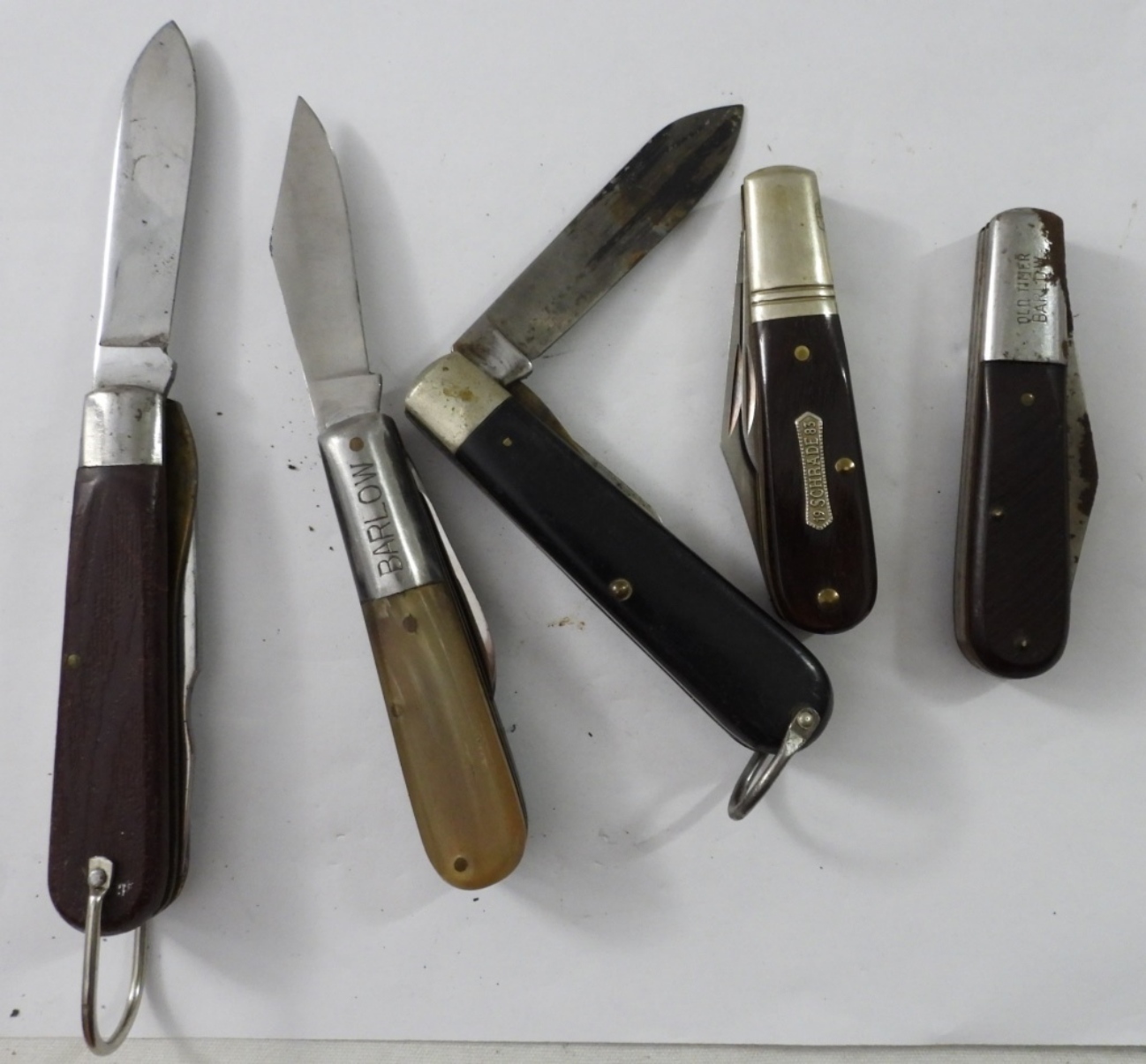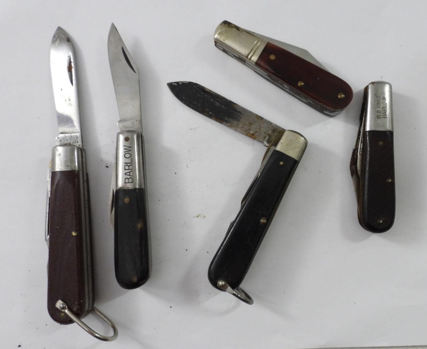 (5) BARLOW STYLE POCKET KNIVES, CAMILLUS, KLEIN TOOLS, OLD TIMER, SCHRADE, & UNKNOWN BRAND. WORN TO GOOD CONDITION