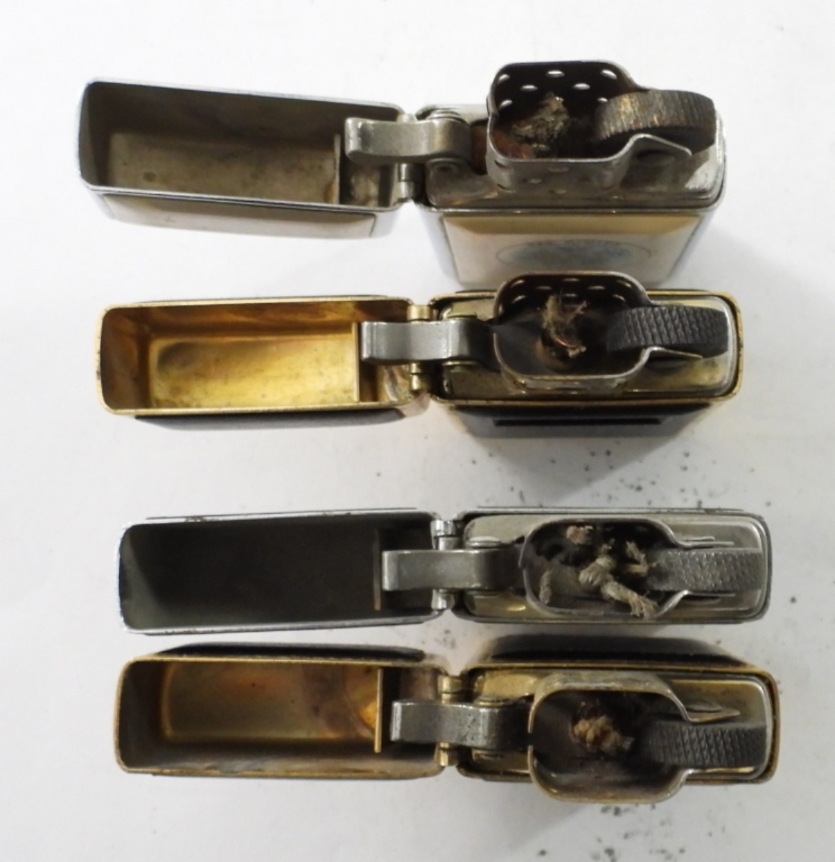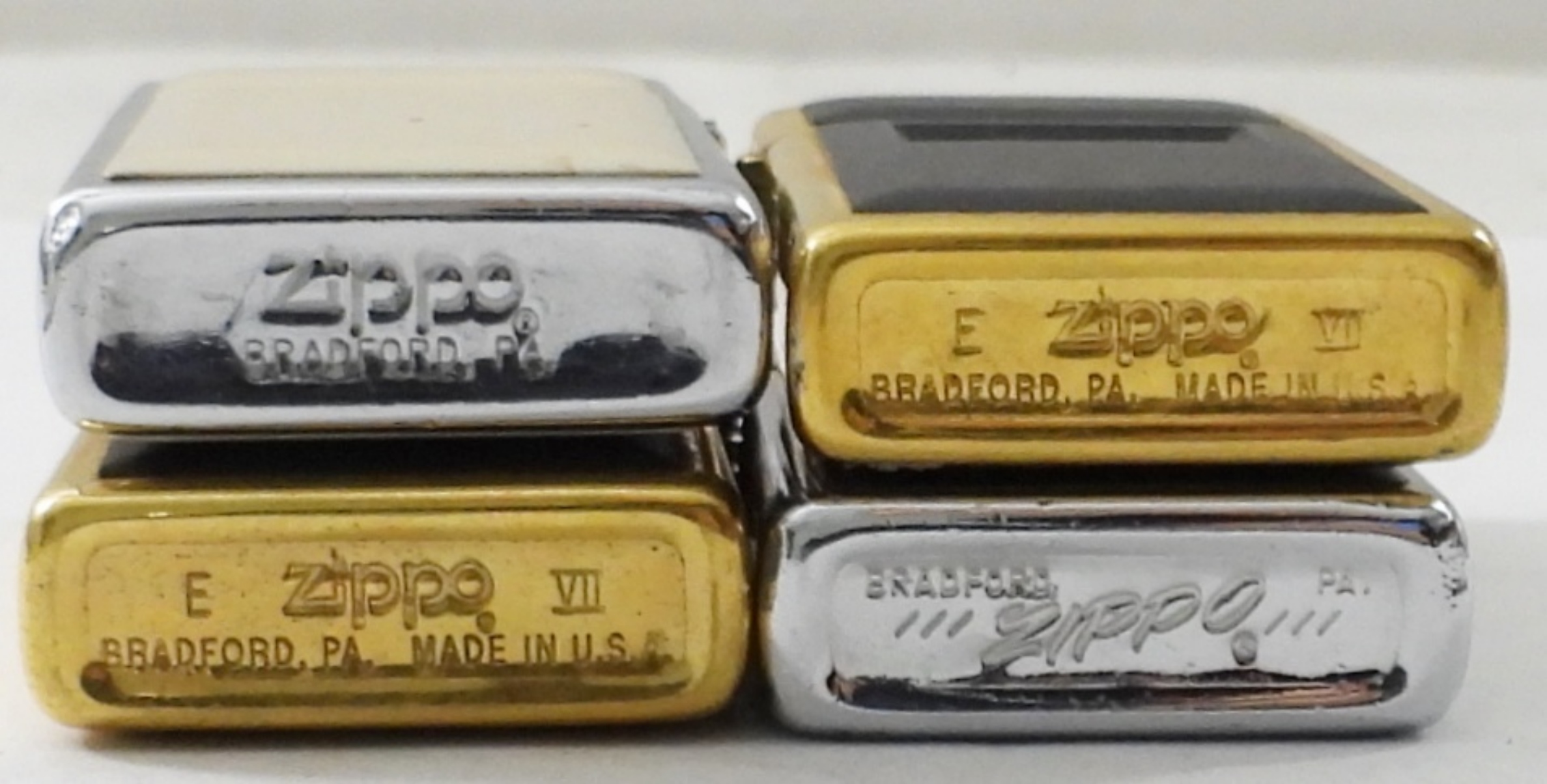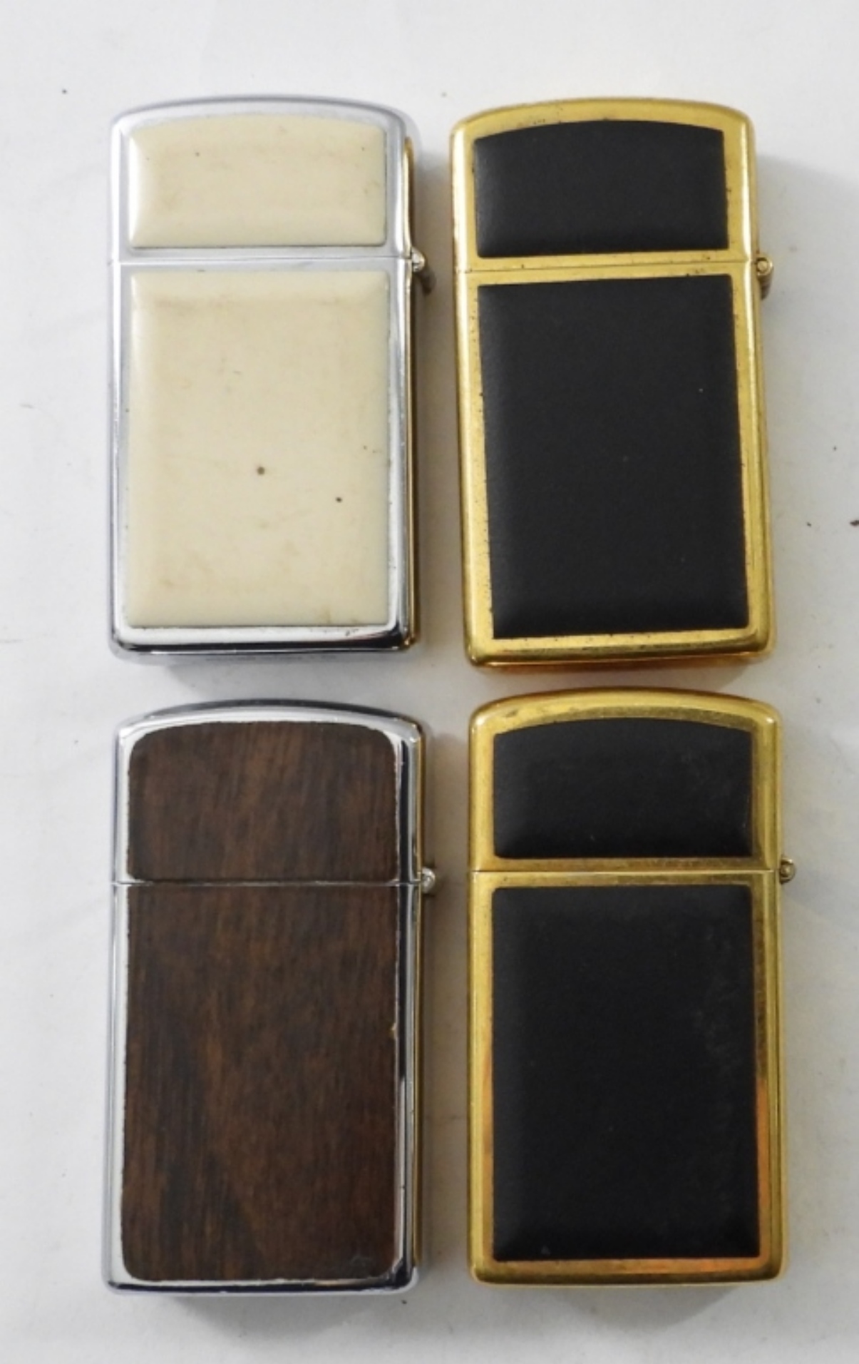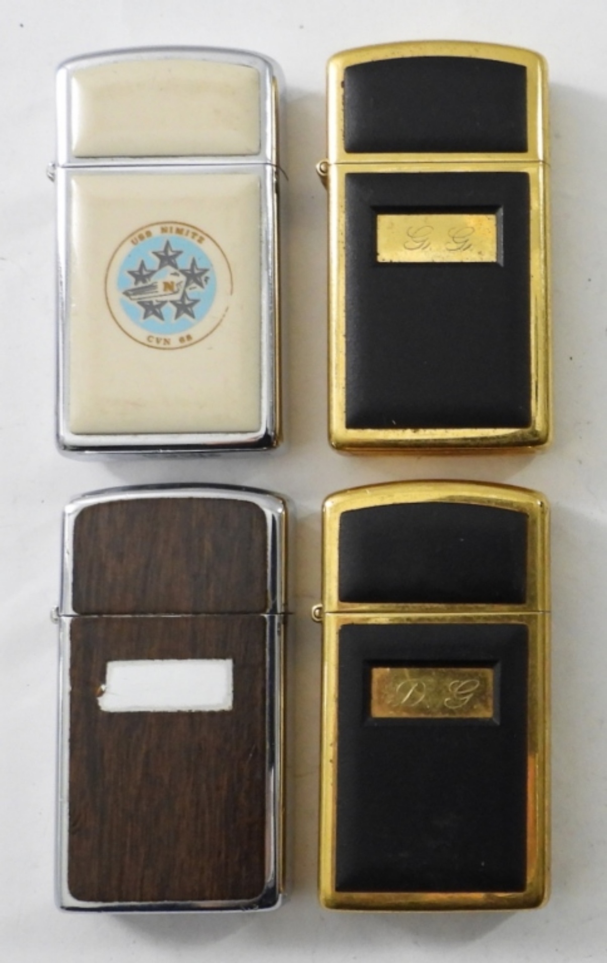 (4) FIRED VINTAGE SLIM ZIPPO LIGHTERS,( 2) 1991 BRASS WITH BLACK ENAMEL, 1976 CHROME /WHITE ENAMEL ( USS NIMITZ CVN 68), 1976 WOOD GRAIN CHROME SLIM ZIPPO LIGHTER