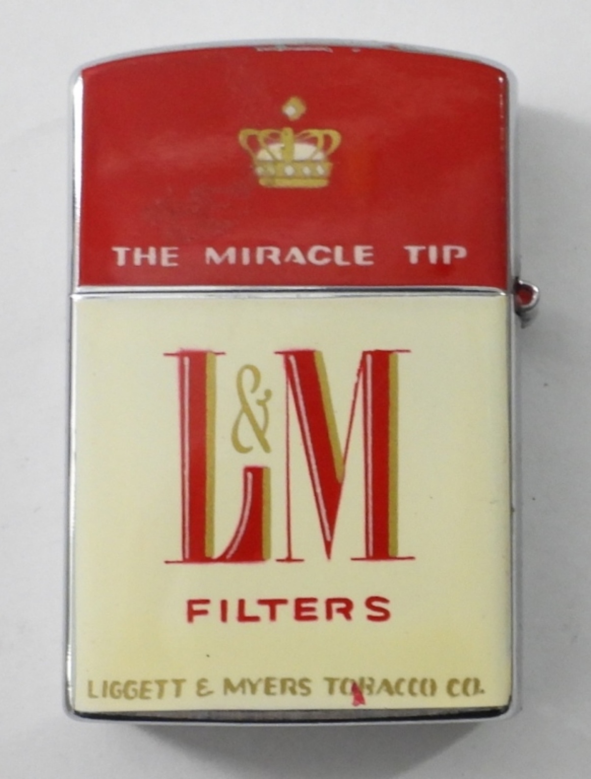 L&M CONTINENTAL UNFIRED LIGHTER IN ORIGINAL BOX, L&M CIGARETTE ADVERTIZING, INSTRUCTIONS STILL IN BOX, TOP COVER OF BOX TORN BOTTOM CORNERS
