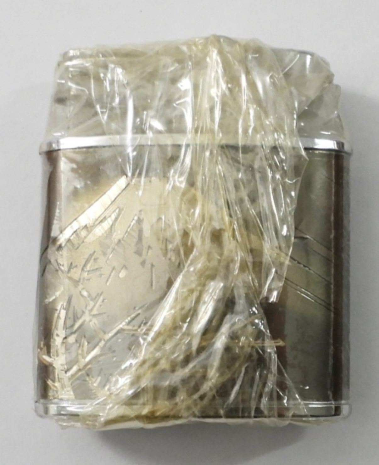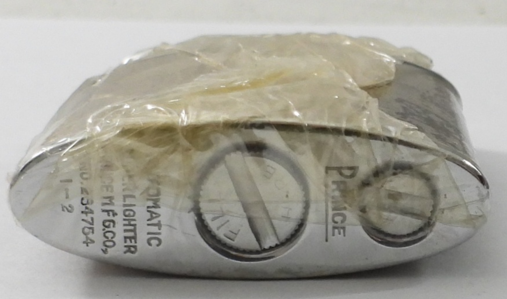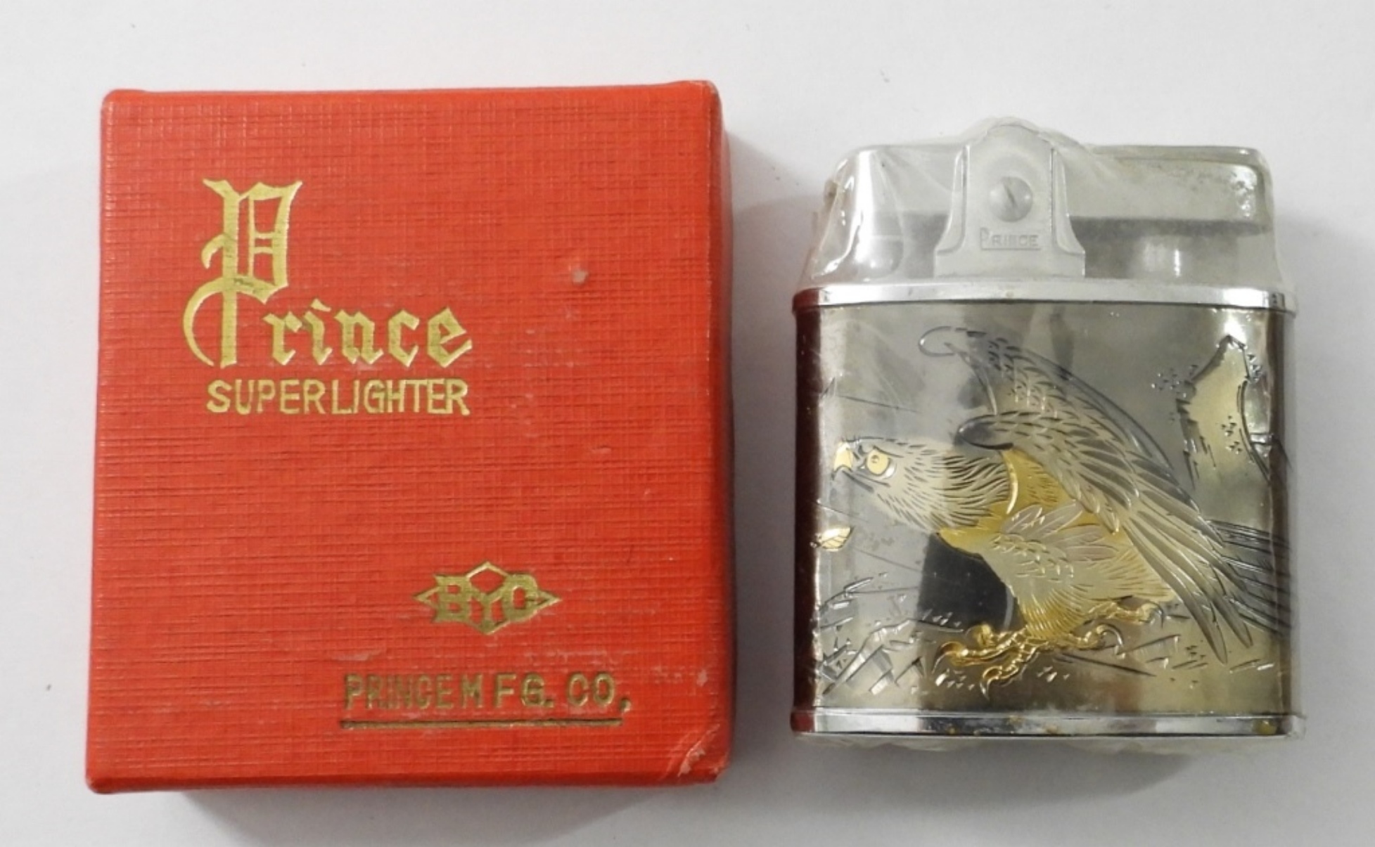 PRINCE SUPER LIGHTER IN BOX STILL IN PLASTIC WRAP, UNFIRED, HAWK AND MOUNTAIN JAPANESE STYLE ENGRAVING, BOX IN GOOD CONDITION VERY LITTLE WEAR