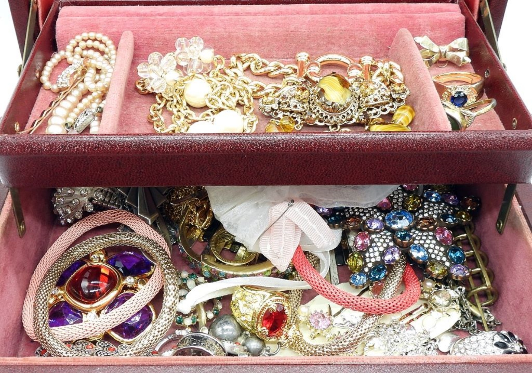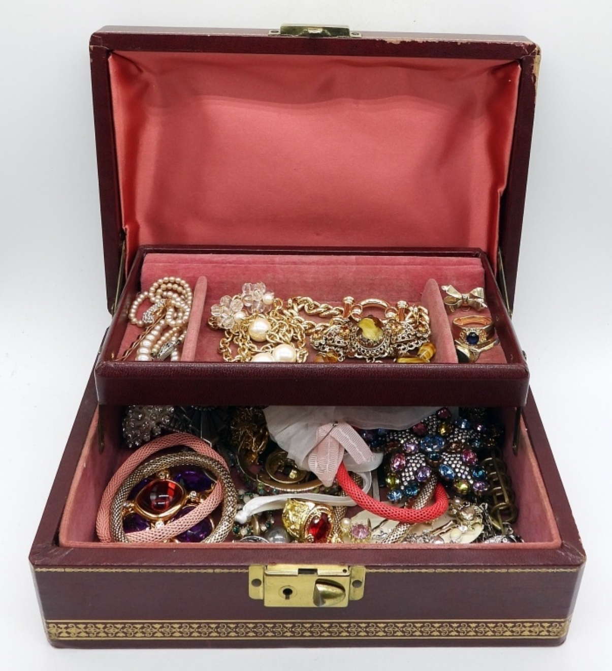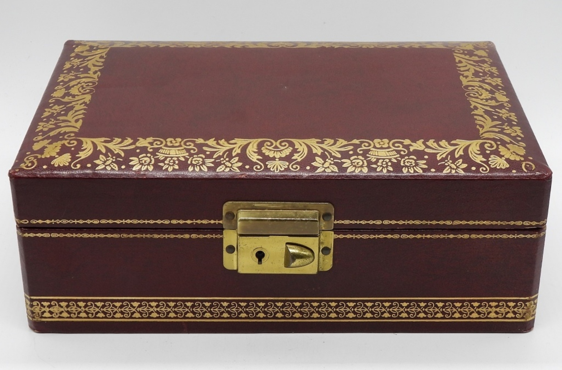 PRETTY BURGUNDY AND GOLD VINTAGE JEWELRY BOX. FULL OF FUN JEWELRY. LOCKING FRONT, IT DOES LATCH SECURELY BUT THERE IS NO KEY TO LOCK IT. 8.5″ x 6″. 3″ TALL.