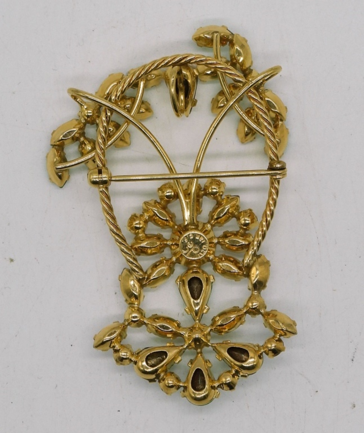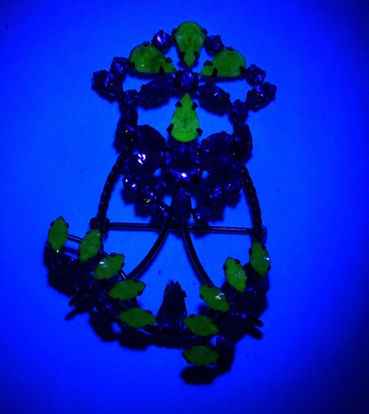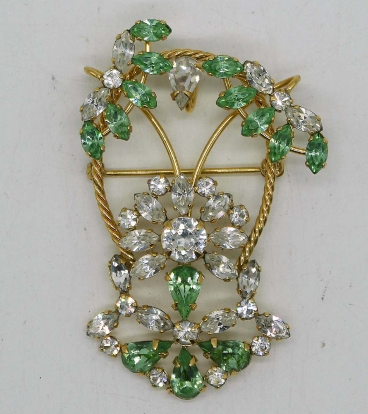 VINTAGE URANIUM GLASS GREEN GEMSTONE BROOCH, GOLD TONE. 2″.