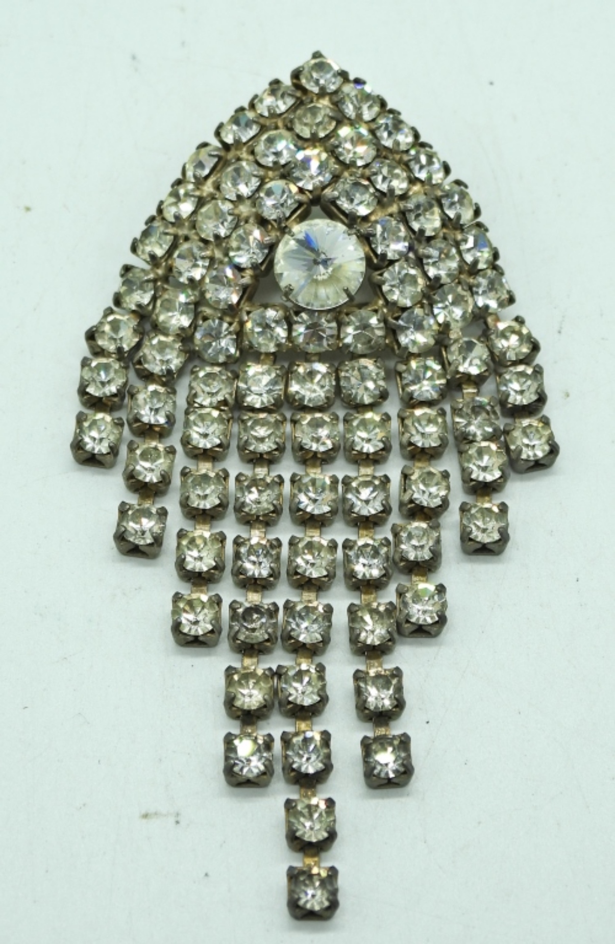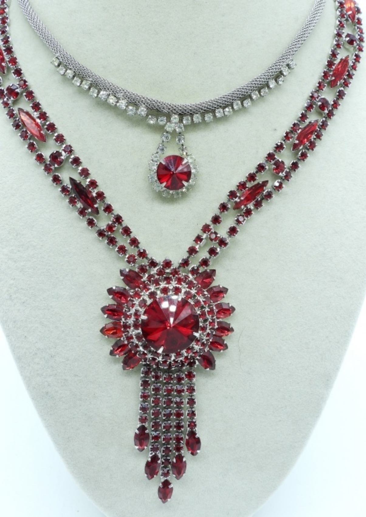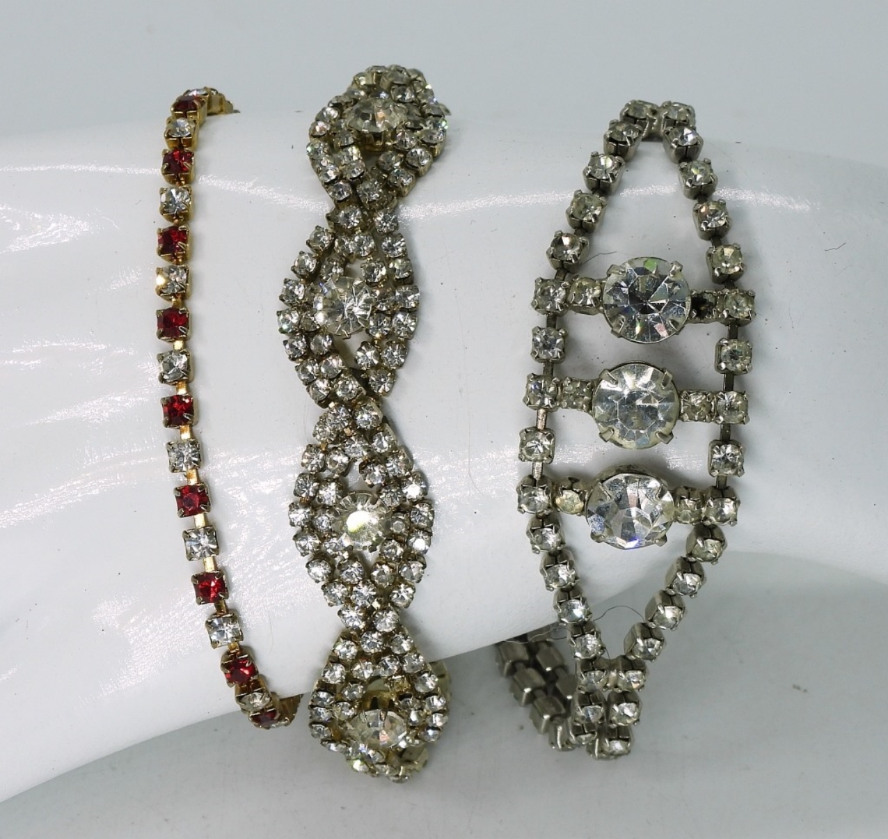 TWO VINTAGE RED AND WHITE RHINESTONE NECKLACES, 15 & 18″. THREE VINTAGE BRACELETS, RED & WHITE RHINESTONES 7-10″ & A WHITE RHINESTONE VTG BROOCH.