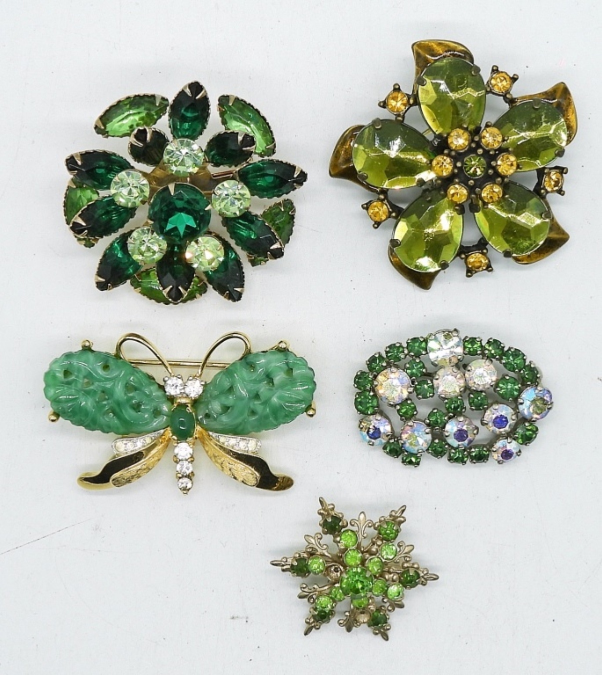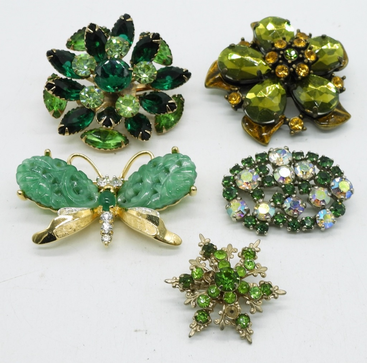 FIVE VINTAGE GREEN RHINESTONE AND GEMSTONE BROCOHES
